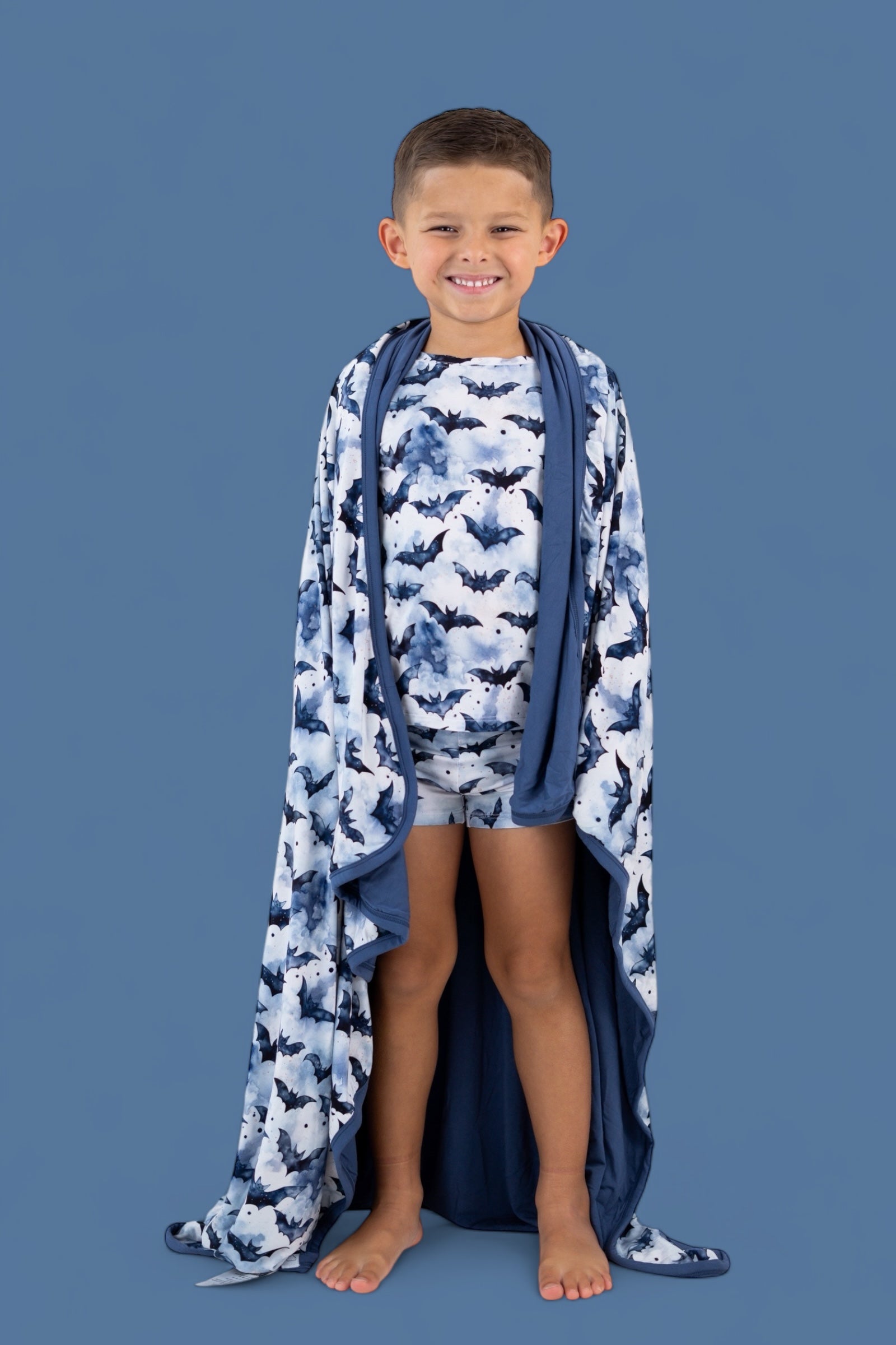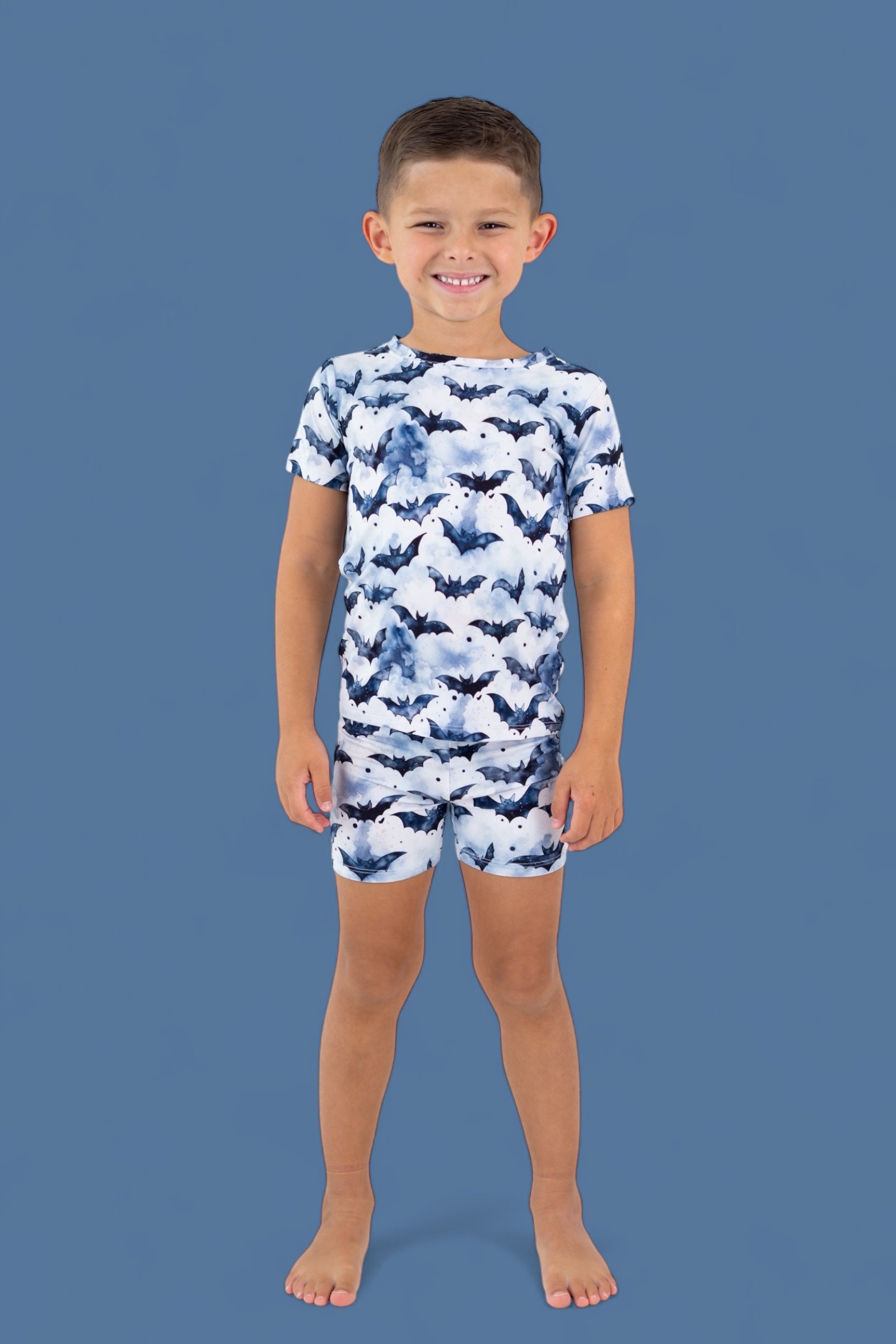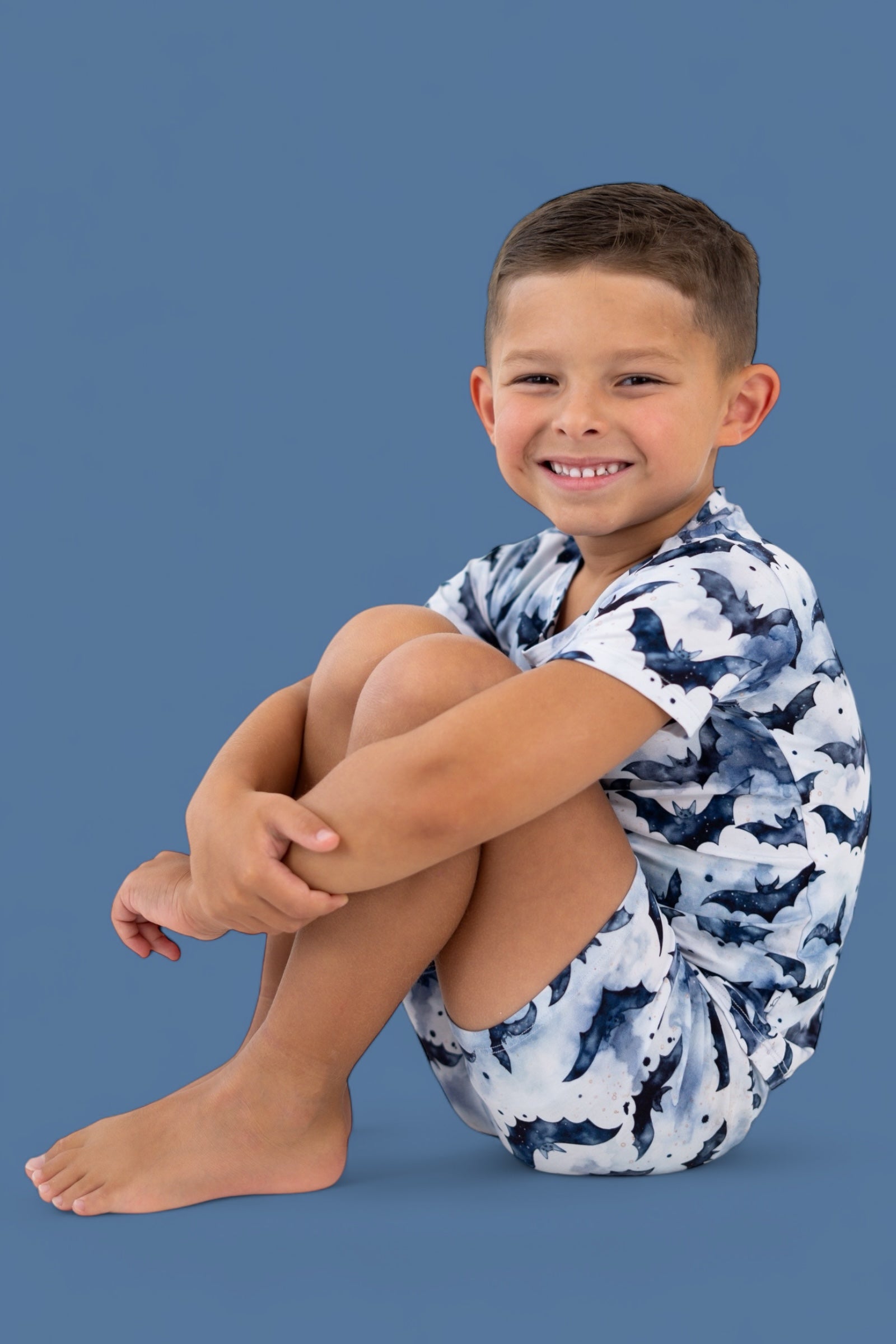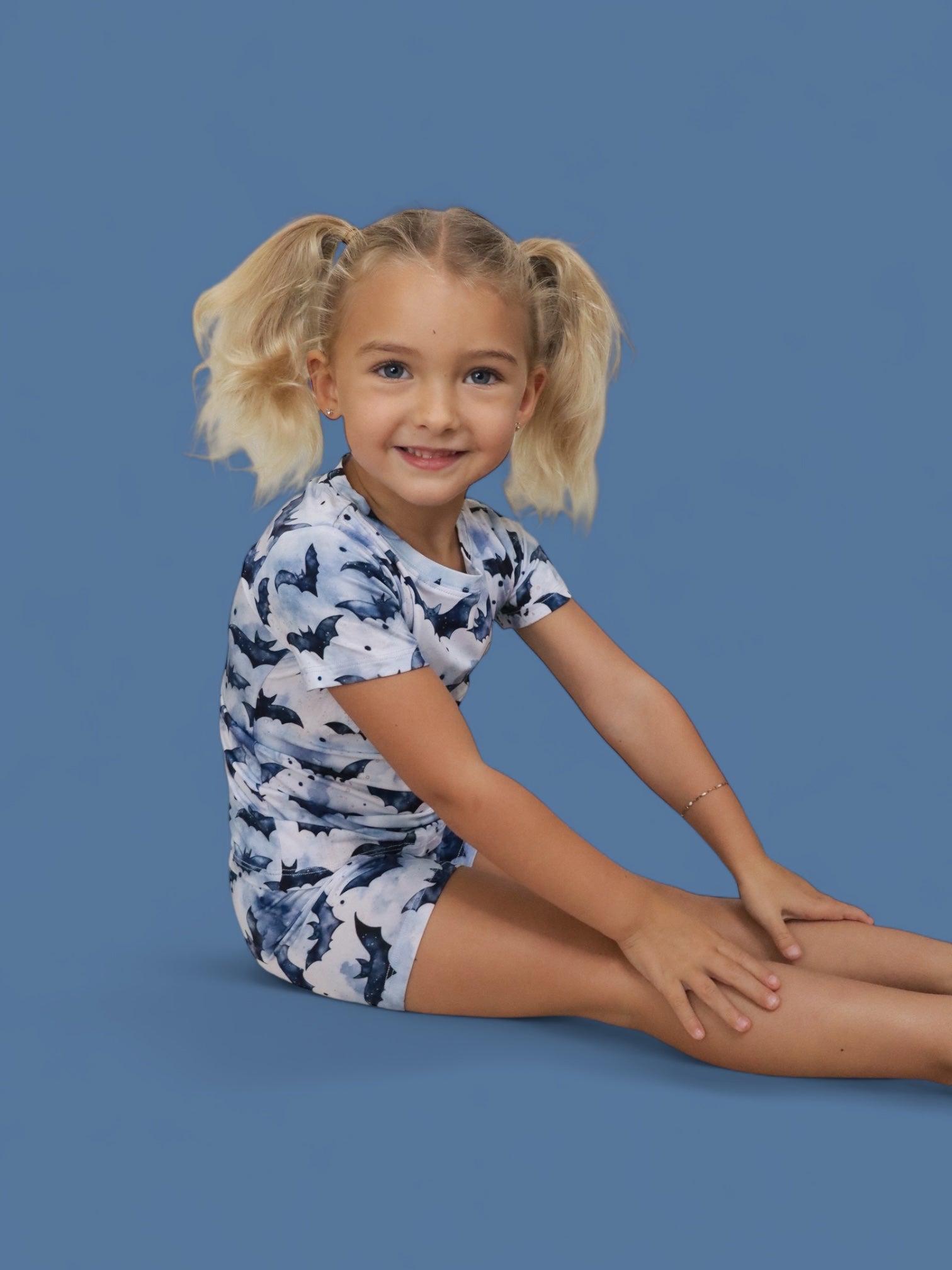 Soar into spooky season with the Midnight Flyers Dream Short Set! Featuring graceful watercolor bats gliding across a starlit sky, this two-piece set includes a buttery-soft short sleeve top and matching shorts—perfect for warm autumn nights, movie marathons, and magical bedtime stories. It’s moody, comfy, and made for little night flyers.