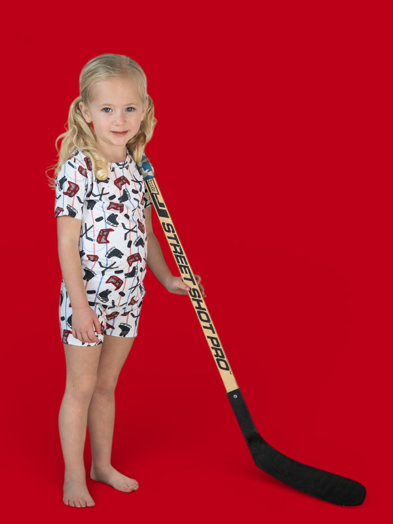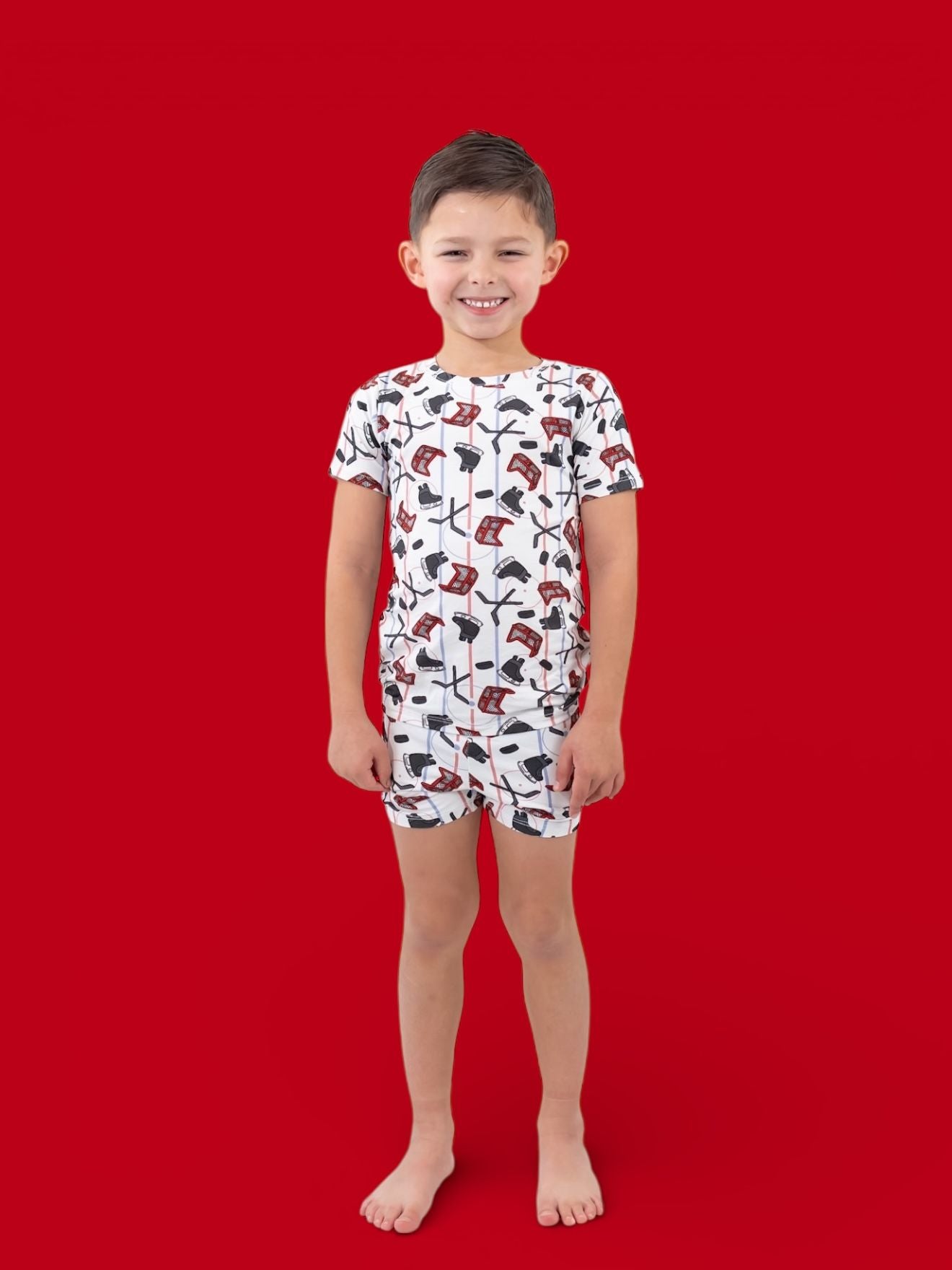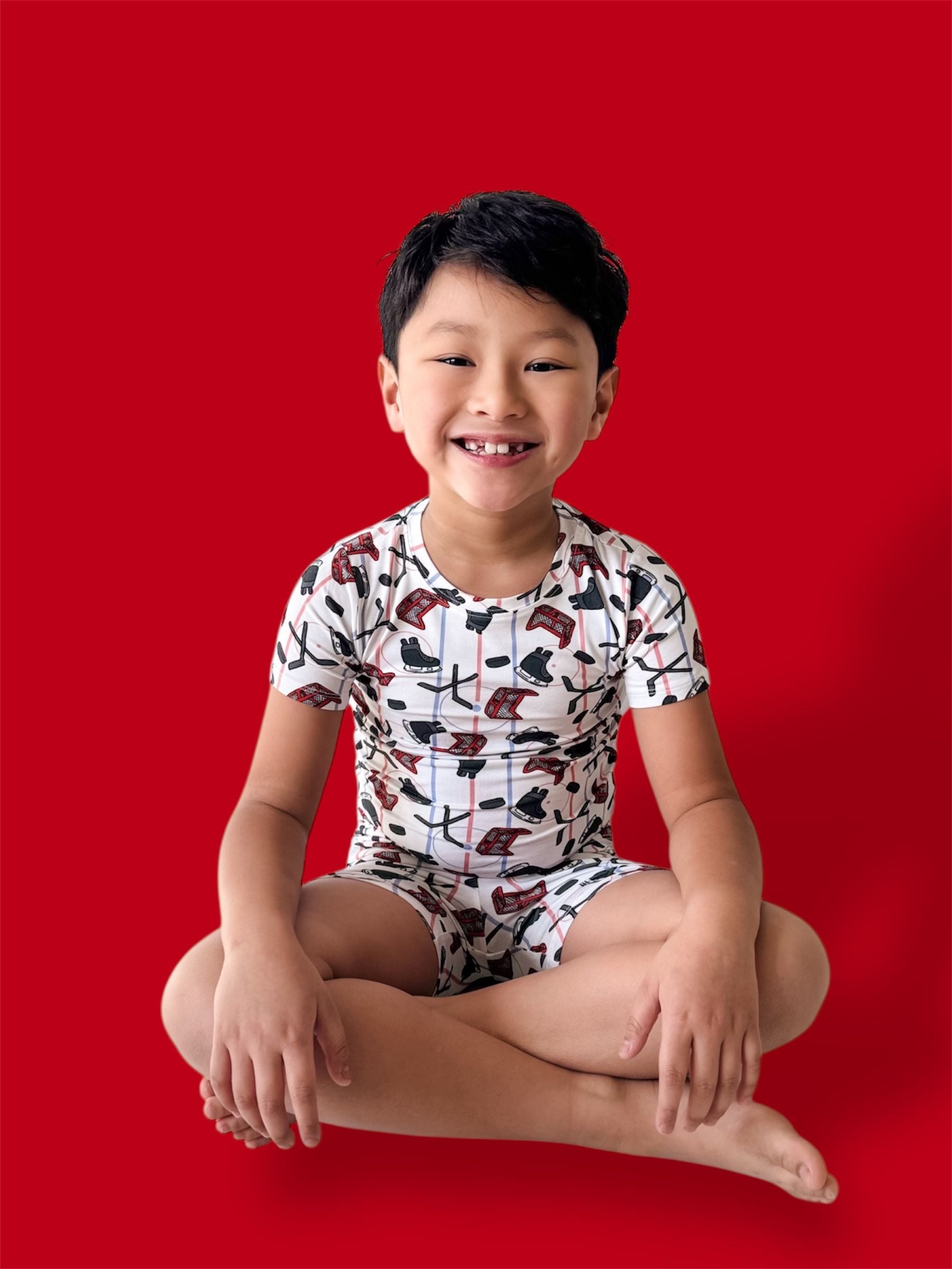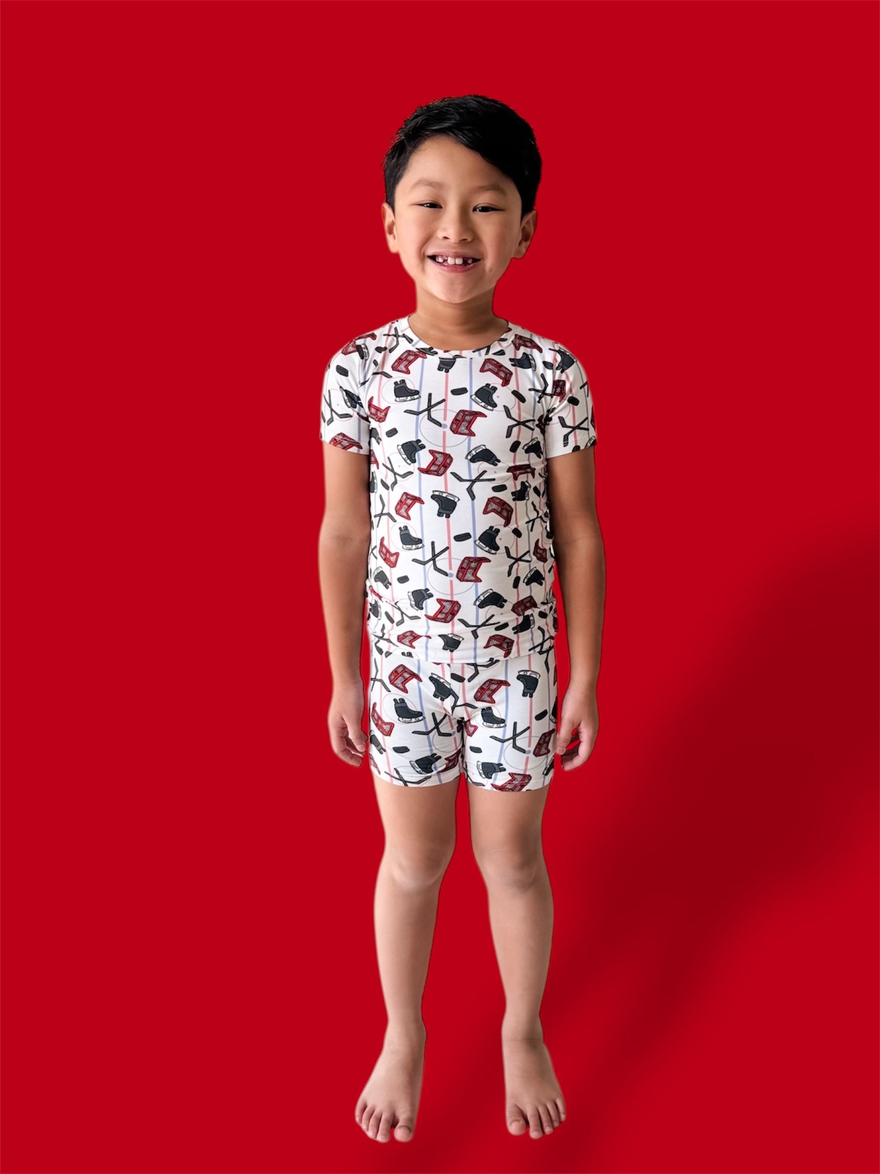 Ready, set, SCORE! This sporty short set is covered in skates, sticks, pucks & nets on our signature buttery-soft, super stretchy fabric. The perfect warm-weather fit for playtime, lounge time, and little all-stars on the move! 🥅💙