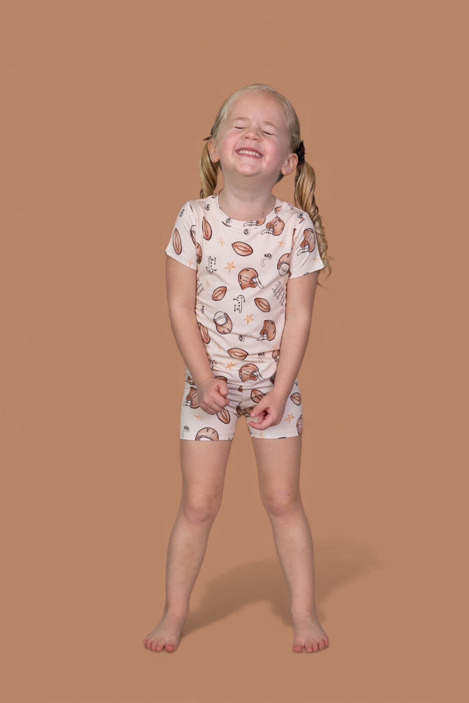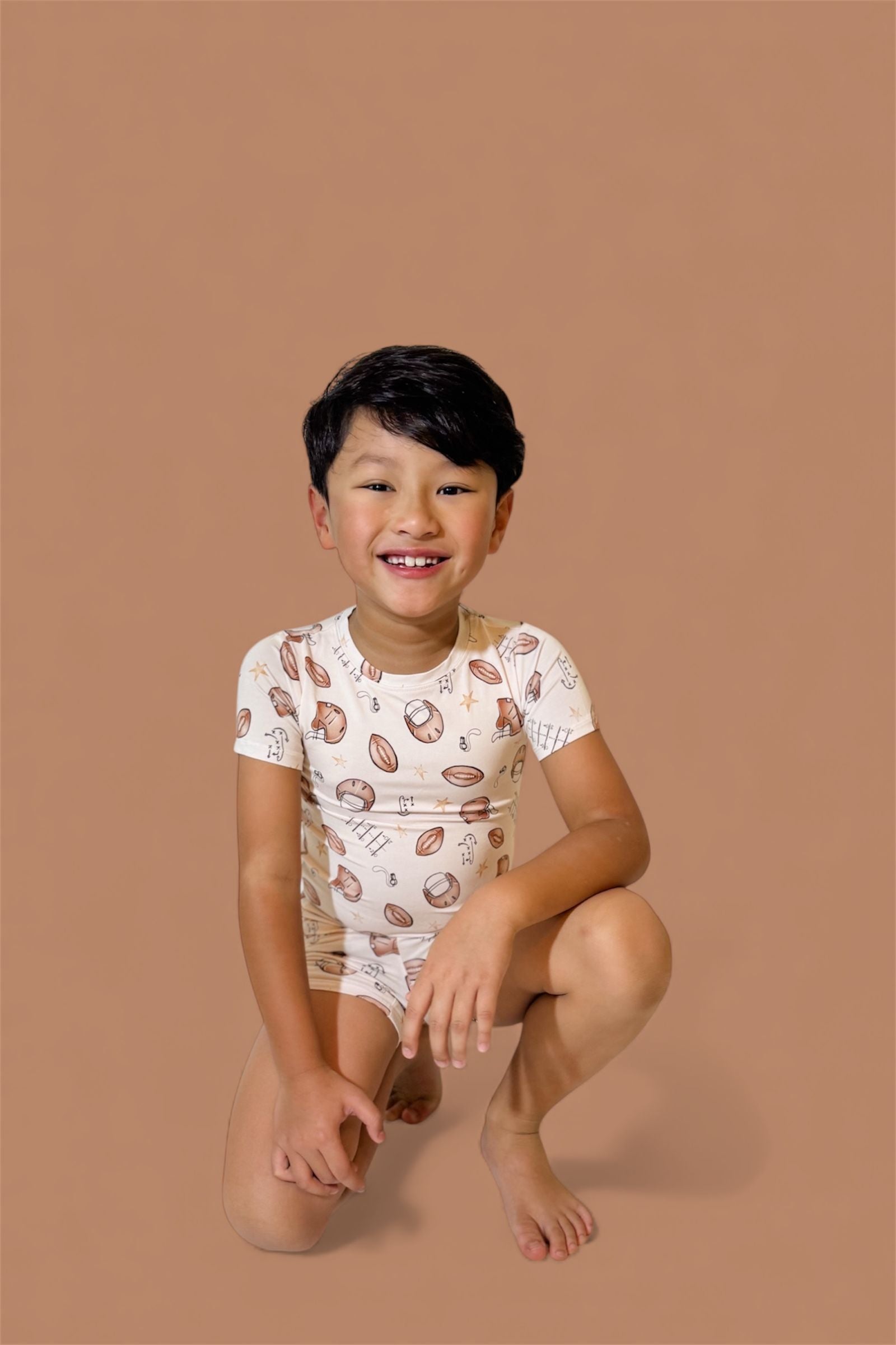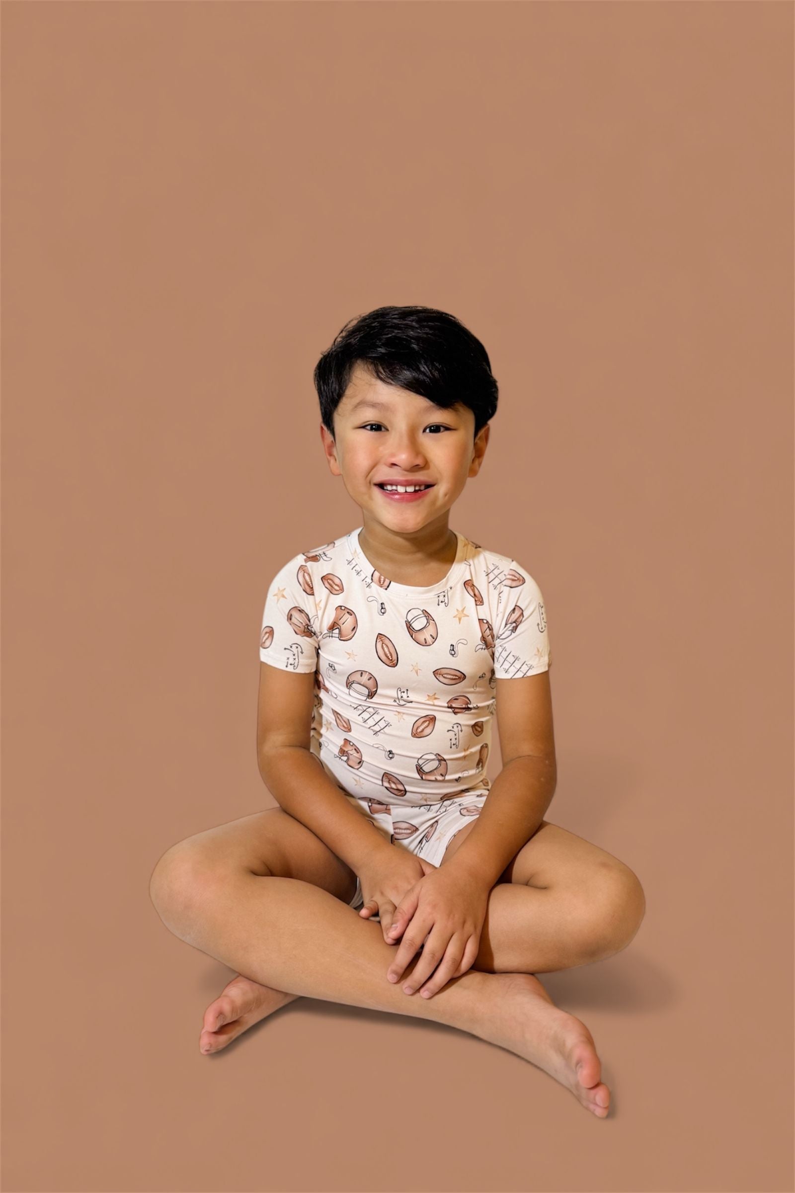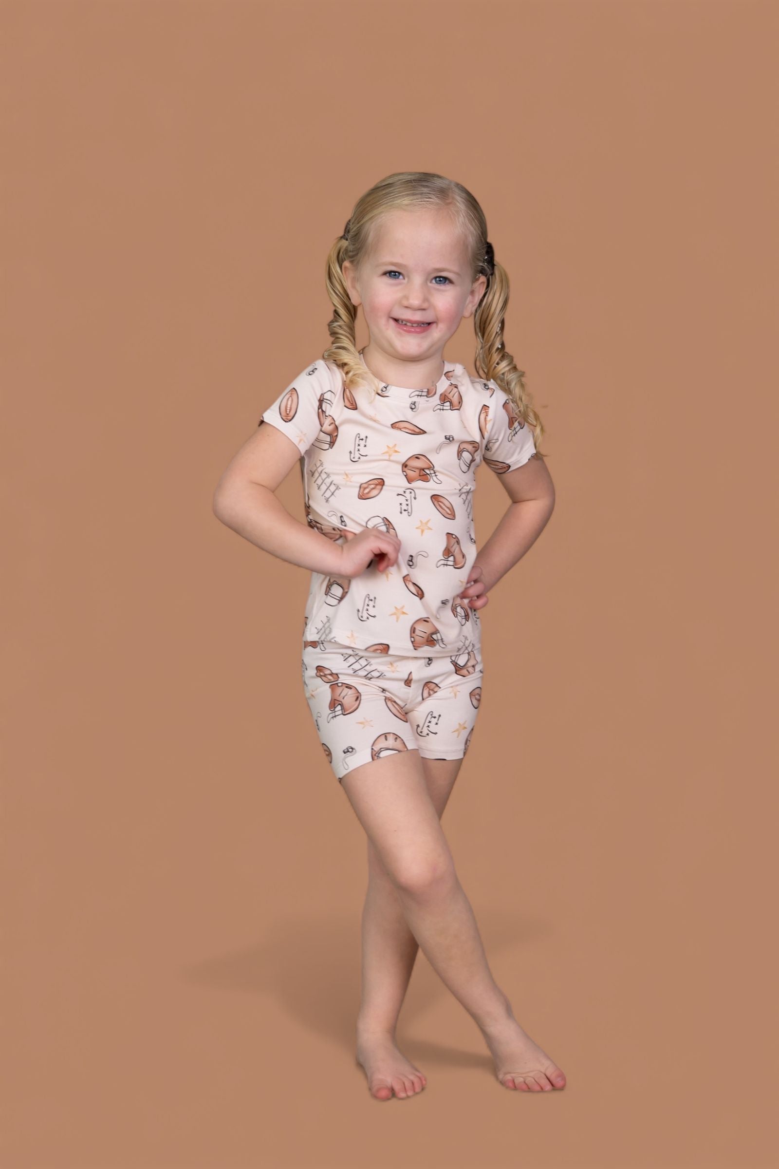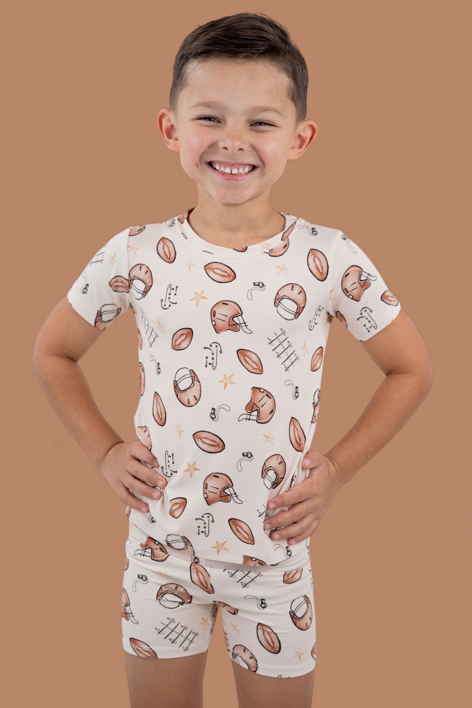 Cool, comfy, and game-day ready! The Tiny Touchdown Dream Short Set is crafted from our signature buttery-soft bamboo fabric in a playful football, helmet, and star print. With a short-sleeve top and matching shorts, this set is perfect for warm-weather cheering, backyard play, or cozy lounging.