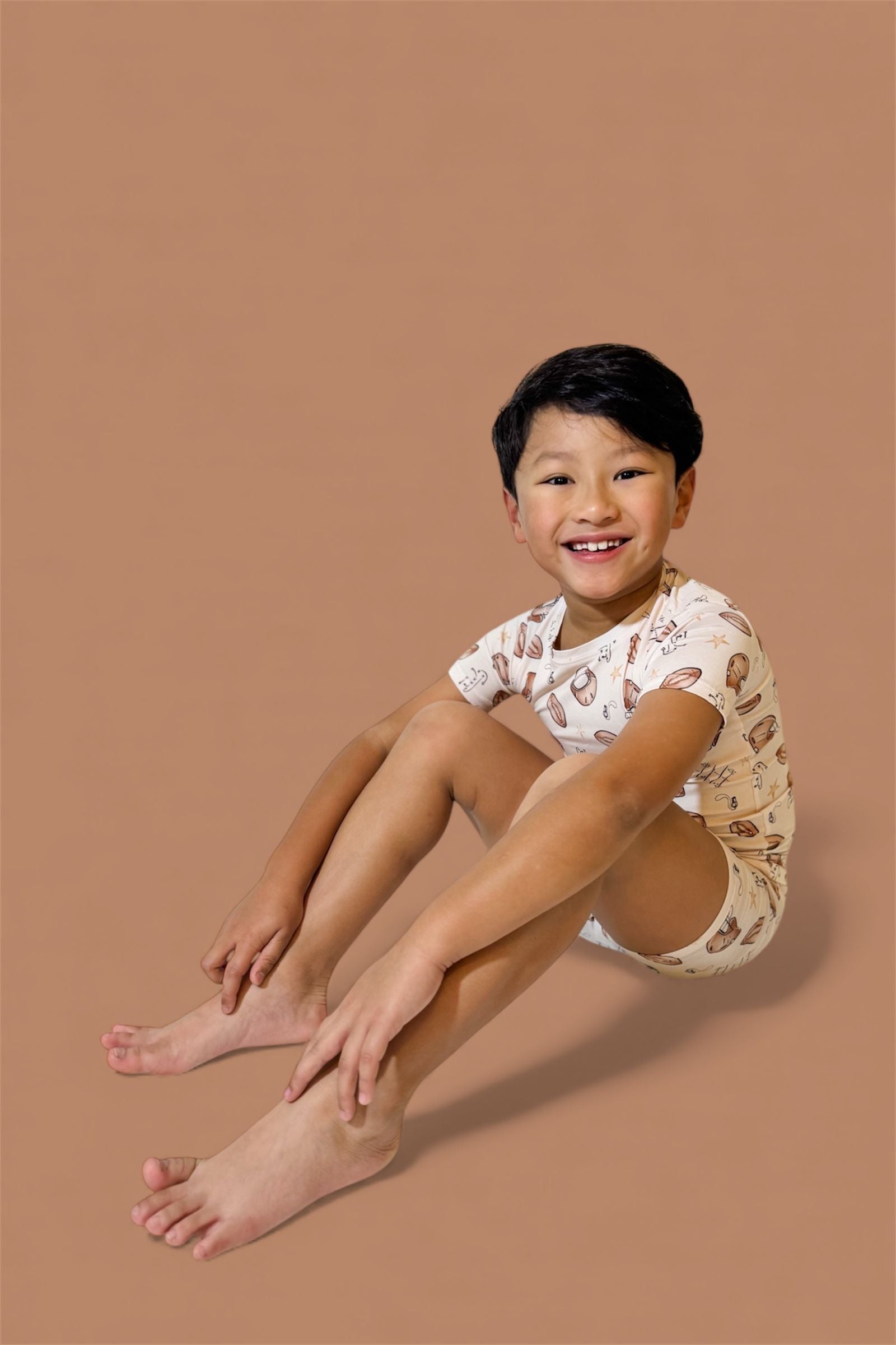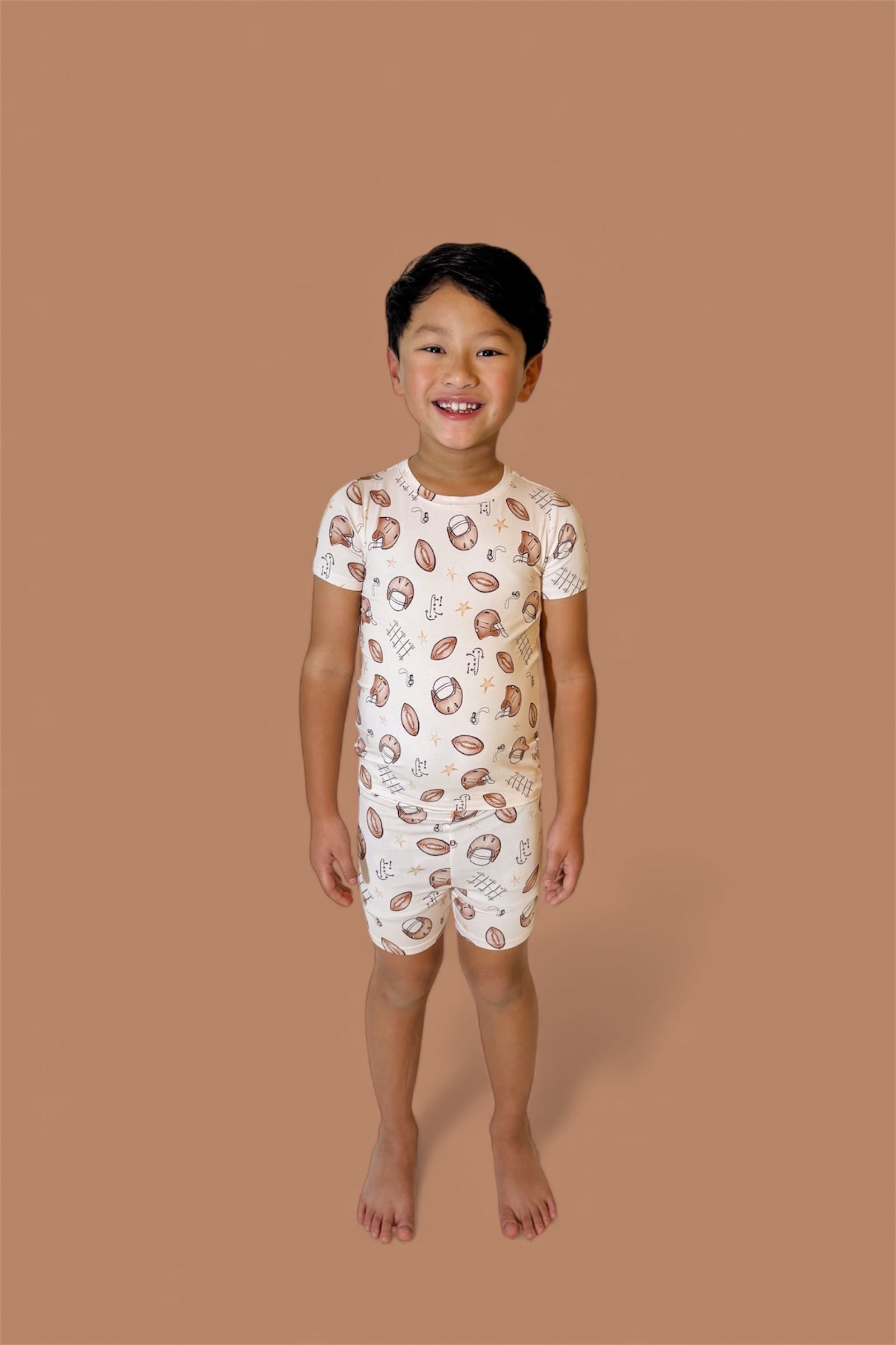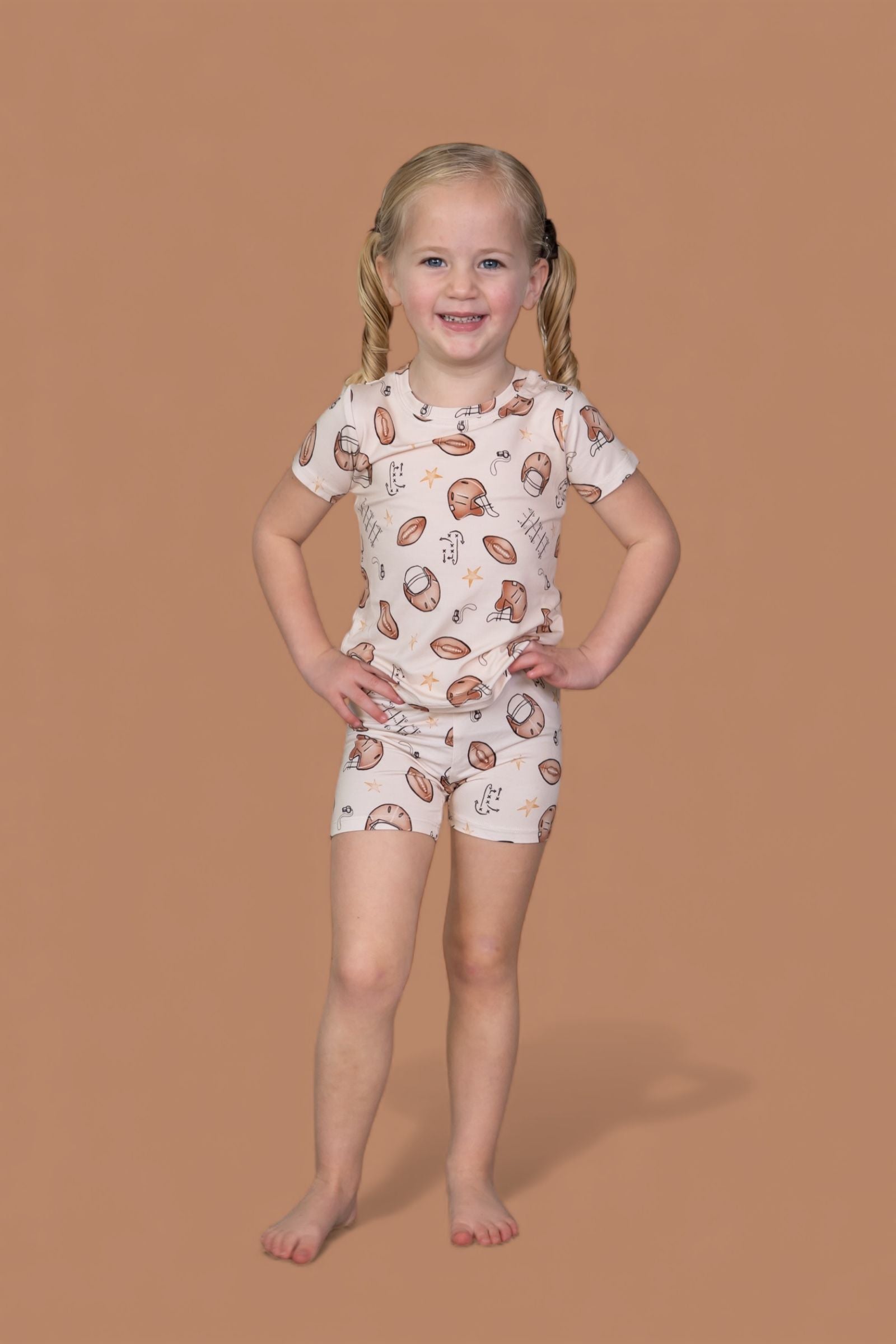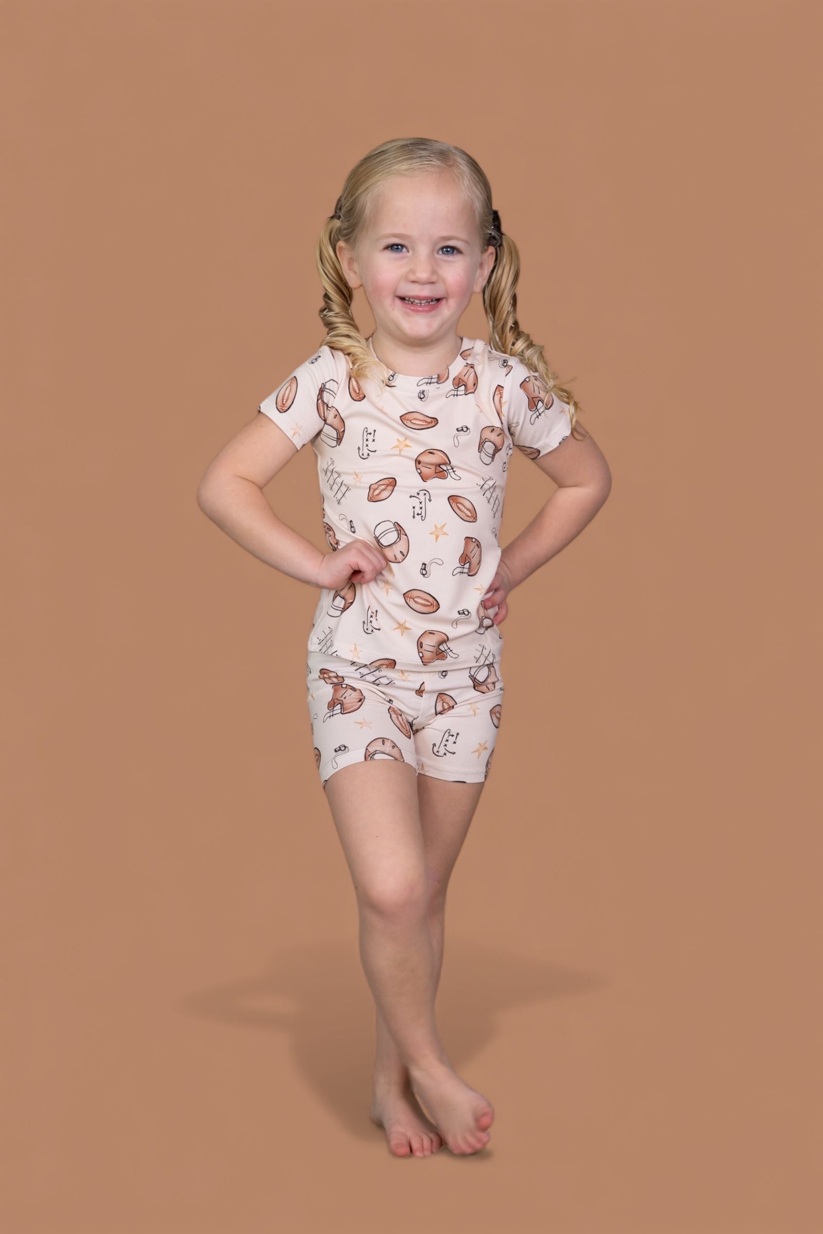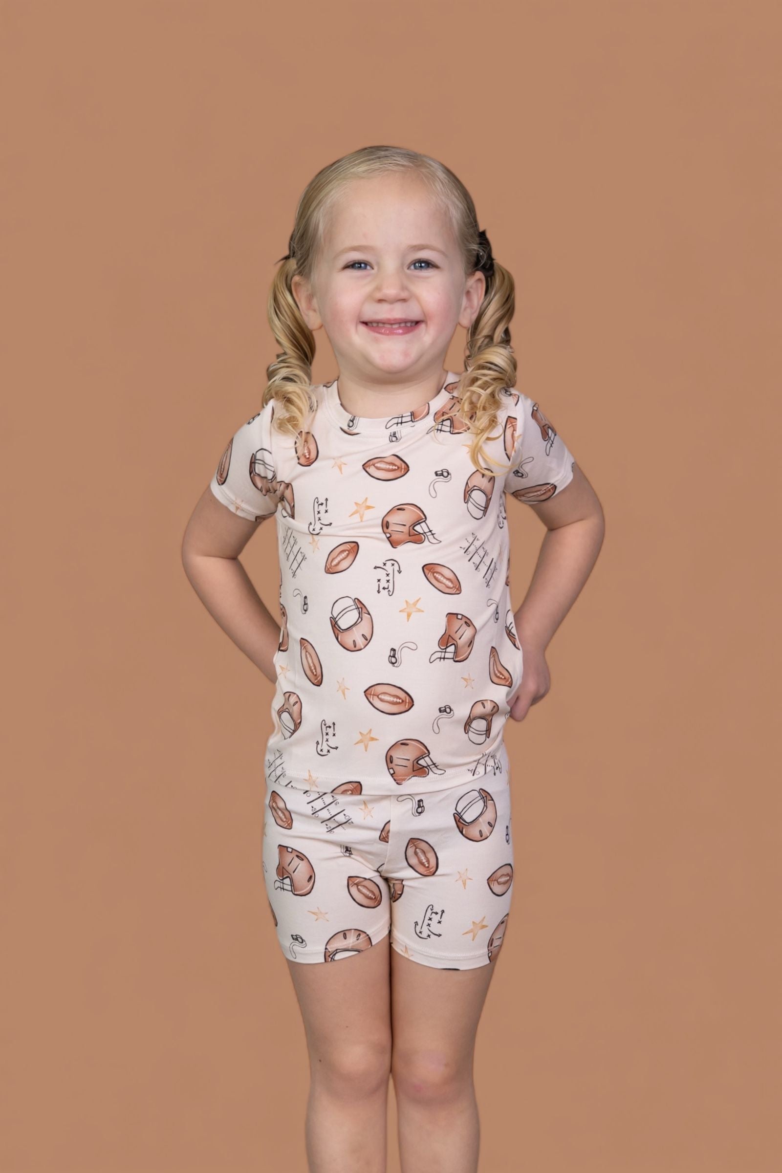Cool, comfy, and game-day ready! The Tiny Touchdown Dream Short Set is crafted from our signature buttery-soft bamboo fabric in a playful football, helmet, and star print. With a short-sleeve top and matching shorts, this set is perfect for warm-weather cheering, backyard play, or cozy lounging.