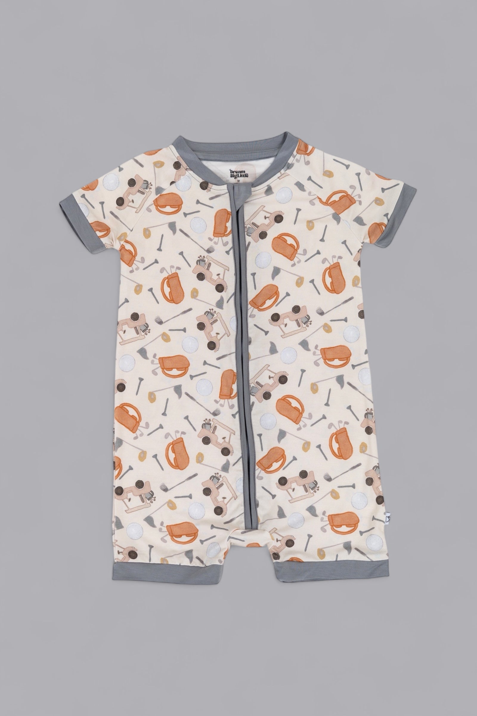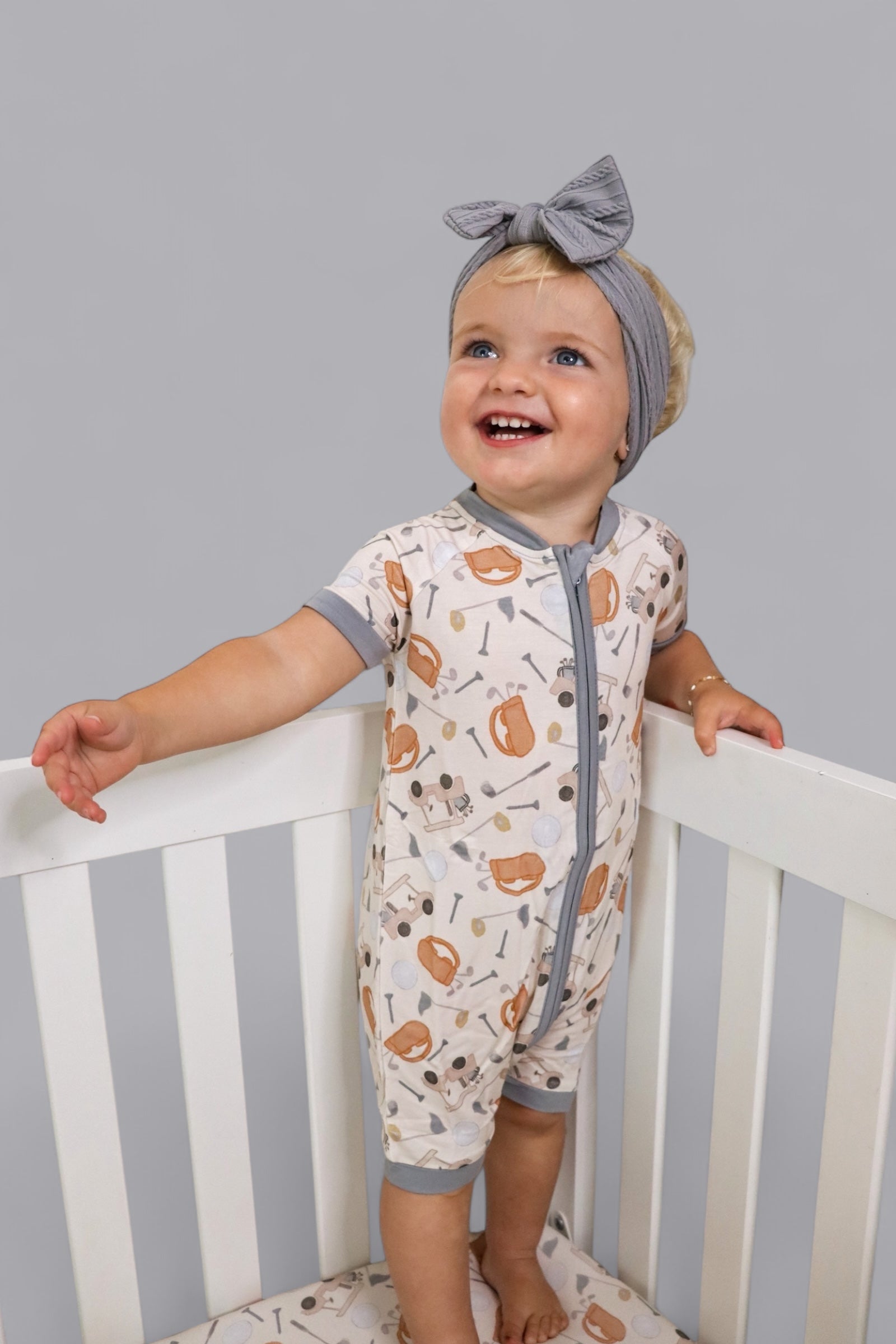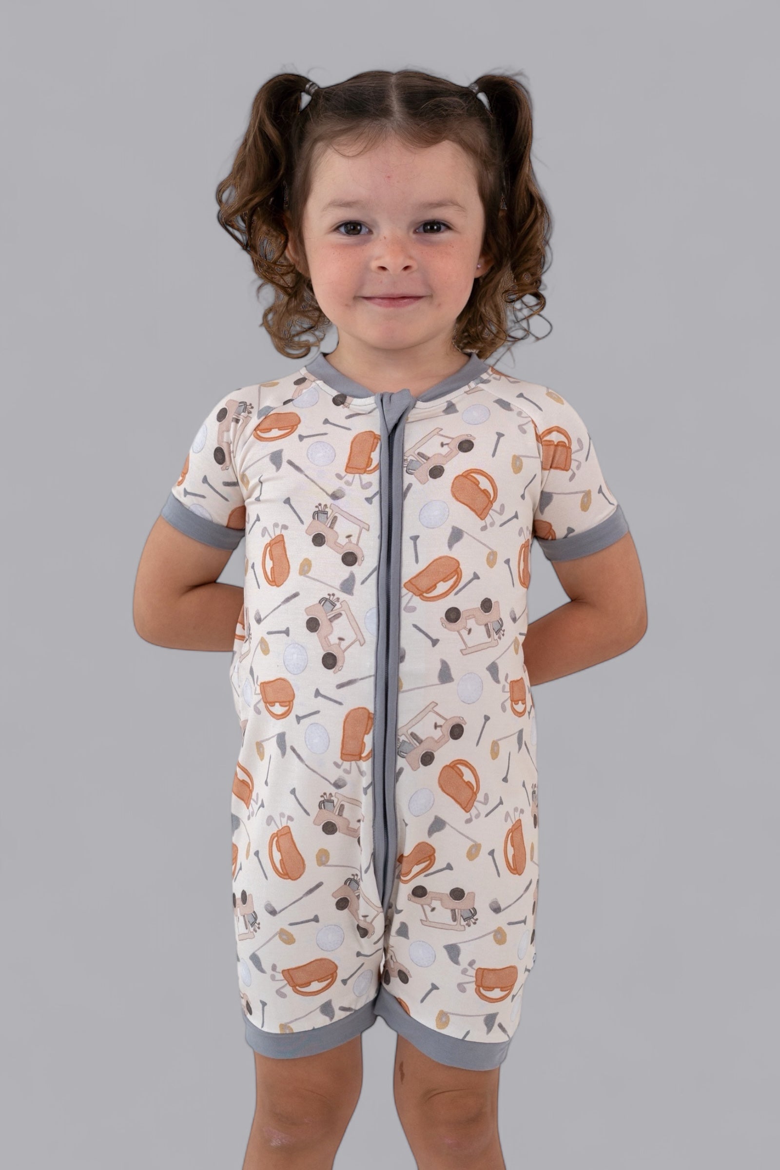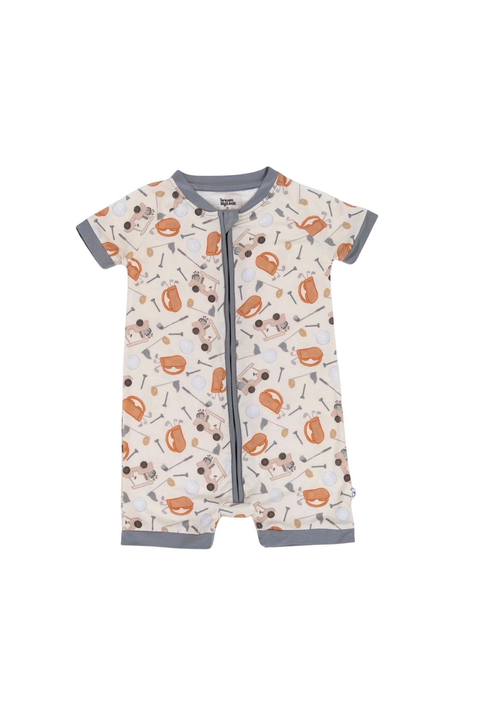 This playful golf-themed romper features charming illustrations of golf carts, clubs, balls, and caps in soft, neutral tones—perfect for your mini golfer in training. Whether they’re dreaming of the green or just cruising through playtime, this print brings a touch of country club fun to everyday comfort.