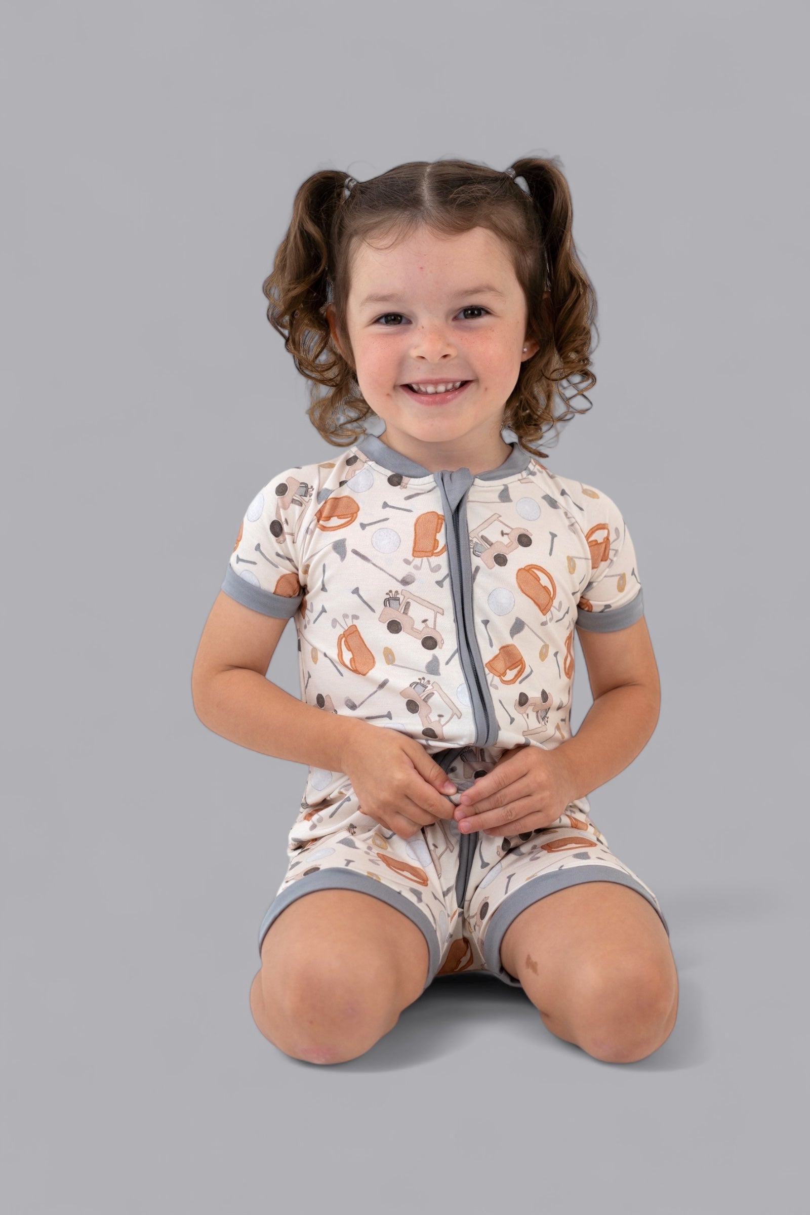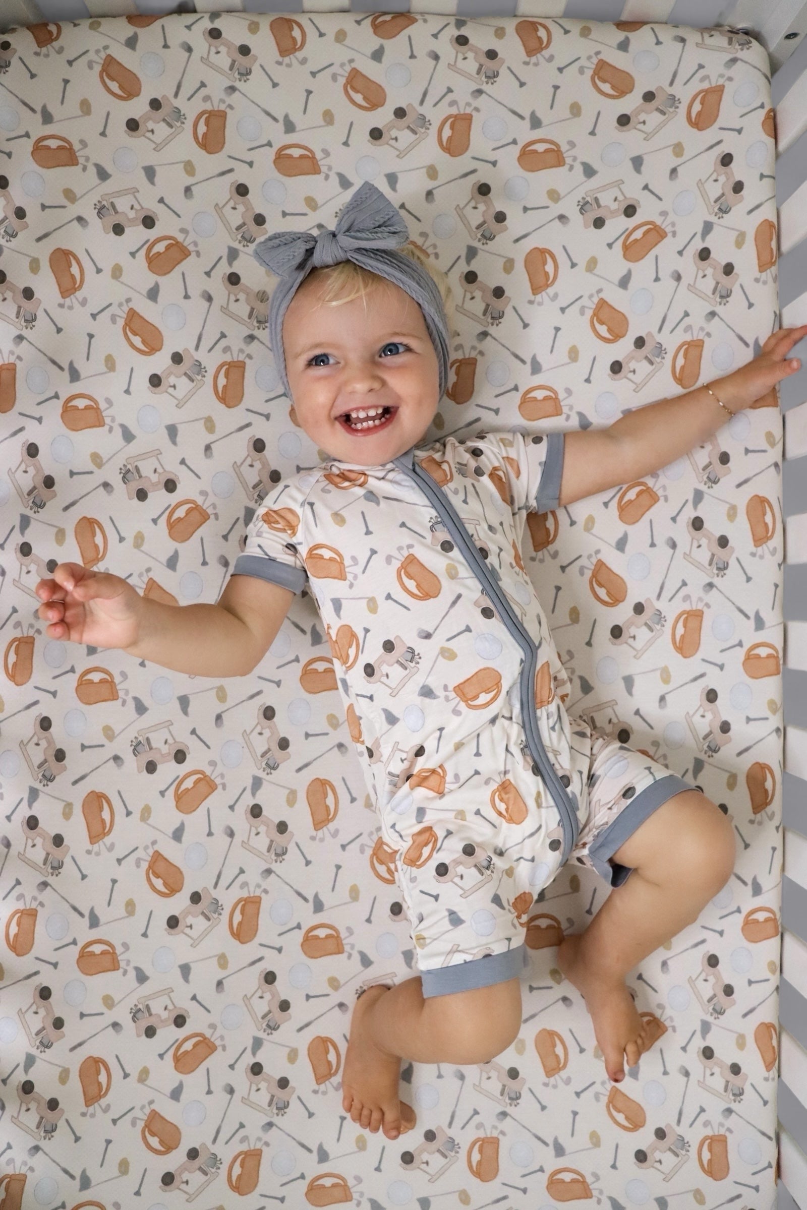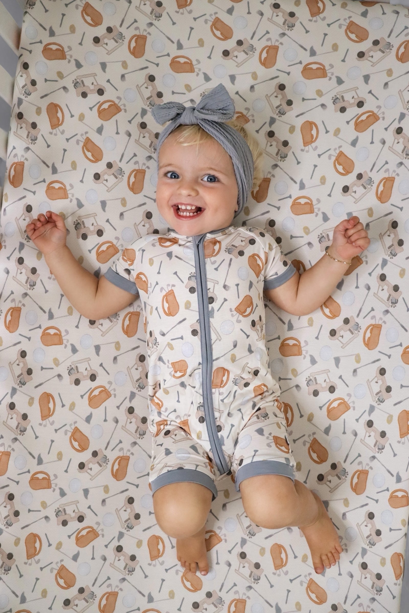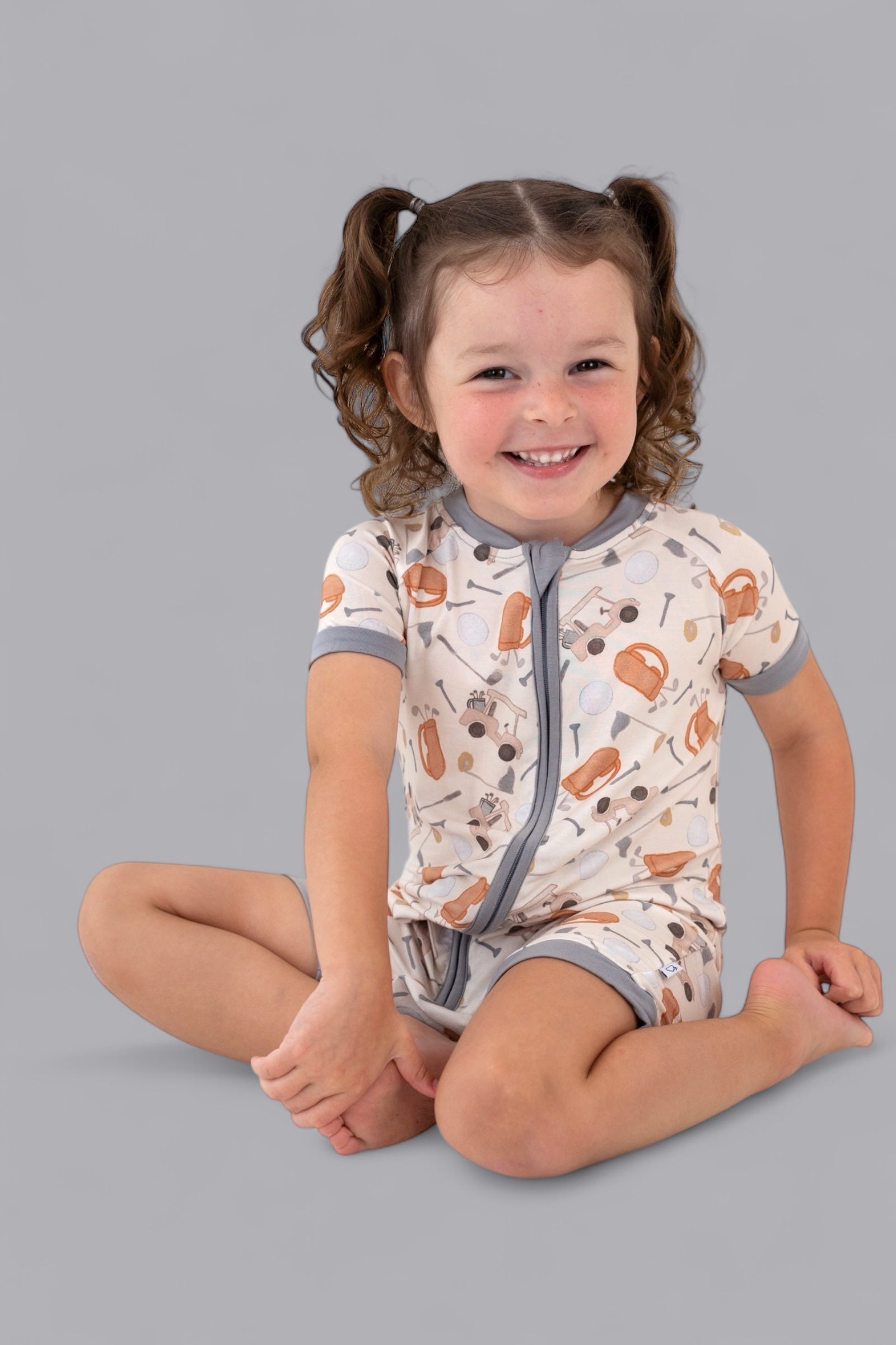 This playful golf-themed romper features charming illustrations of golf carts, clubs, balls, and caps in soft, neutral tones—perfect for your mini golfer in training. Whether they’re dreaming of the green or just cruising through playtime, this print brings a touch of country club fun to everyday comfort.