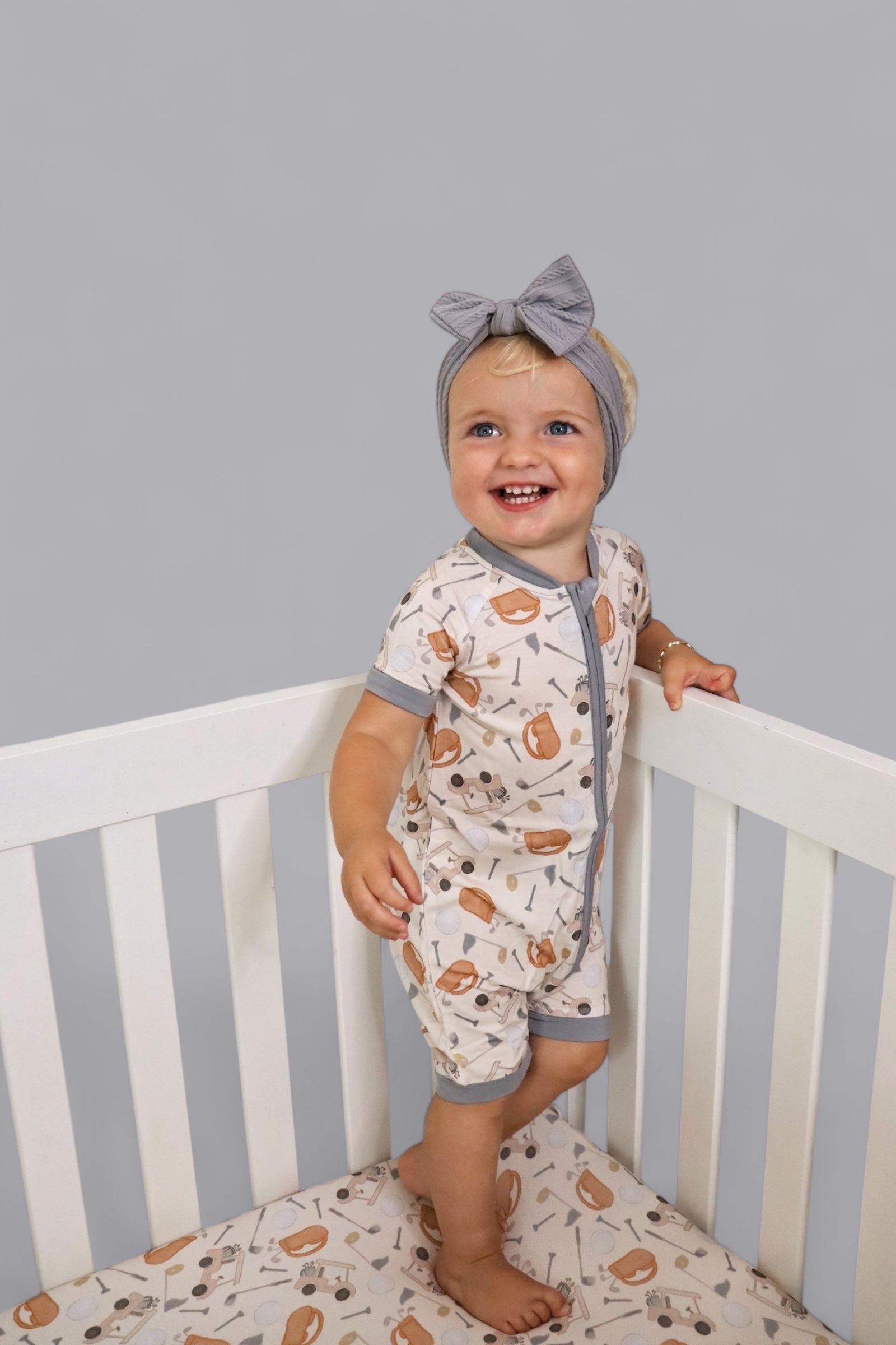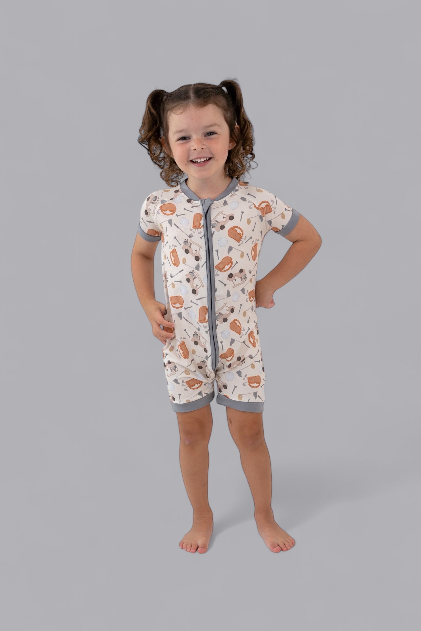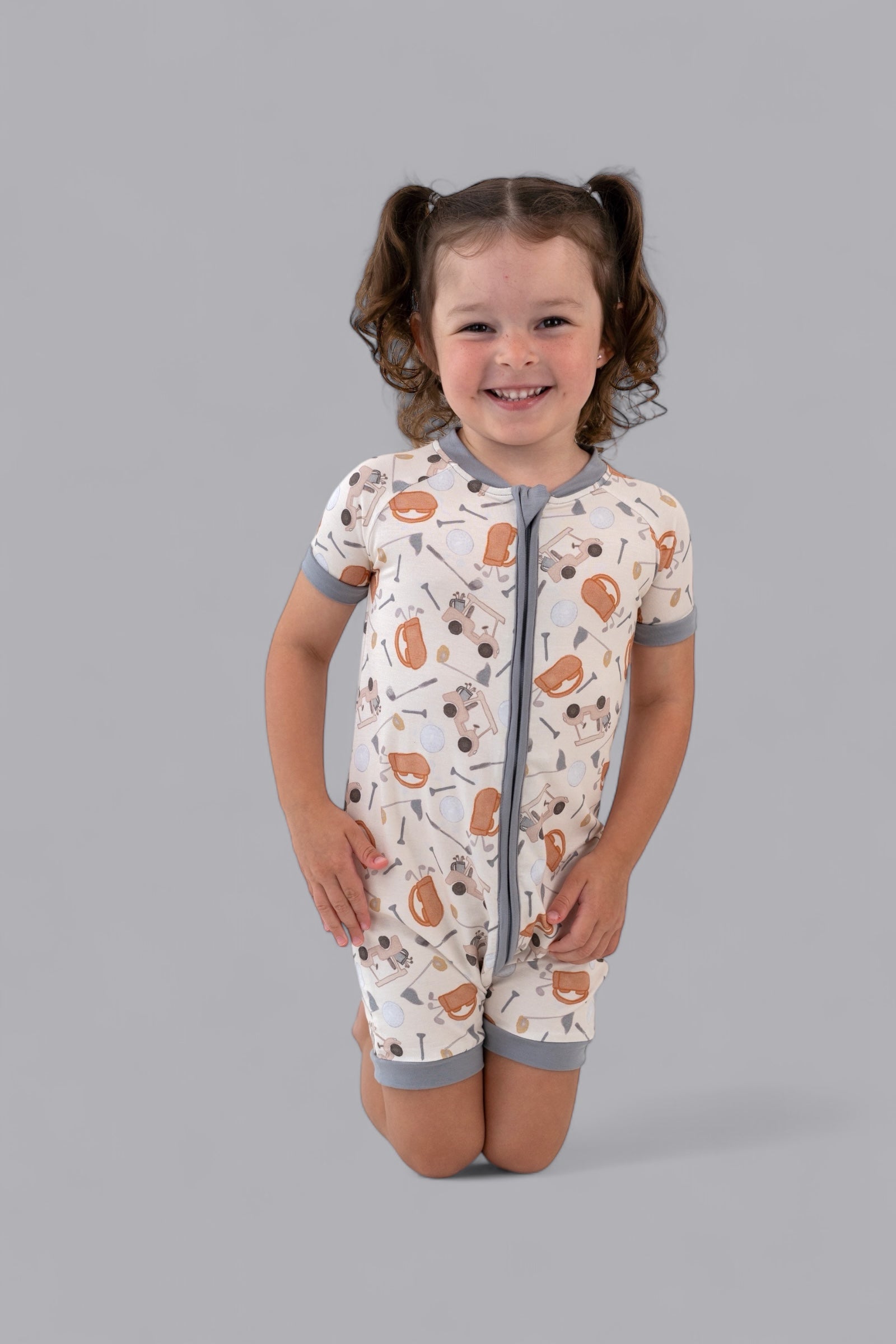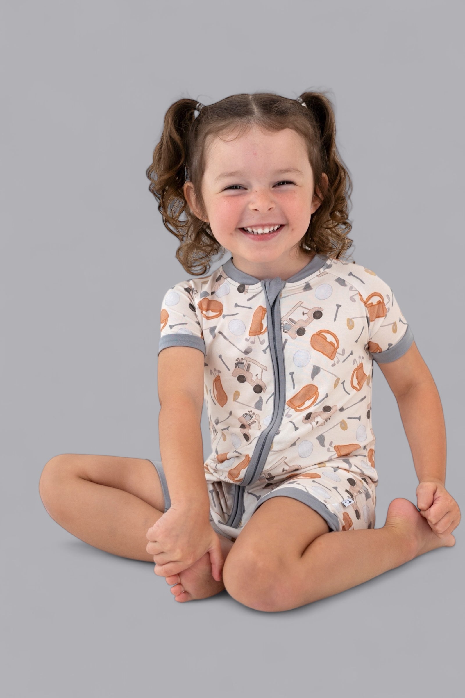 This playful golf-themed romper features charming illustrations of golf carts, clubs, balls, and caps in soft, neutral tones—perfect for your mini golfer in training. Whether they’re dreaming of the green or just cruising through playtime, this print brings a touch of country club fun to everyday comfort.