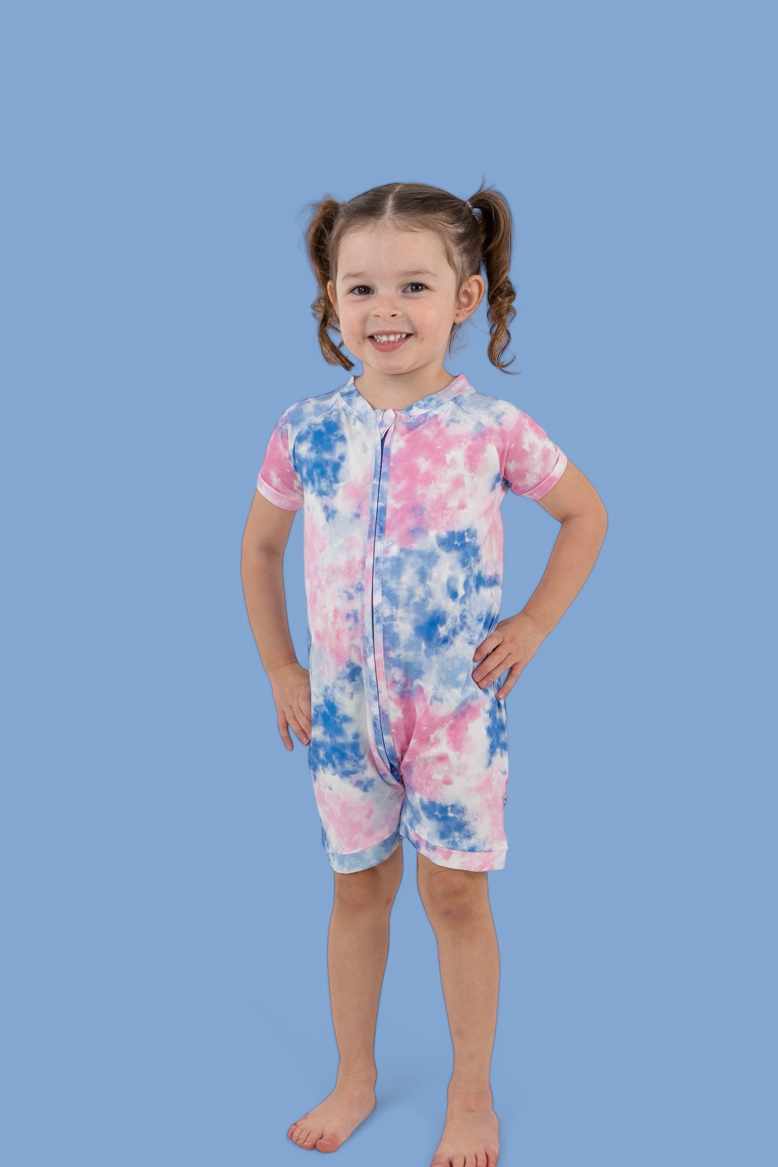 The Cotton Candy Tie Dye Dream Shortie is the perfect mix of cozy comfort and playful style. With its soft swirl of pastel pinks, purples, and blues, this short romper is a must-have for warm-weather adventures, stroller naps, and everything in between.