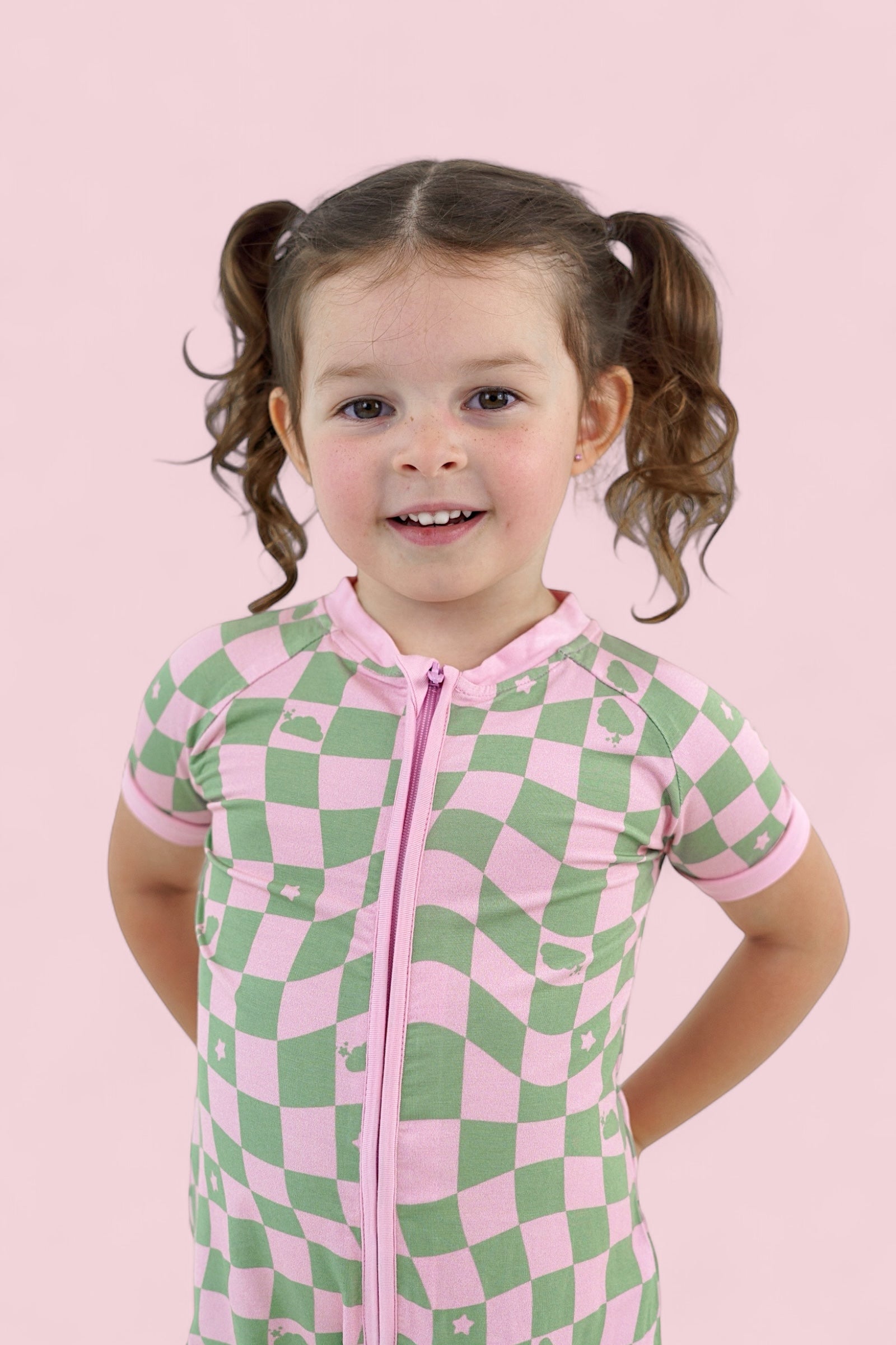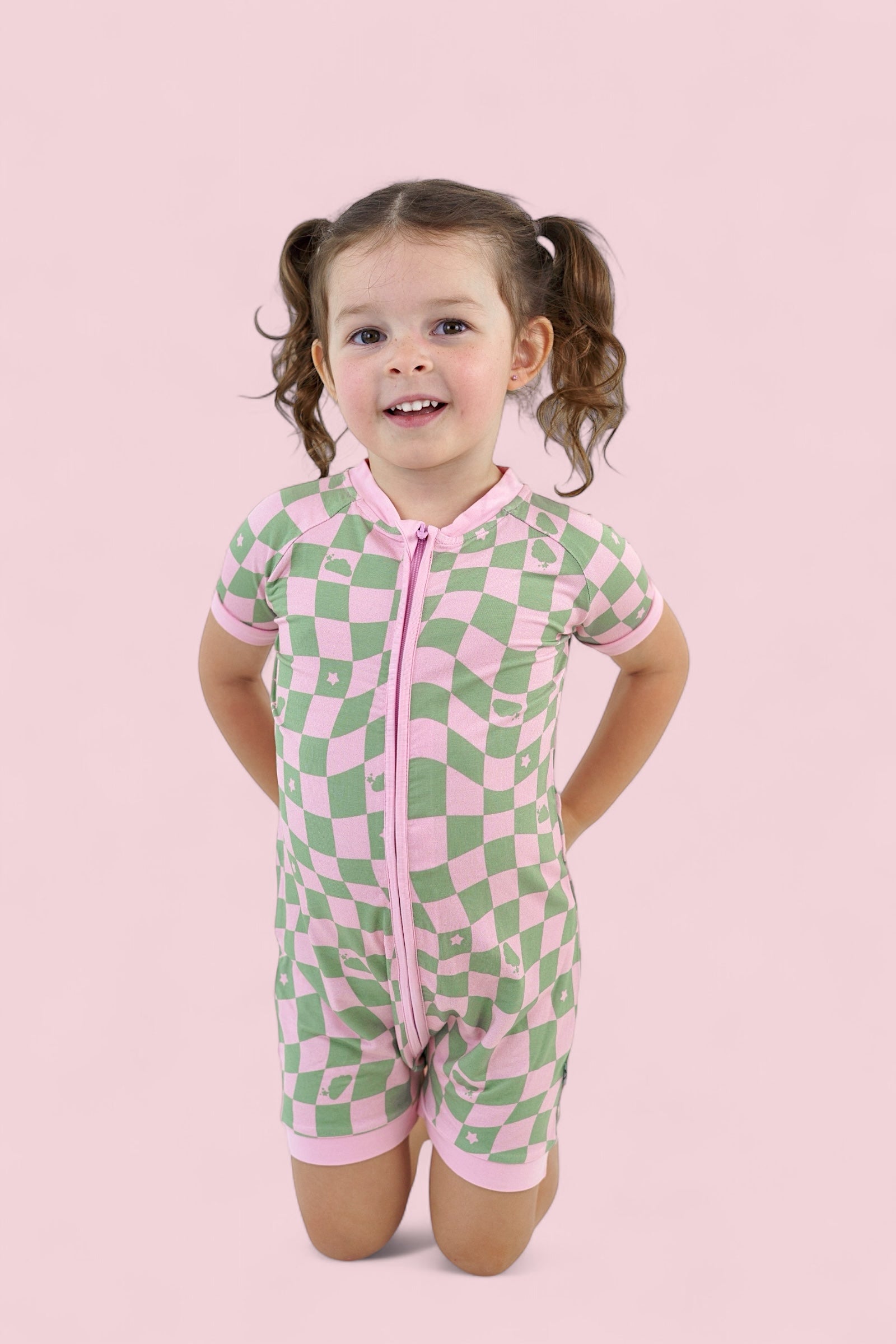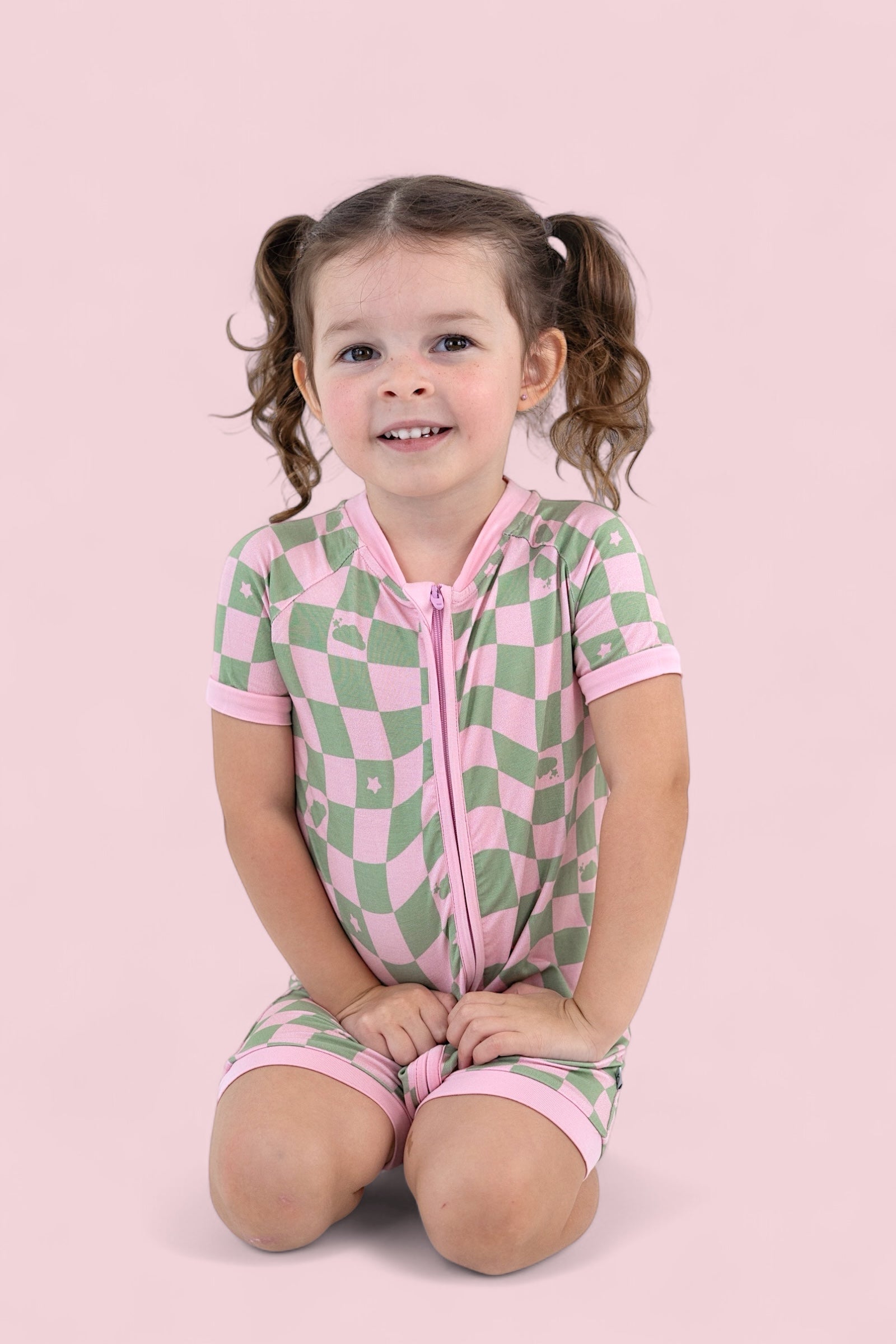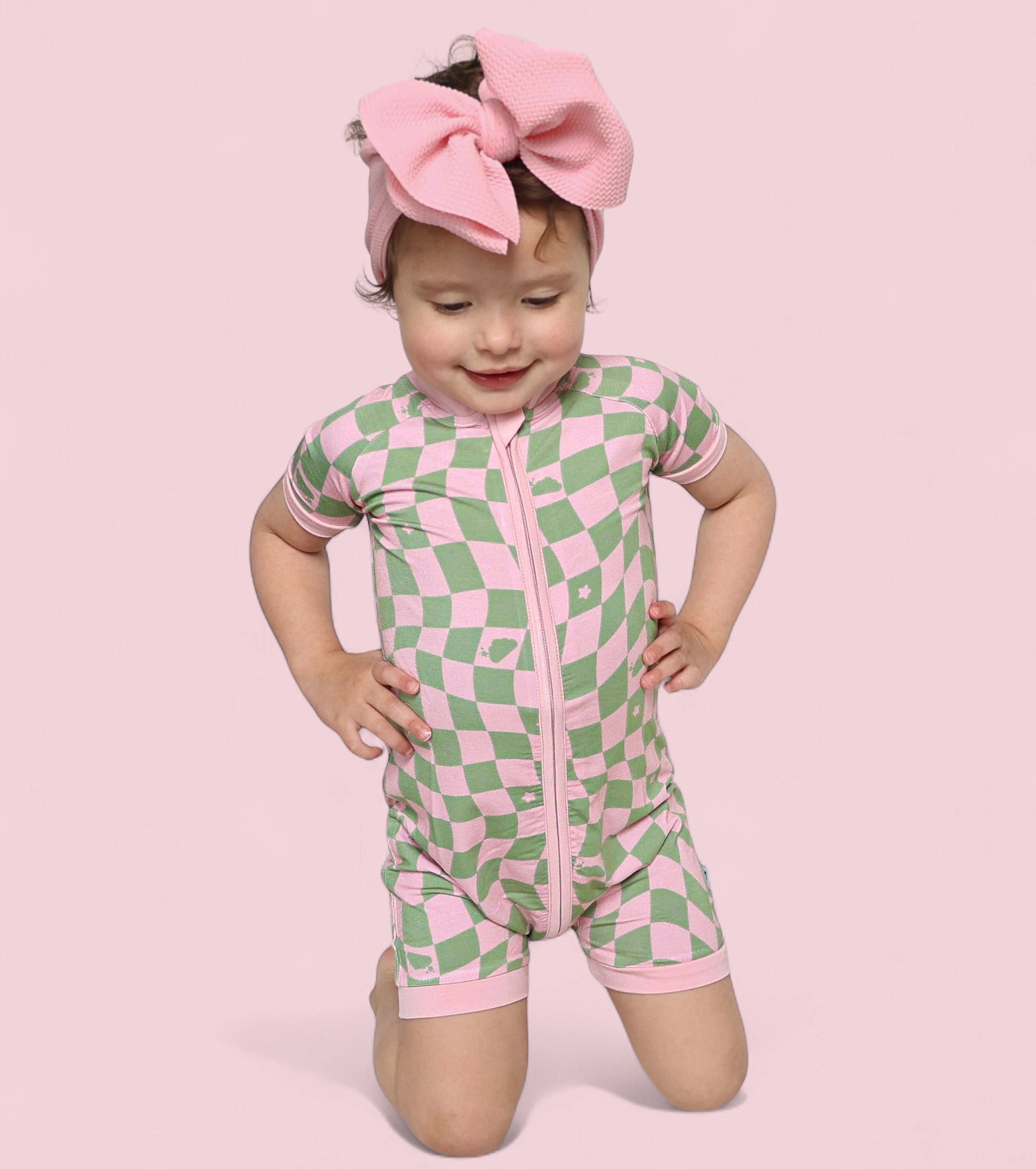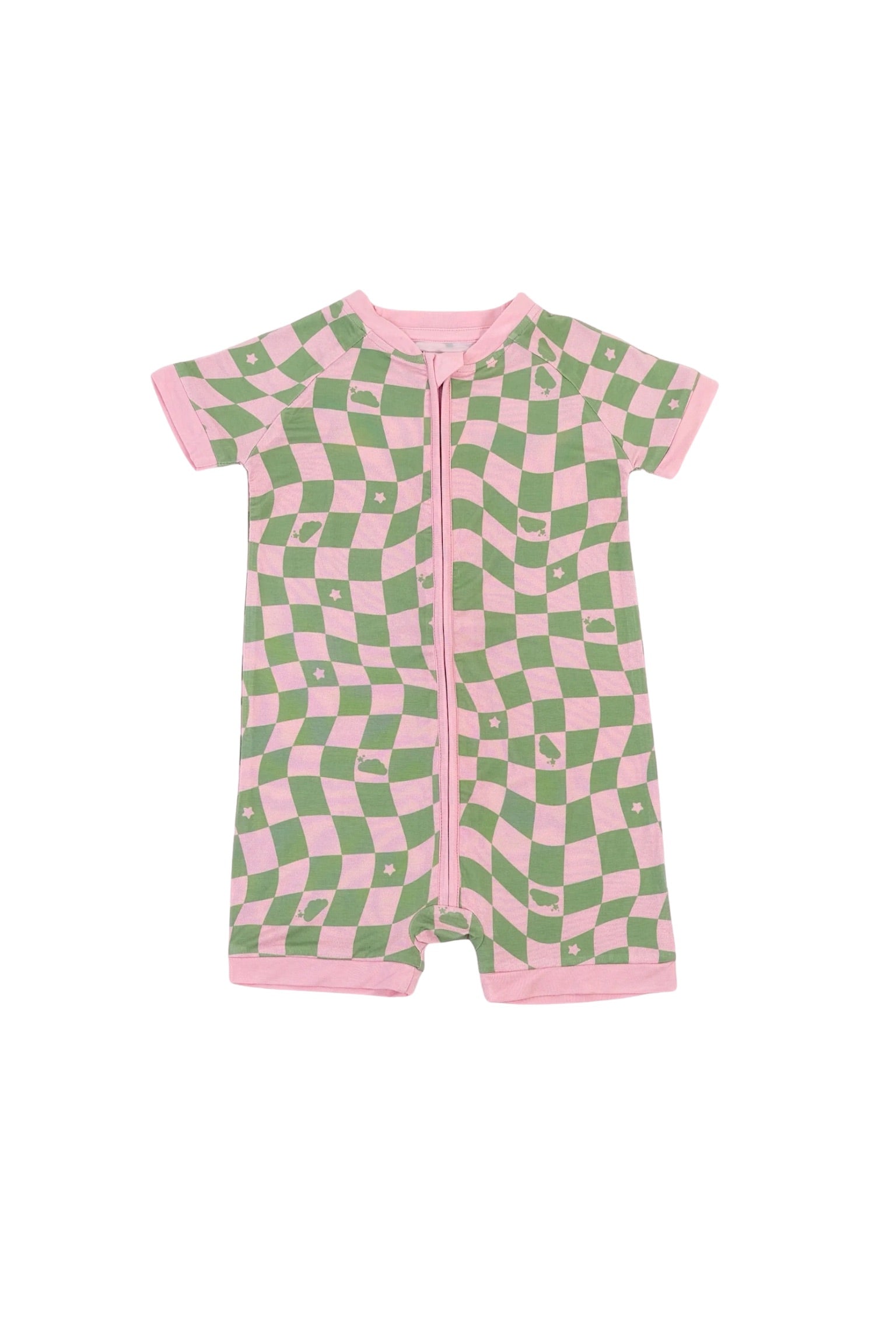 This dreamy print features a playful wave-check pattern in muted pink and sage green, sprinkled with clouds and stars inspired by the signature Dream Big Little Co. logo. It's soft, surreal, and full of that signature DBLC magic.