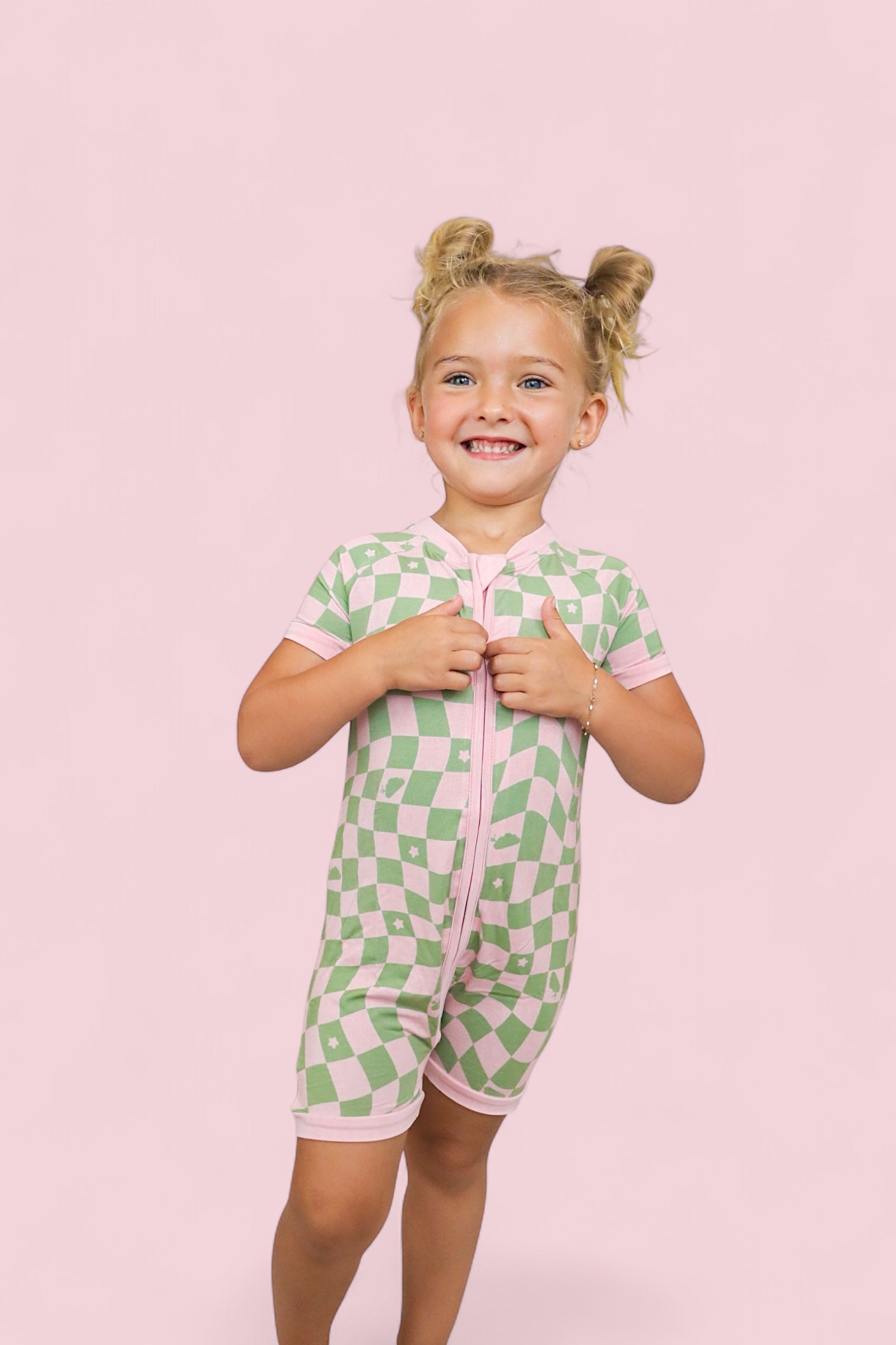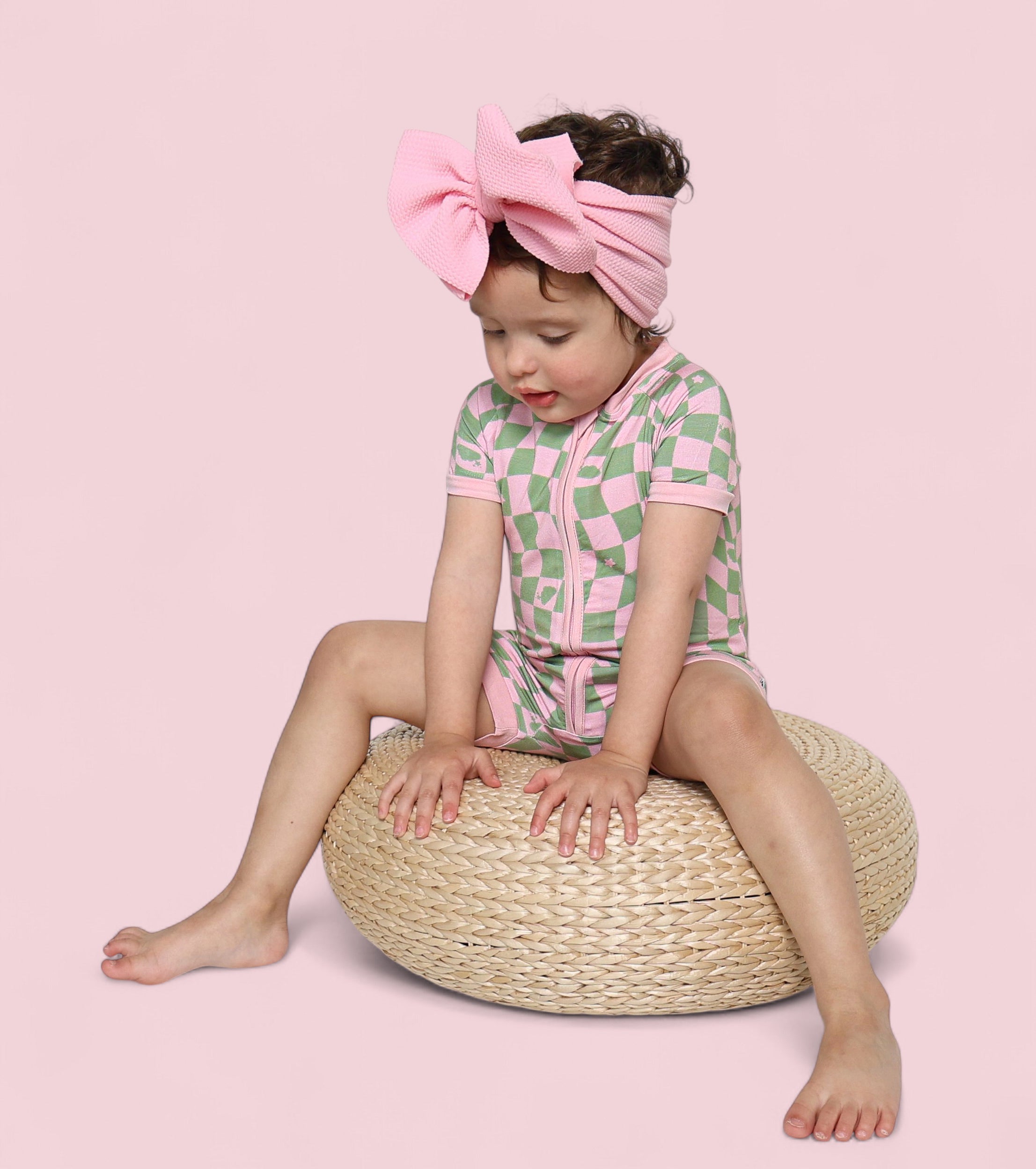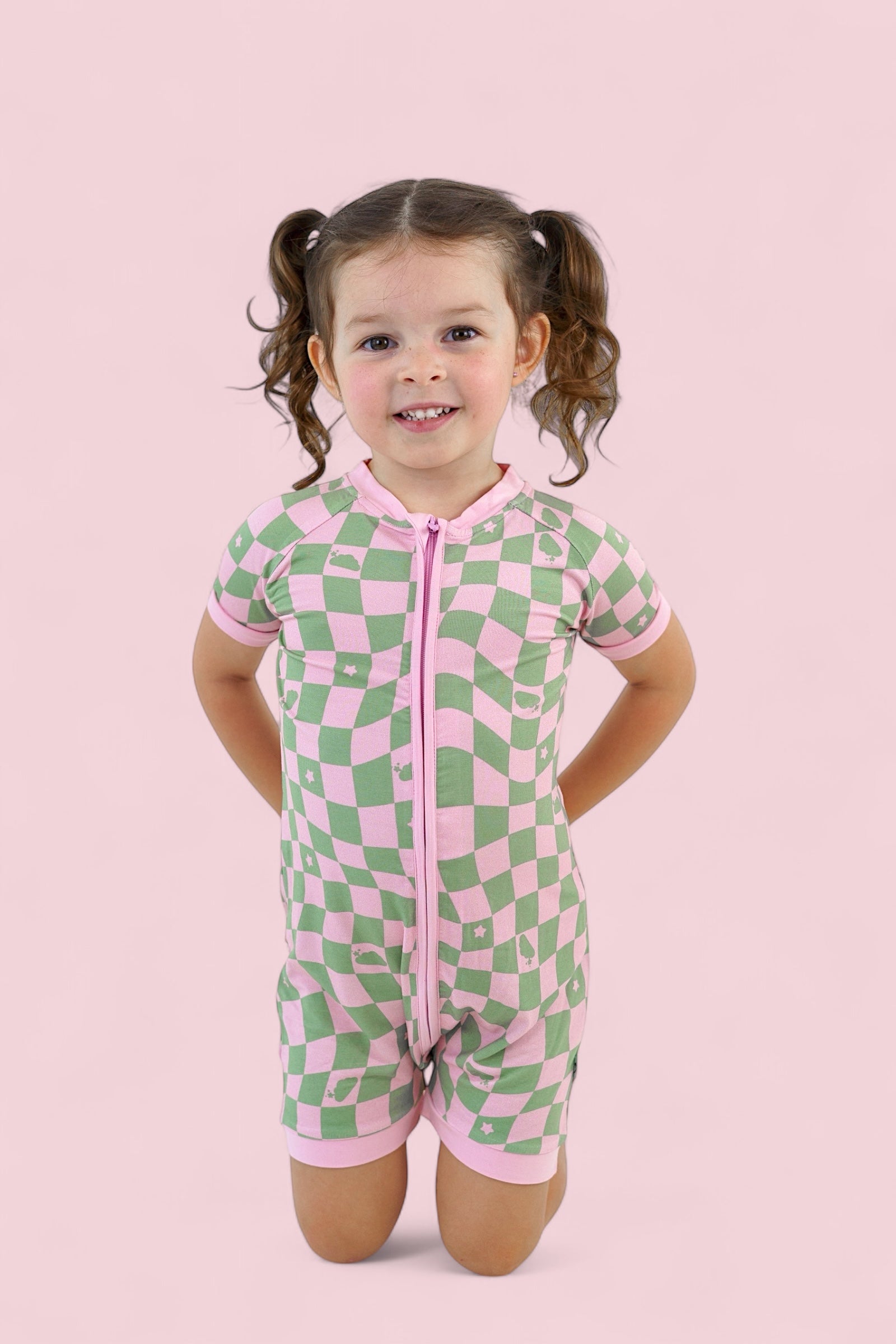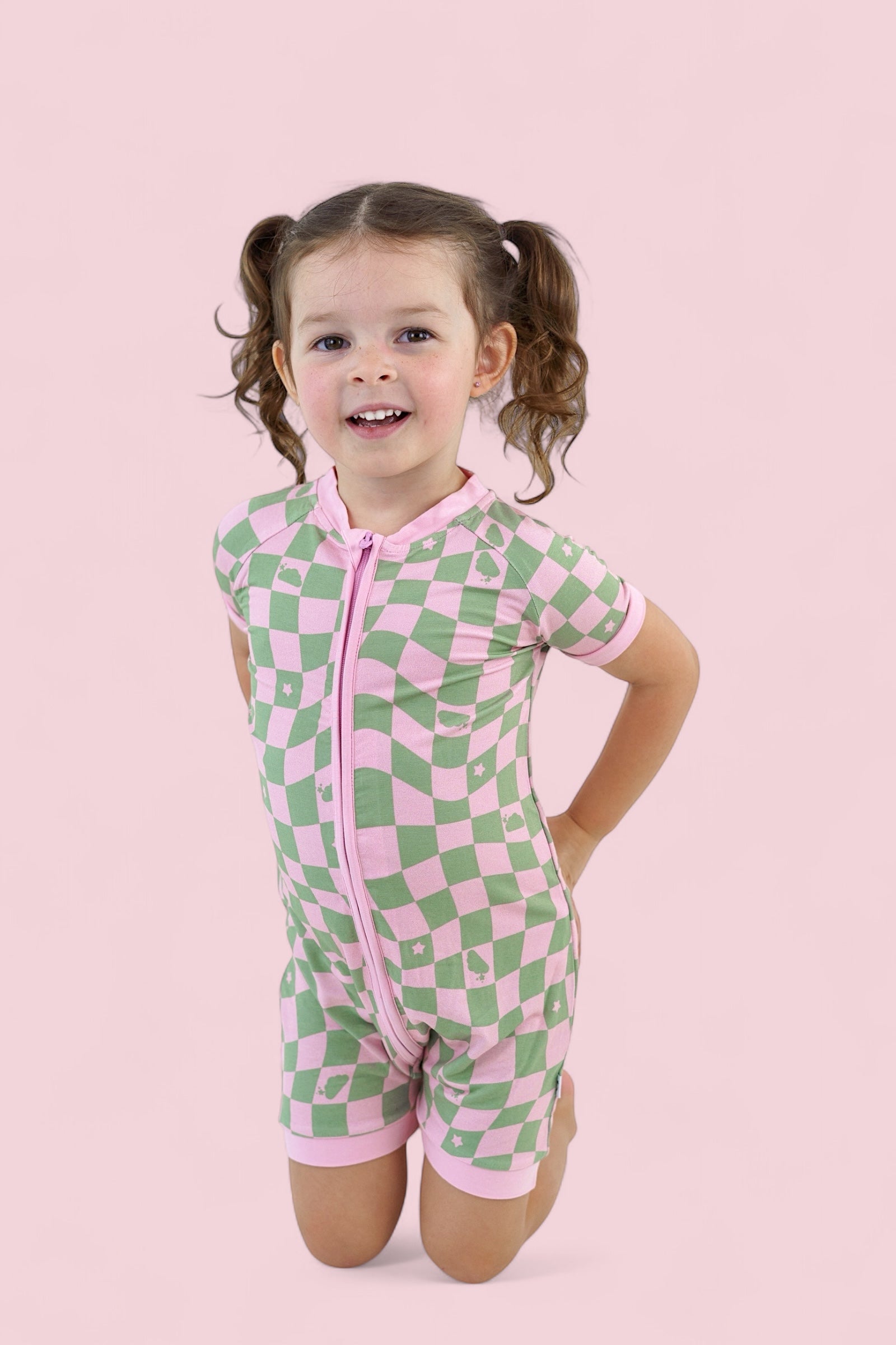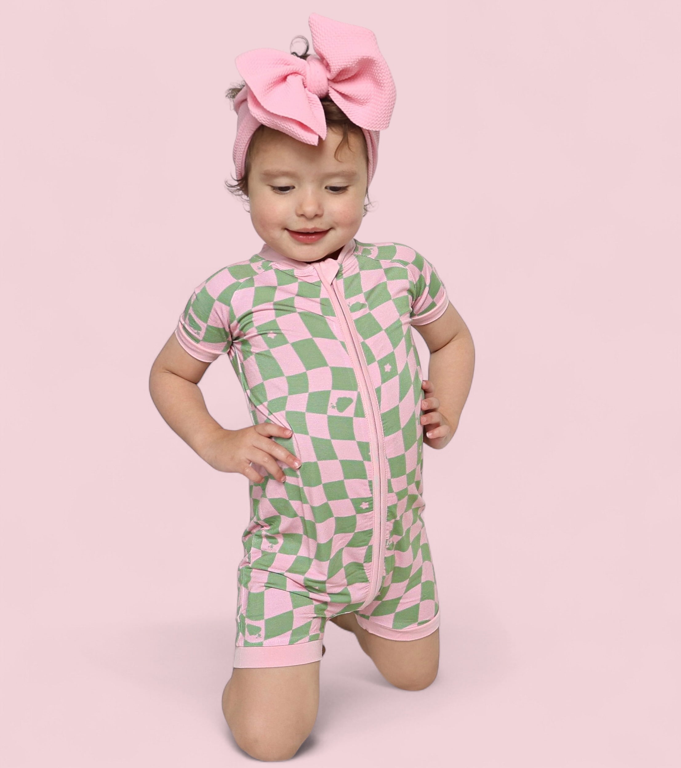 This dreamy print features a playful wave-check pattern in muted pink and sage green, sprinkled with clouds and stars inspired by the signature Dream Big Little Co. logo. It's soft, surreal, and full of that signature DBLC magic.