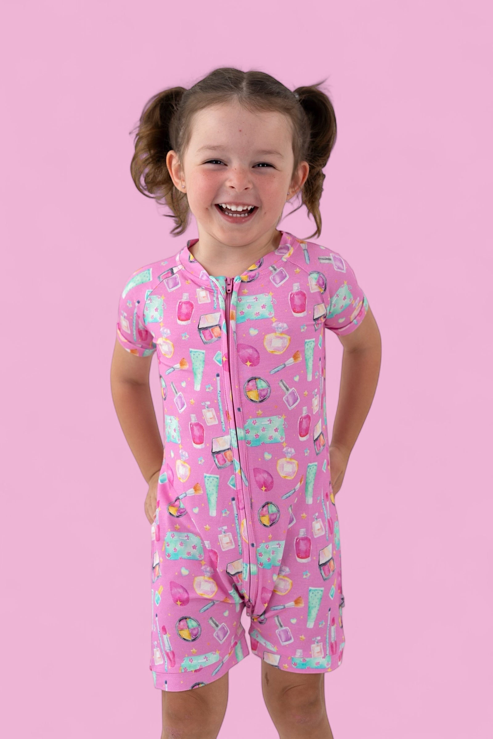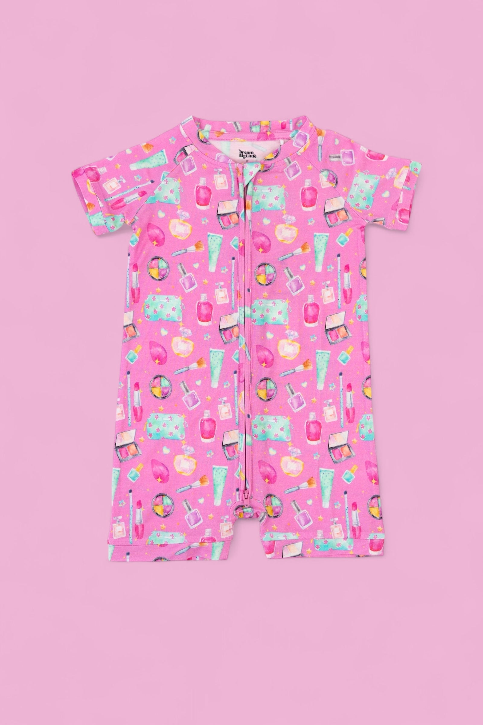 Our Glamour Magic Dream Shortie is made for little trendsetters who love to sparkle. Featuring a playful print filled with lipstick tubes, blush palettes, and all things beauty, it’s like diving into the dreamiest makeup bag ever—no mess required!