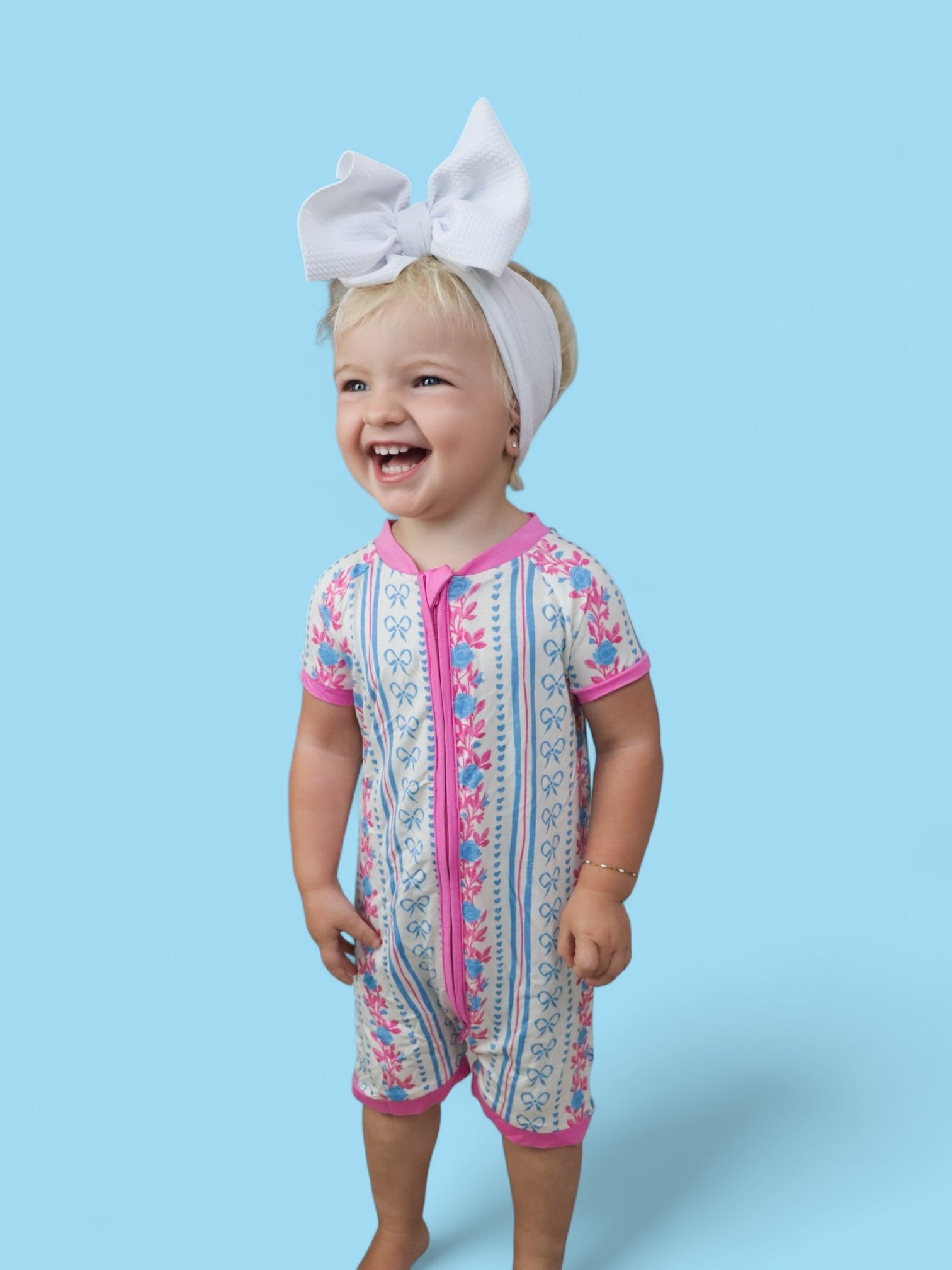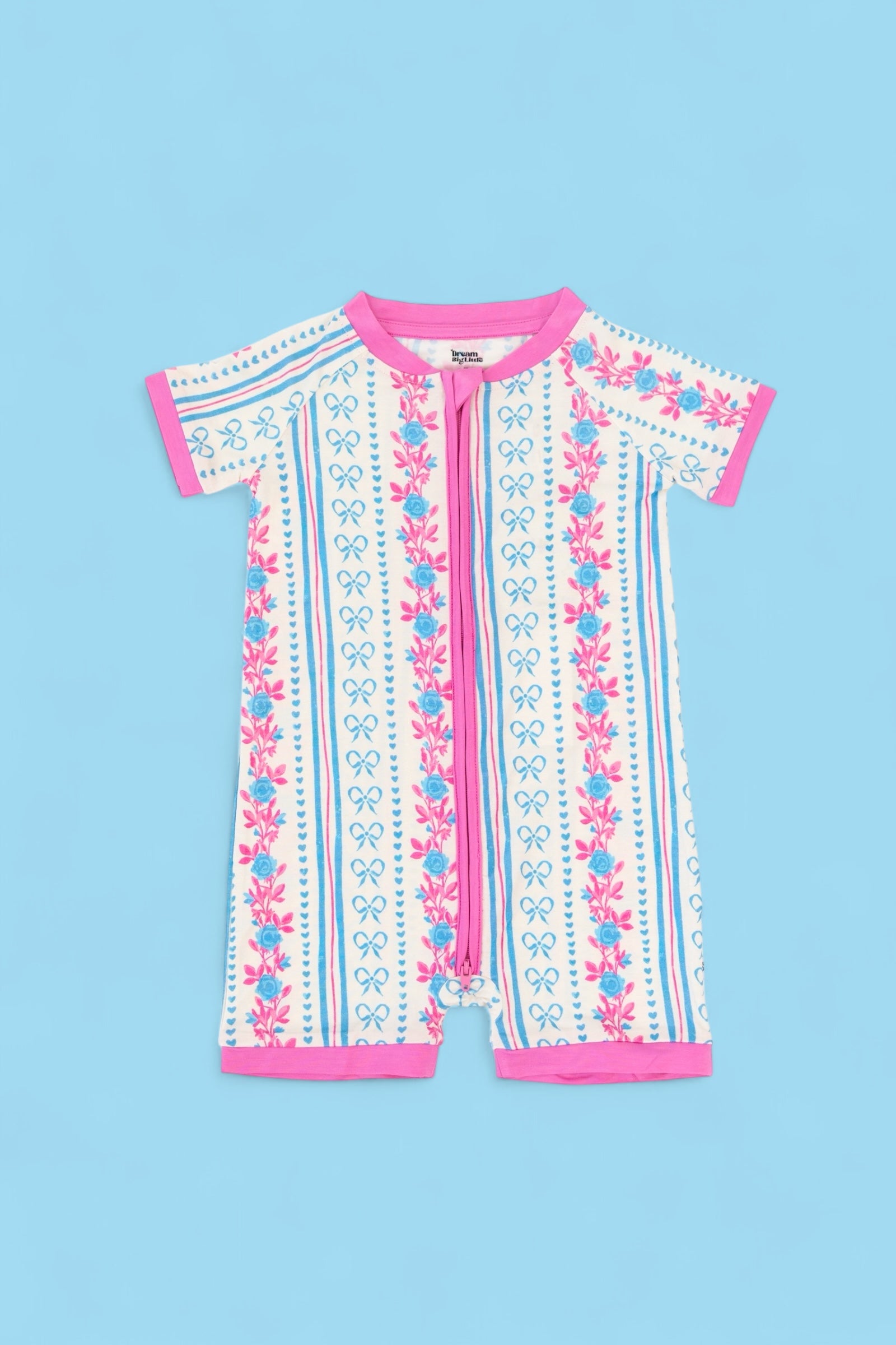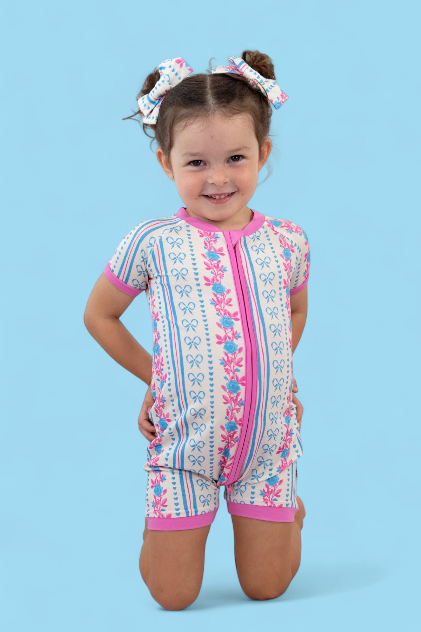 This darling romper features a vintage-inspired print with vertical stripes of powder blue bows, dainty pink florals, and tiny heart details. It’s the perfect blend of charm and comfort for your little one’s summer adventures.