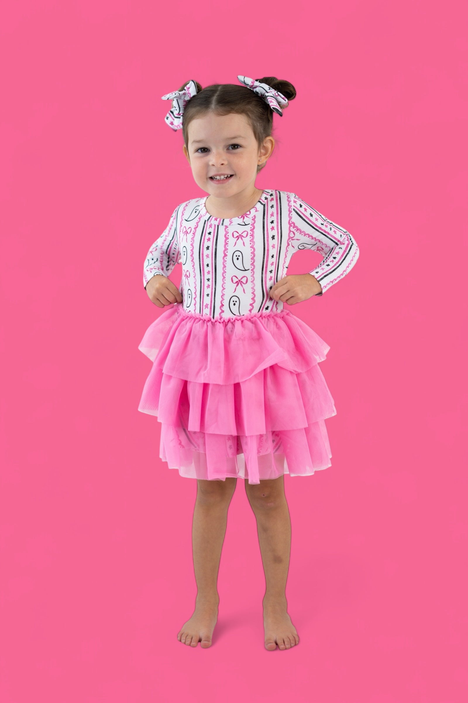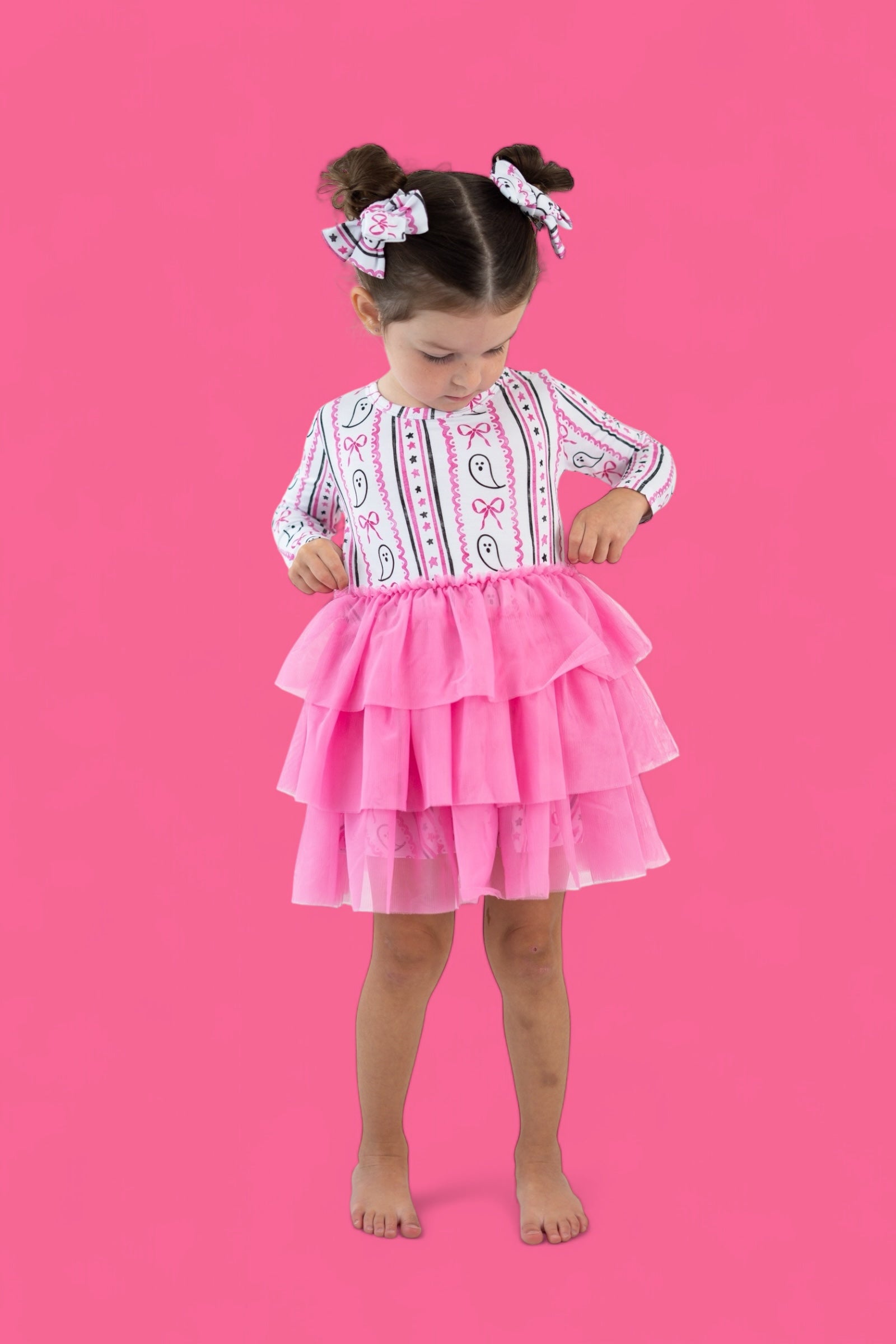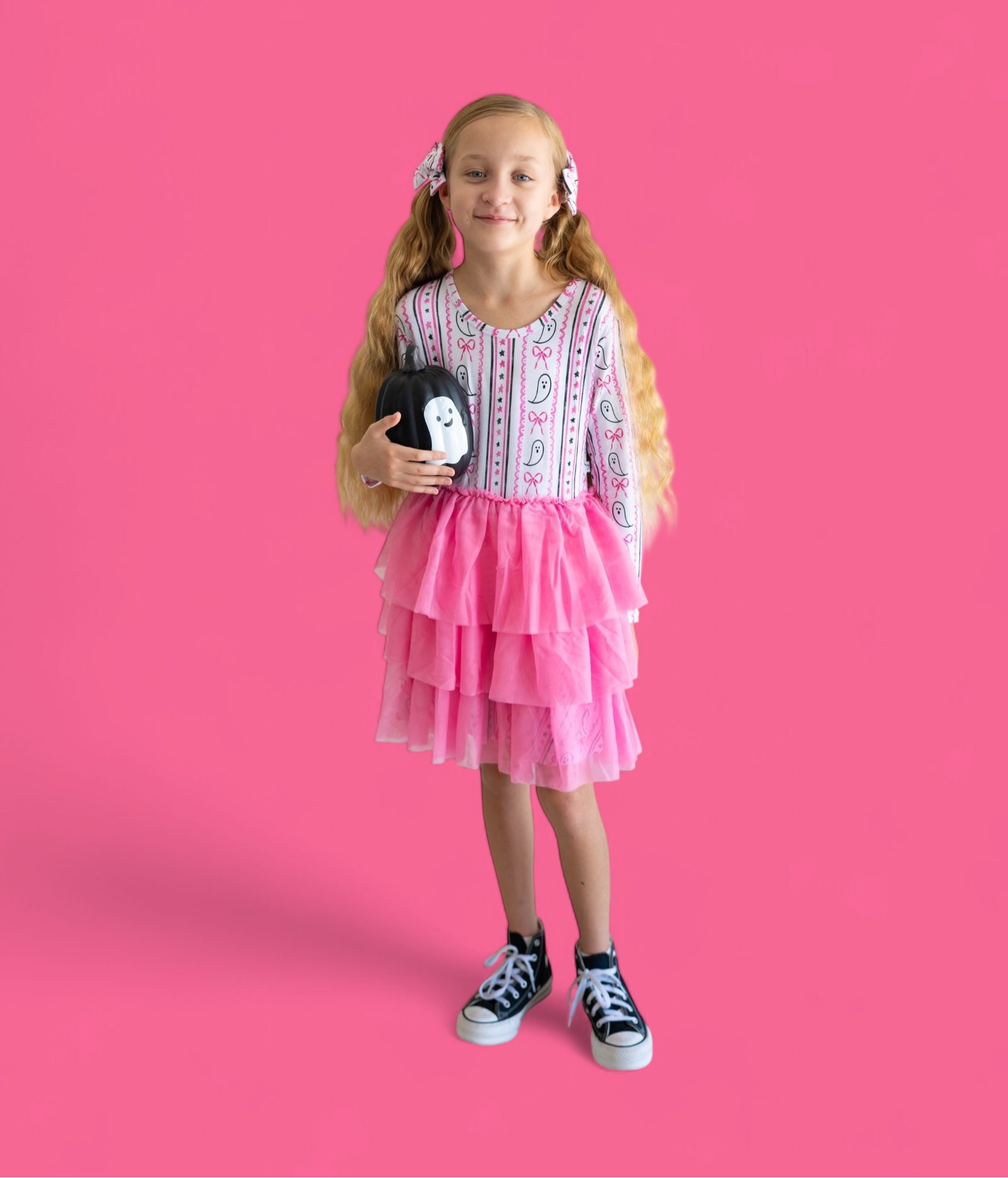 Let her twirl into spooky season with the Boo and Bows Long Sleeve Dream Tutu Dress! Featuring a charming Halloween print of soft pink bows, cheerful ghosts, scalloped stripes, and stars, this dress combines buttery-soft comfort with layers of airy tulle for a look that’s both sweet and spellbinding. Perfect for Halloween parties, pumpkin patch pics, or just spinning through fall in style.