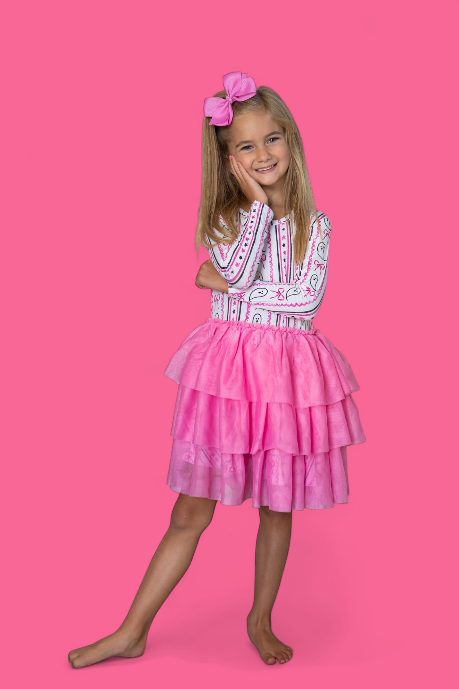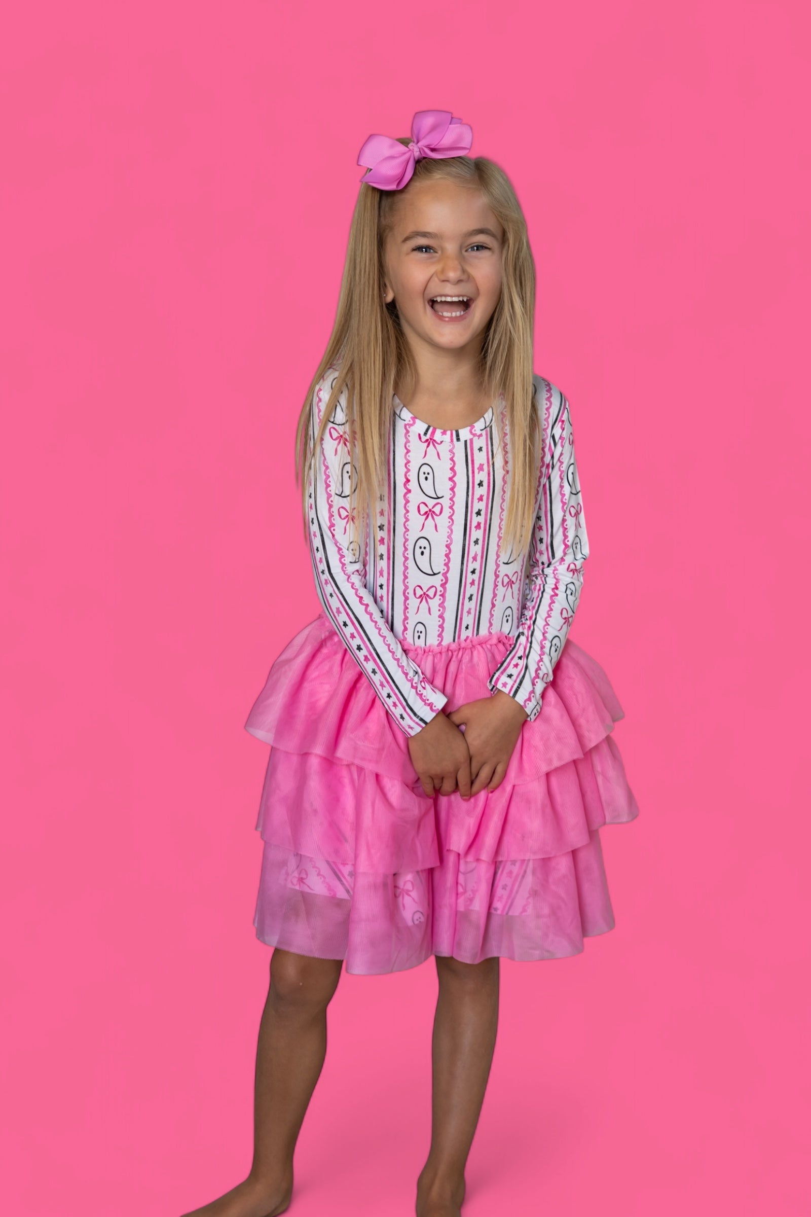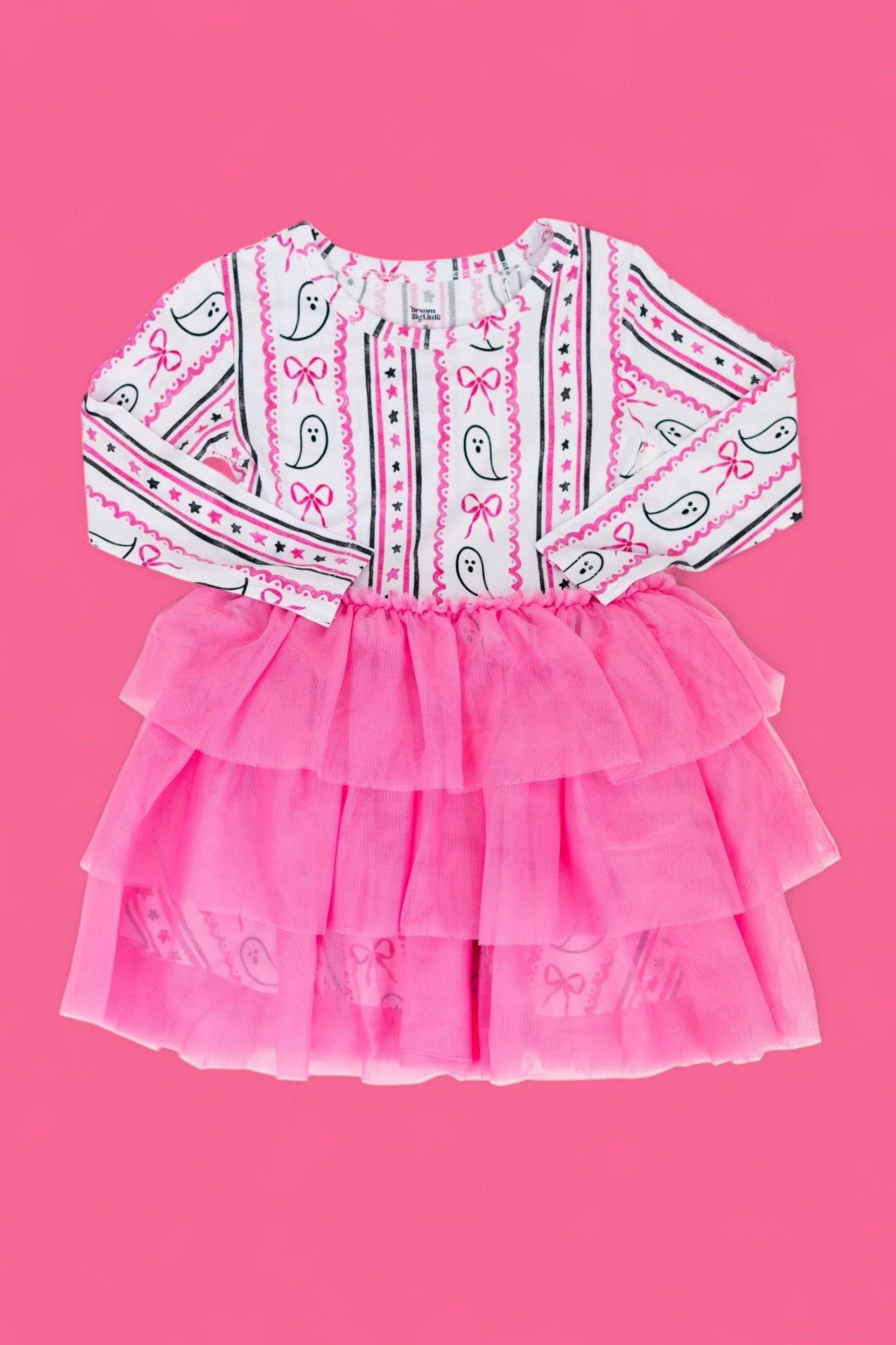 Let her twirl into spooky season with the Boo and Bows Long Sleeve Dream Tutu Dress! Featuring a charming Halloween print of soft pink bows, cheerful ghosts, scalloped stripes, and stars, this dress combines buttery-soft comfort with layers of airy tulle for a look that’s both sweet and spellbinding. Perfect for Halloween parties, pumpkin patch pics, or just spinning through fall in style.