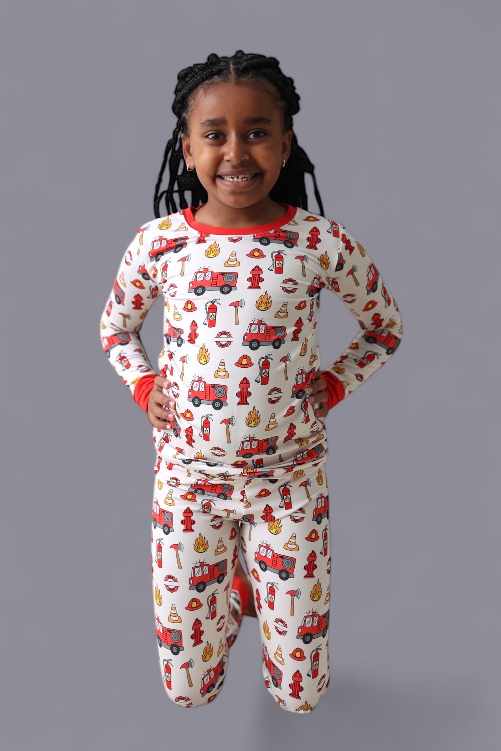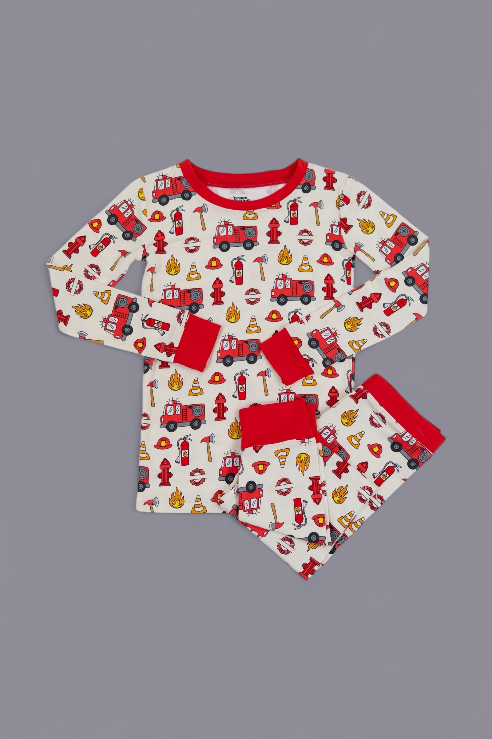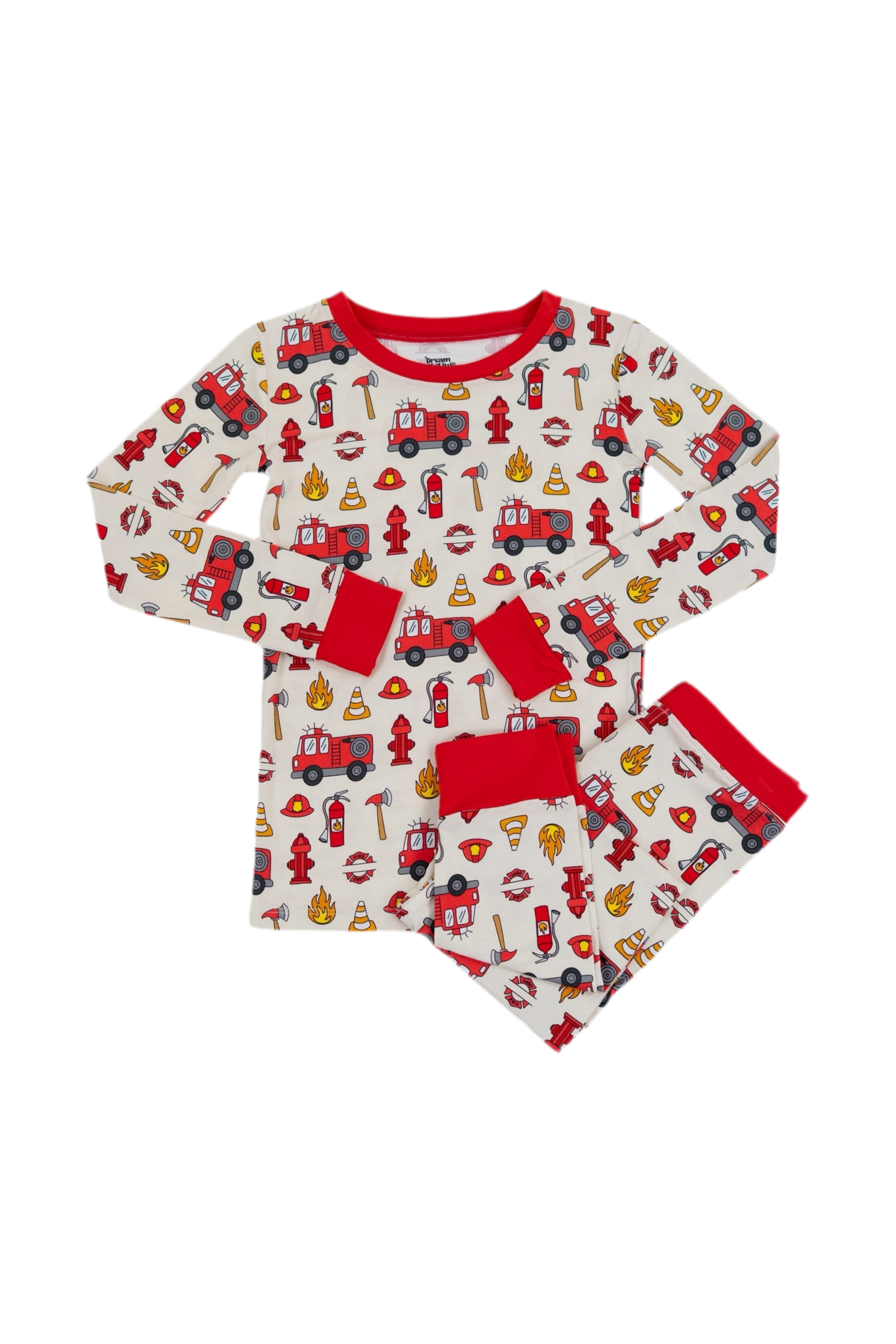 Gear up your little hero for a night of adventure with the Firehouse Heroes Dream Set! Designed for the future firefighters in your life, this pajama set features a bold and action-packed print showcasing fire trucks, helmets, axes, hydrants, and more! With a blazing red, orange, and yellow color palette, these pajamas are a tribute to the brave men and women who answer the call.