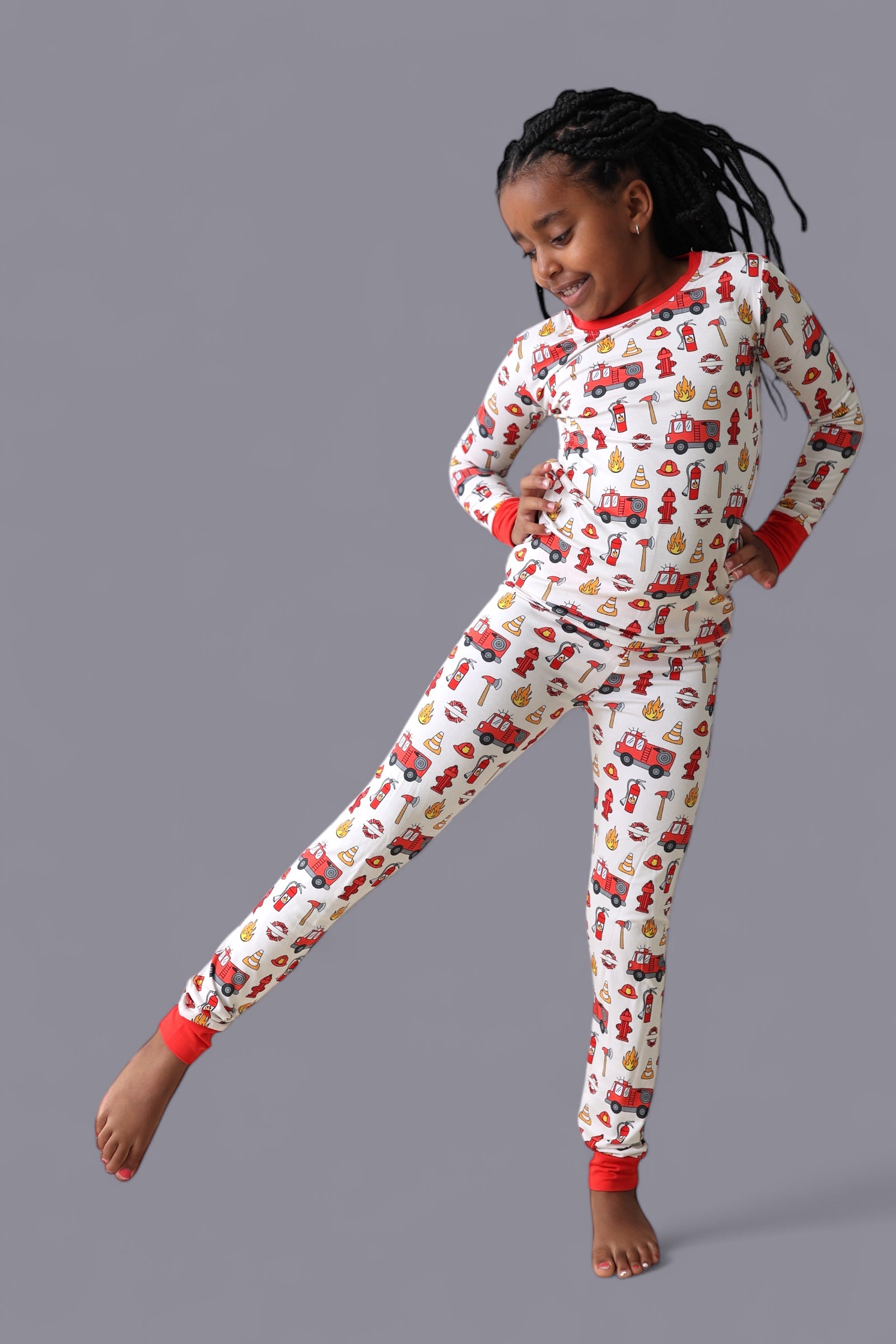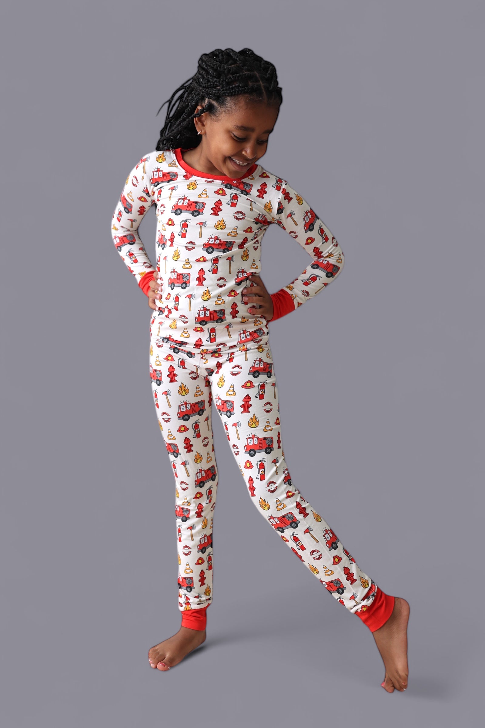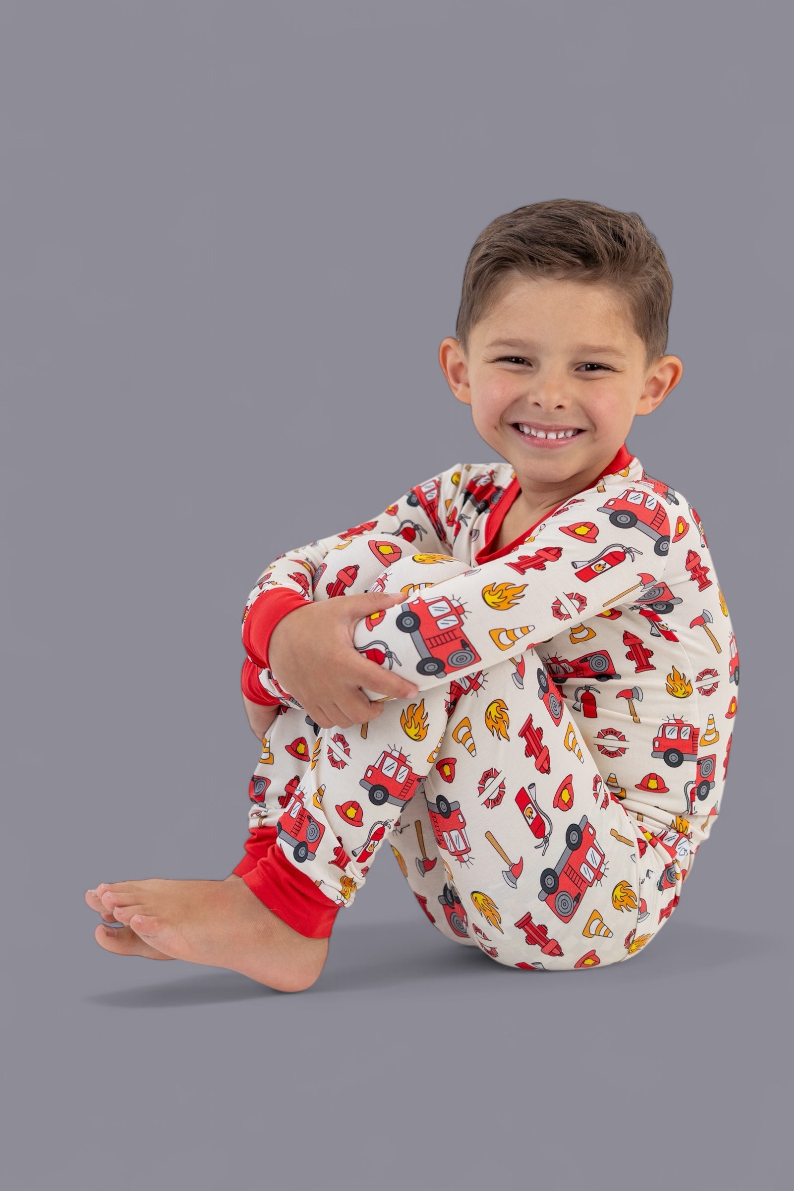Gear up your little hero for a night of adventure with the Firehouse Heroes Dream Set! Designed for the future firefighters in your life, this pajama set features a bold and action-packed print showcasing fire trucks, helmets, axes, hydrants, and more! With a blazing red, orange, and yellow color palette, these pajamas are a tribute to the brave men and women who answer the call.