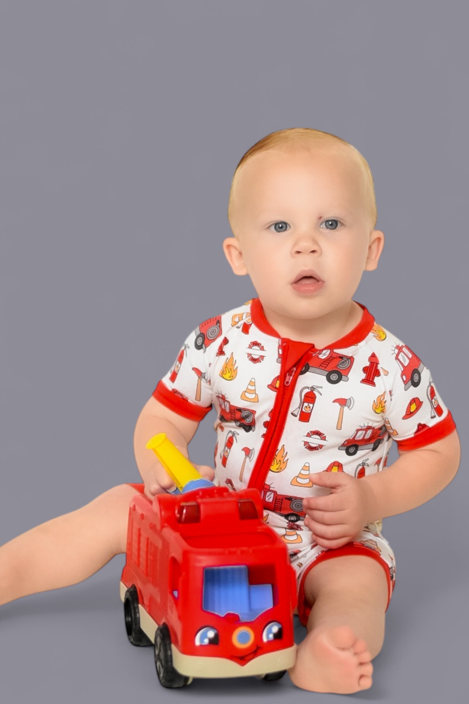 Sound the alarms — ultimate comfort has arrived! Our Firehouse Heroes Dream Shortie is the perfect mix of cozy softness and big adventure, designed to keep your little hero cool, comfy, and ready for action. Whether it’s a full day of play or a quick catnap between rescues, this short romper is built for all-day fun.