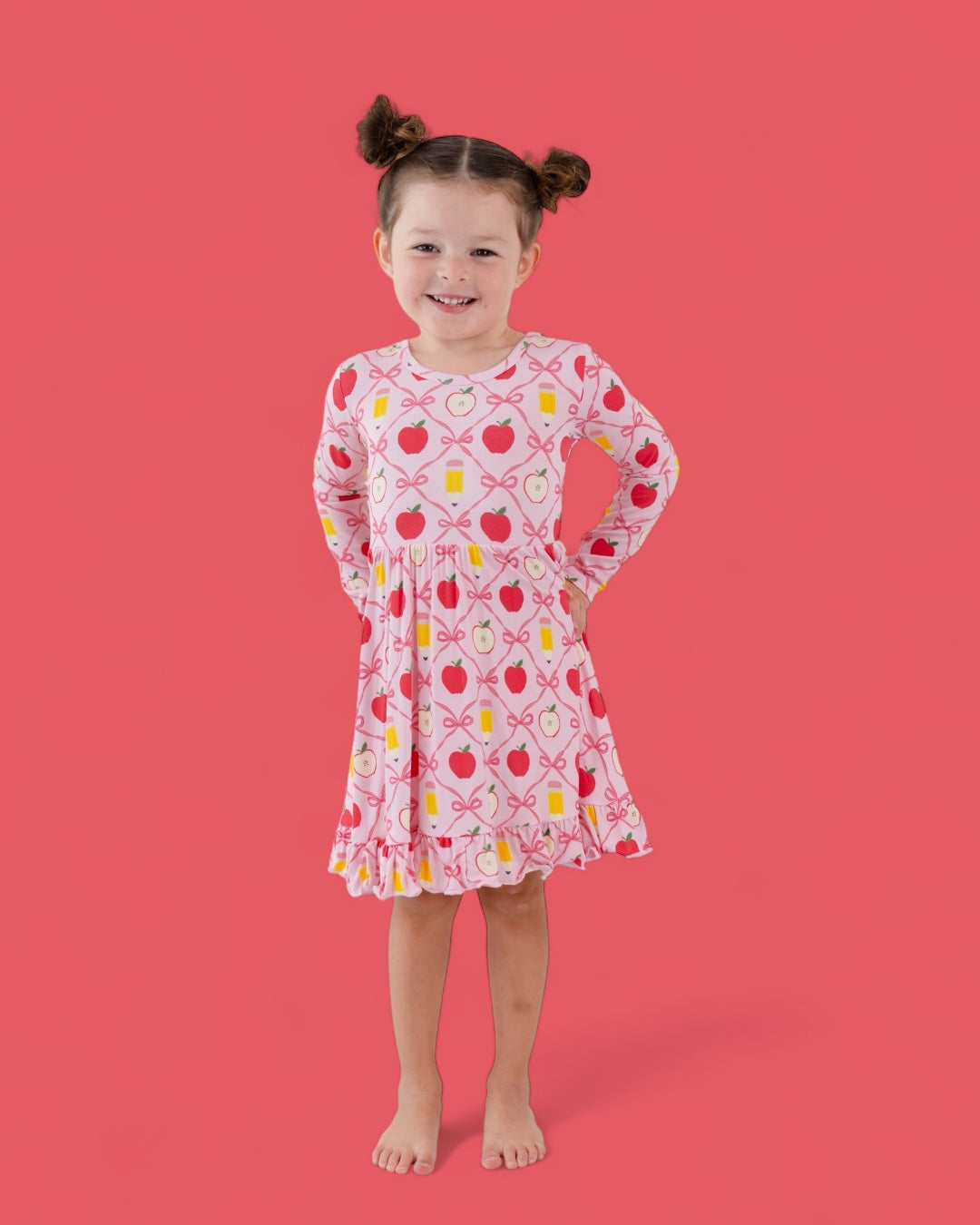 Twirls, ruffles, and a whole lot of charm! The Pencils & Bows Dream Ruffle Dress features a school-ready print of apples, pencils, and bows on a soft pink backdrop—perfect for first-day photos, teacher meet-and-greets, or just looking adorable every day. Made with buttery-soft fabric and finished with playful ruffle details, it’s comfy, cute, and top of the class in style!