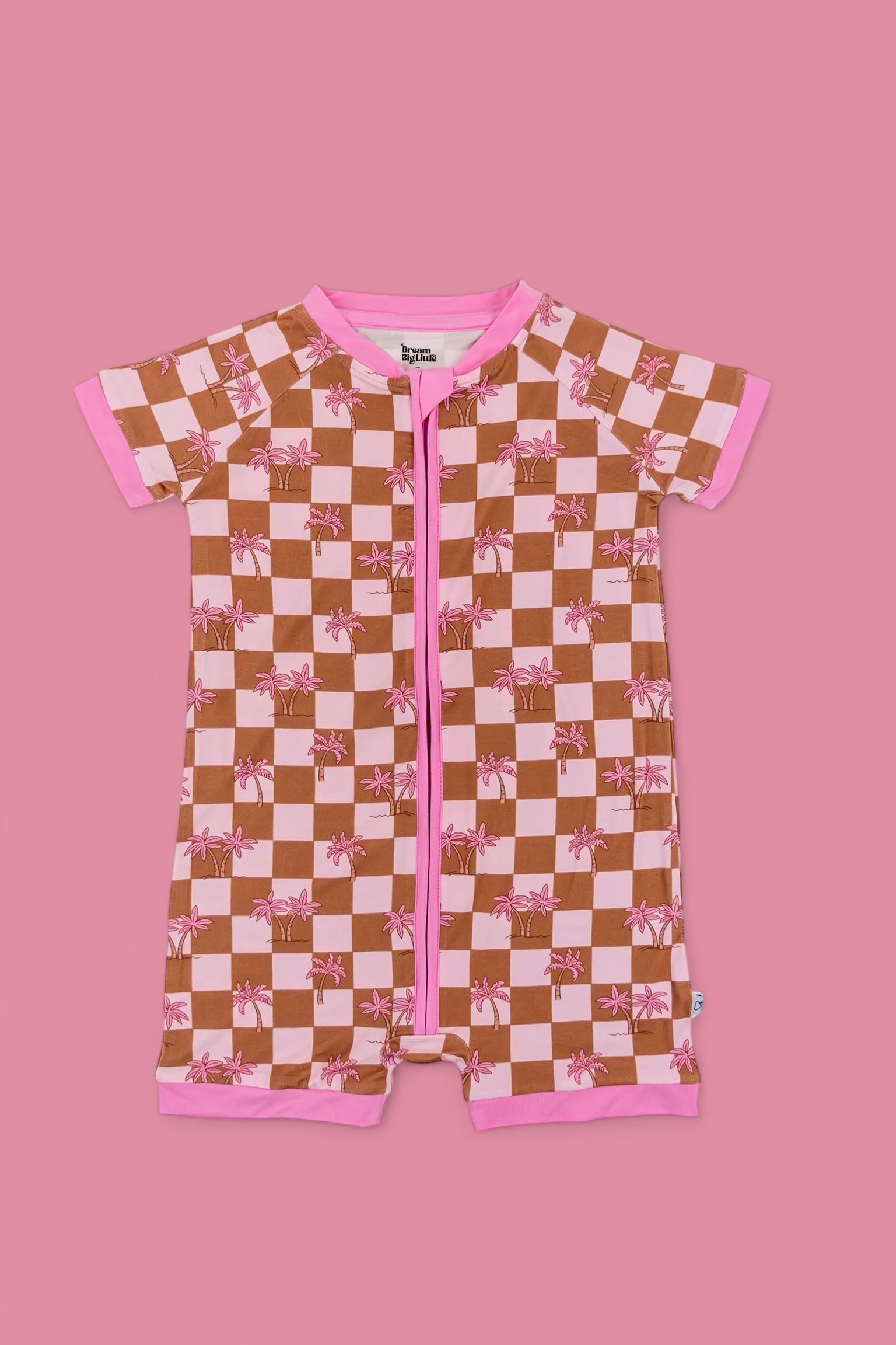 Say hello to sunshine-ready comfort with our Sunset Beach Checkers Dream Shortie! This adorable short romper is made for easygoing summer days—whether your little one is heading into playtime fun or drifting off into a cozy nap. Featuring our signature warm brown and soft pink checkerboard print with whimsical pink palm trees, this piece brings total tropical charm to your babe’s wardrobe.