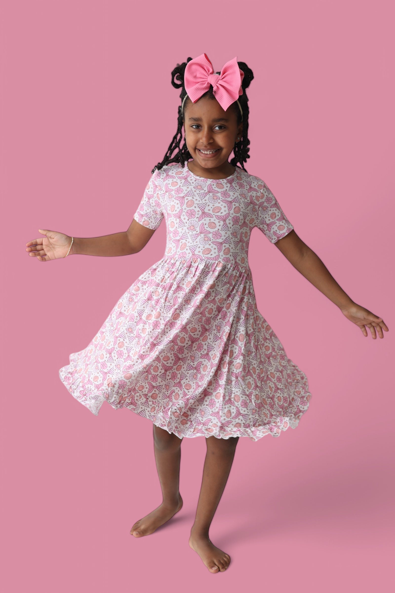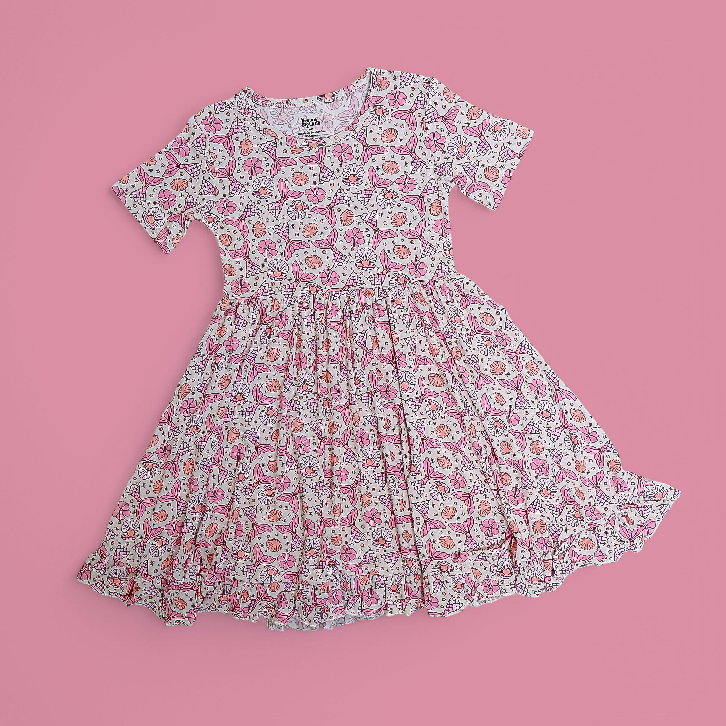 Let the twirling begin! The Magical Mermaid Dream Ruffle Dress is made for playdates, parties, and magical moments in between. Featuring our enchanting mermaid print with twirling tails, seashells, and sparkly stars in soft, dreamy pinks — it’s everything your little one needs to spin in style.