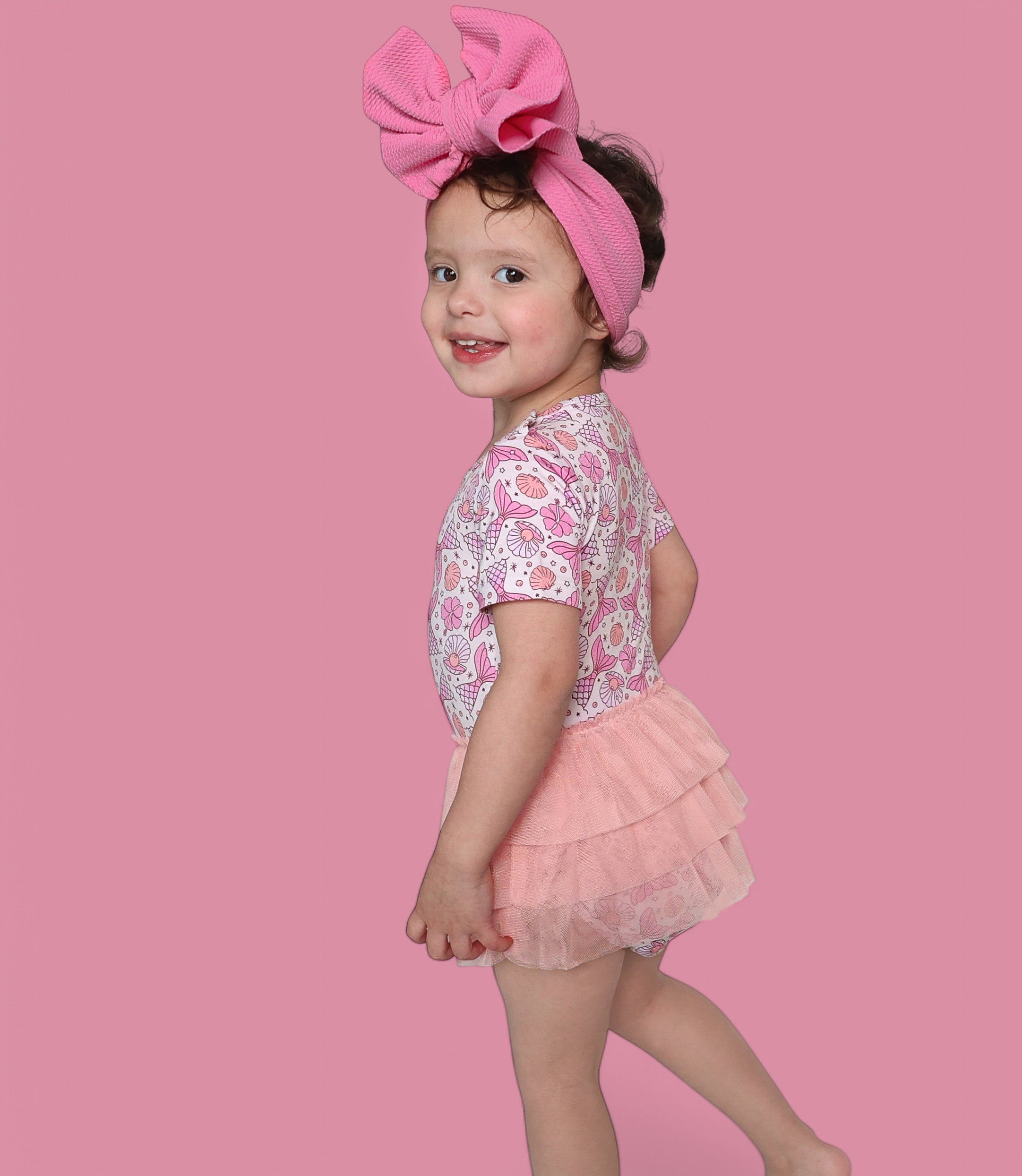 Get ready to make waves with the Magical Mermaid Dream Tutu Bodysuit Dress — the perfect outfit for party moments, photo ops, and everyday sparkle! Featuring our whimsical mermaid print with twirling tails, sparkly stars, and seashell treasures in dreamy pinks, this one-piece is as magical as your little one.
