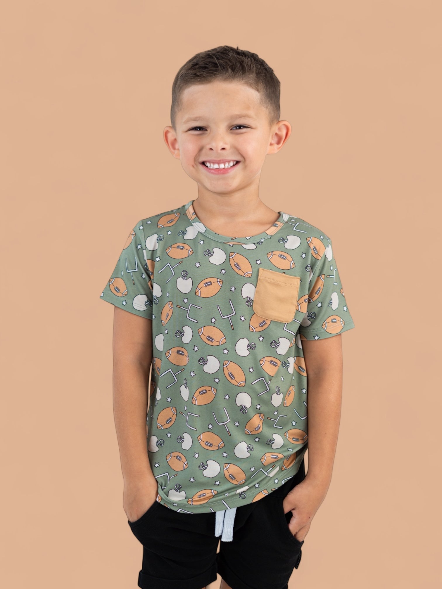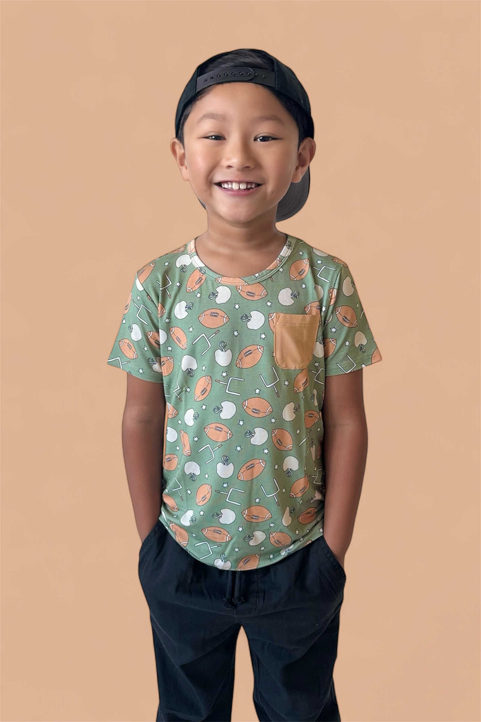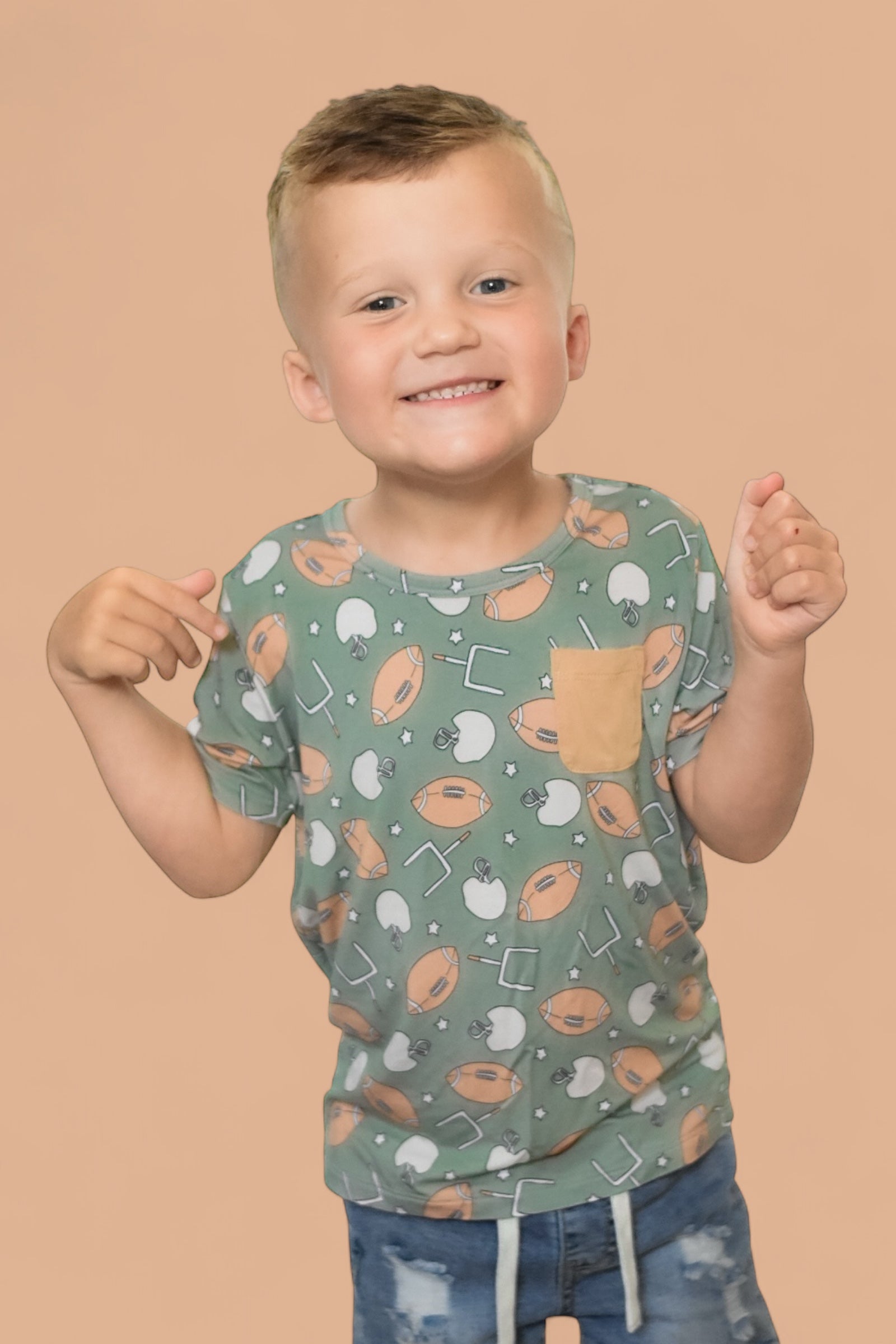 Score big on style and comfort with our Autumn Kickoff Dream Pocket Tee! Featuring a sporty mix of footballs, helmets, and goalposts on a soft olive green background, this tee is perfect for your little fan’s fall wardrobe. Complete with a functional chest pocket and crafted from buttery-soft bamboo, it's made for everything from playtime to game time.