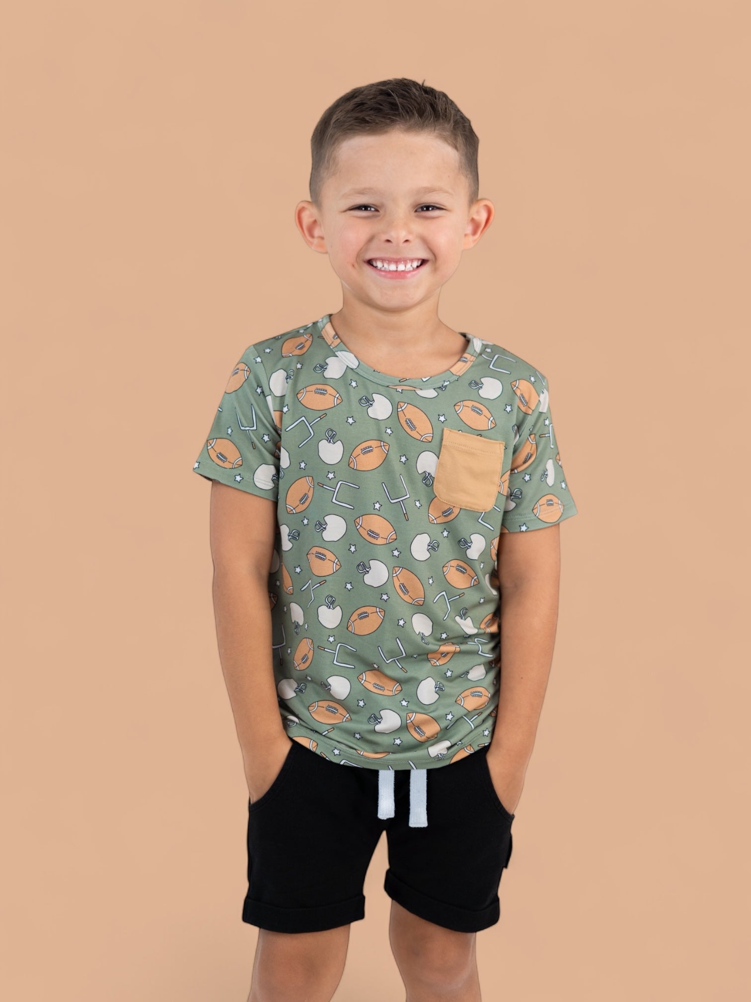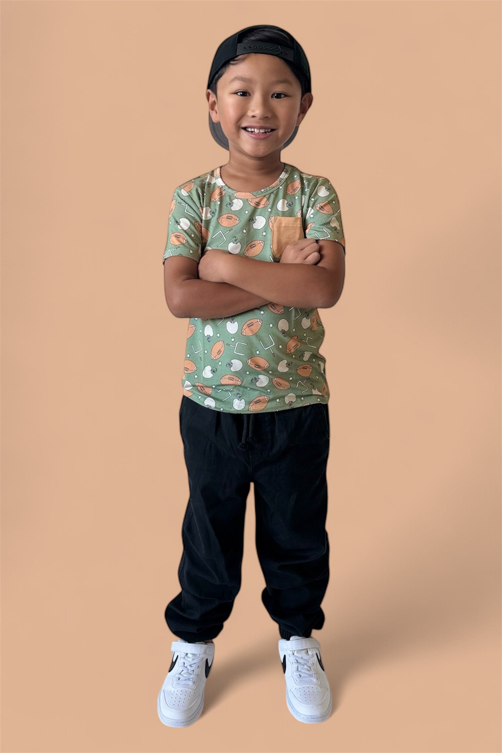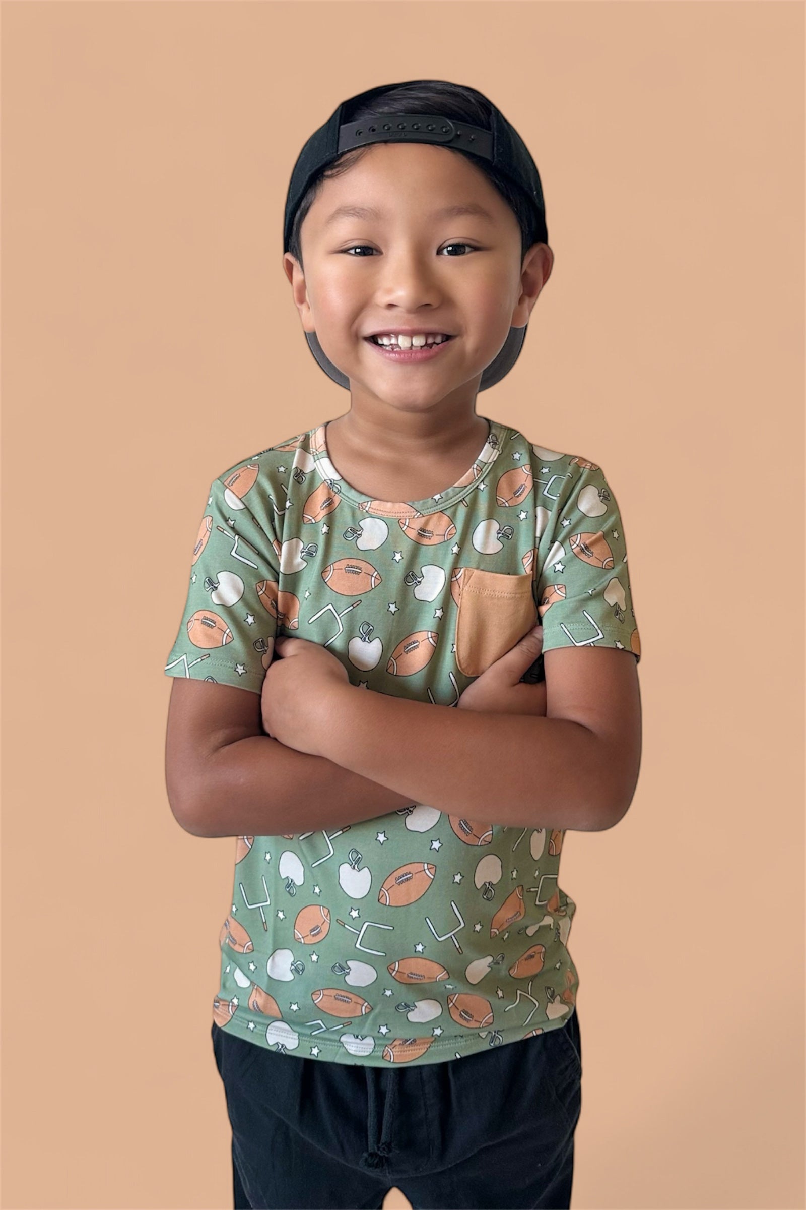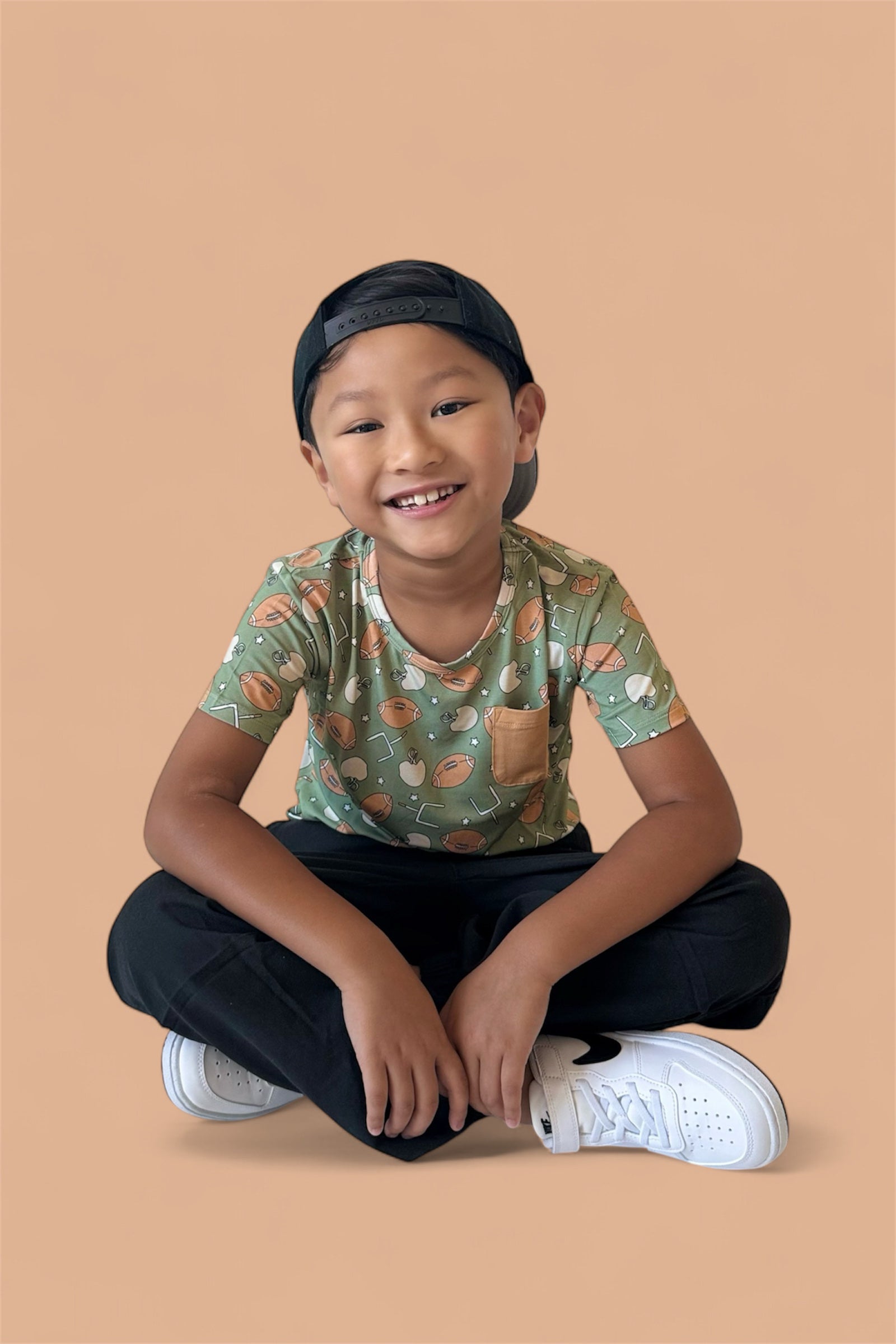 Score big on style and comfort with our Autumn Kickoff Dream Pocket Tee! Featuring a sporty mix of footballs, helmets, and goalposts on a soft olive green background, this tee is perfect for your little fan’s fall wardrobe. Complete with a functional chest pocket and crafted from buttery-soft bamboo, it's made for everything from playtime to game time.