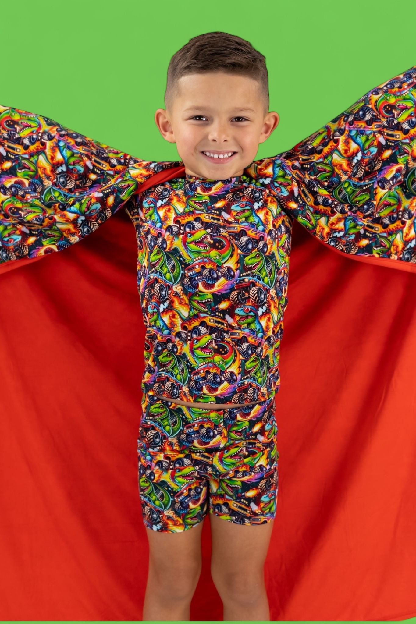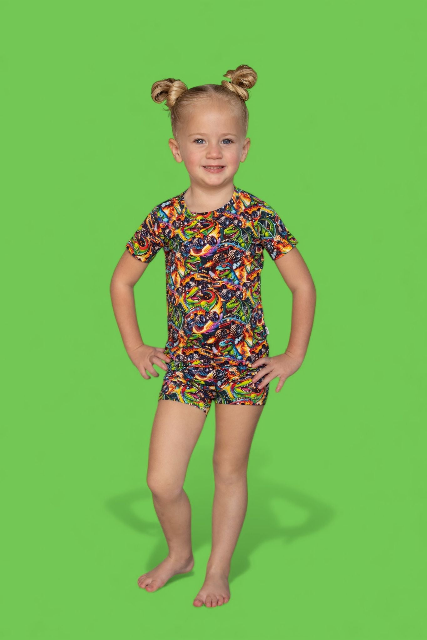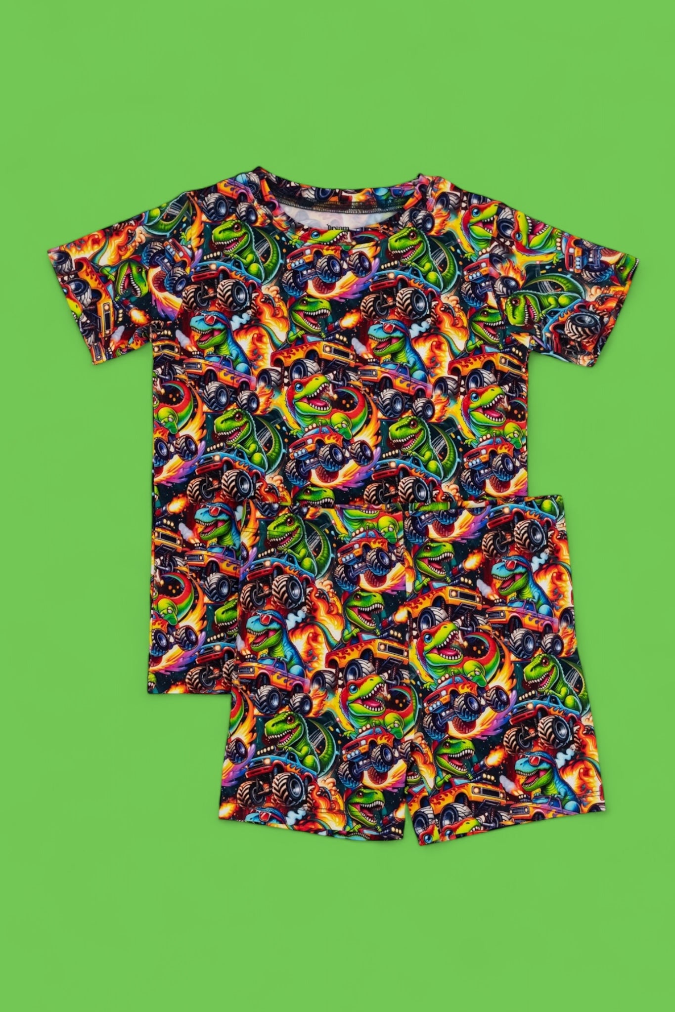 Get ready to race into adventure with our Roar and Rev Dream Short Set! Featuring a vibrant explosion of dino-sized power and monster truck madness, this matching tee-and-shorts combo is built for kids who play hard and dream even bigger.