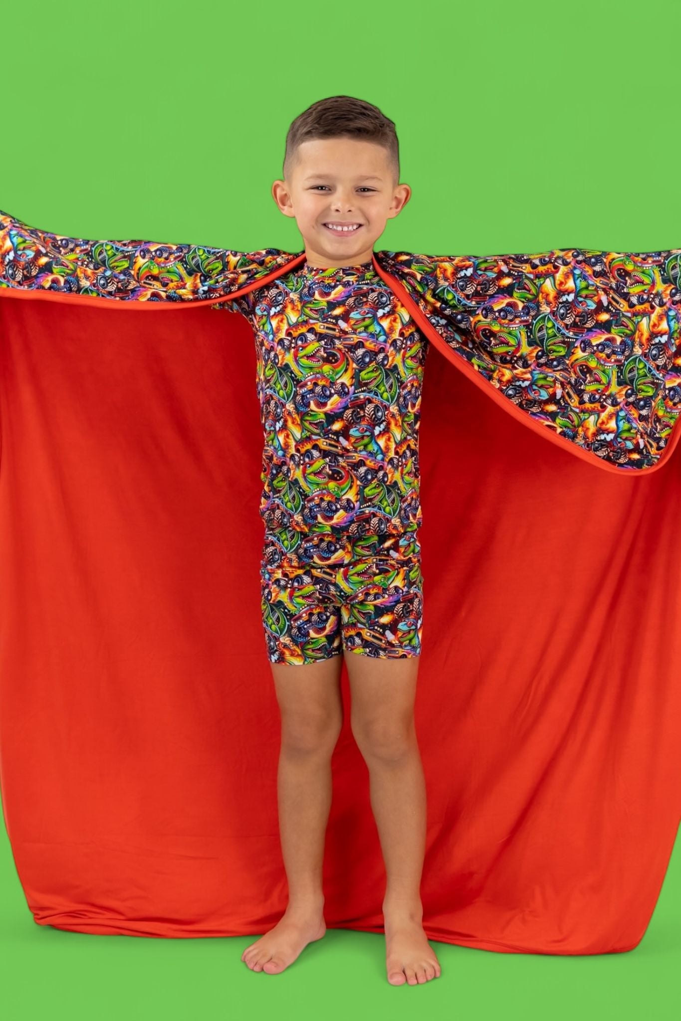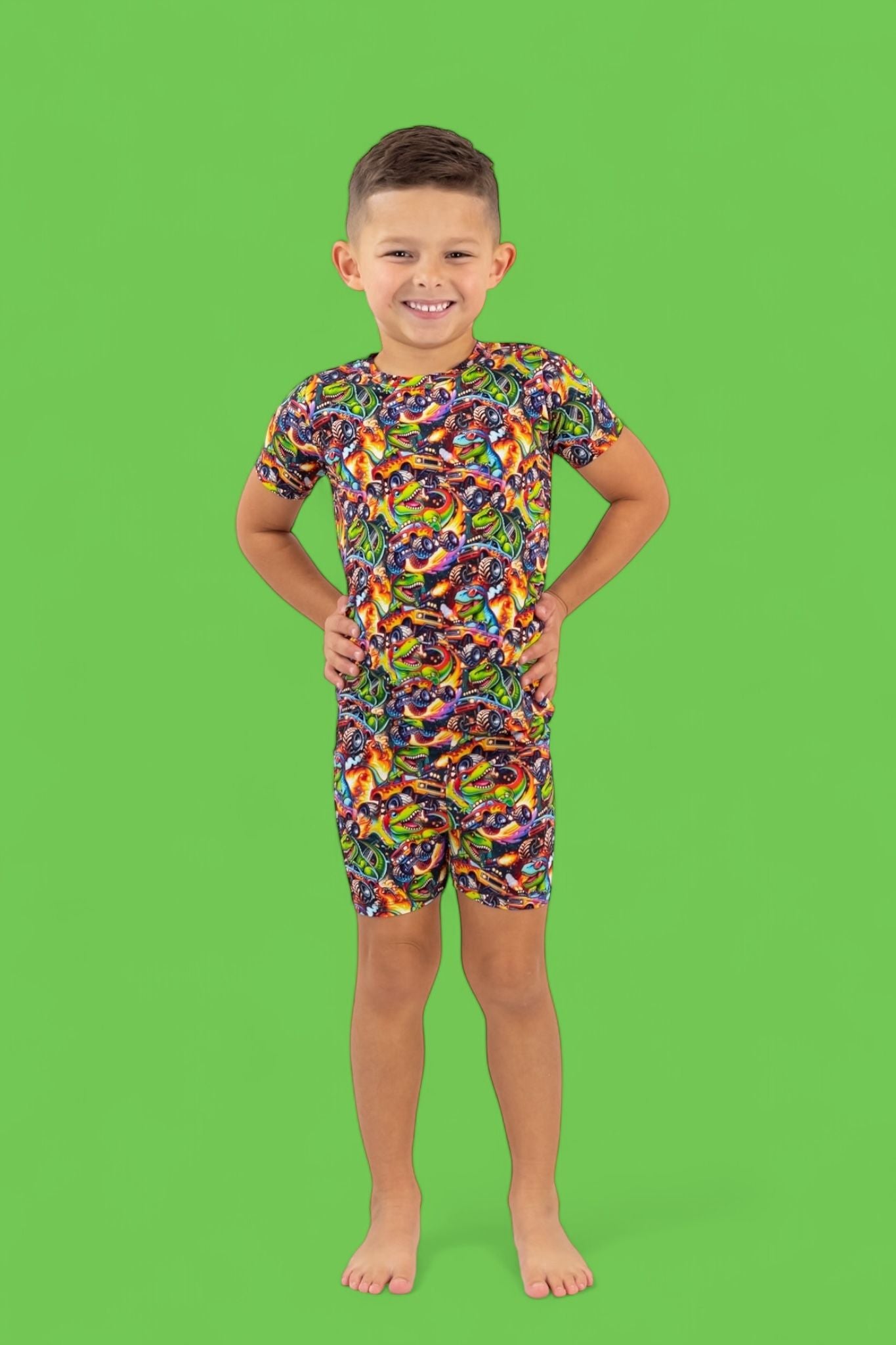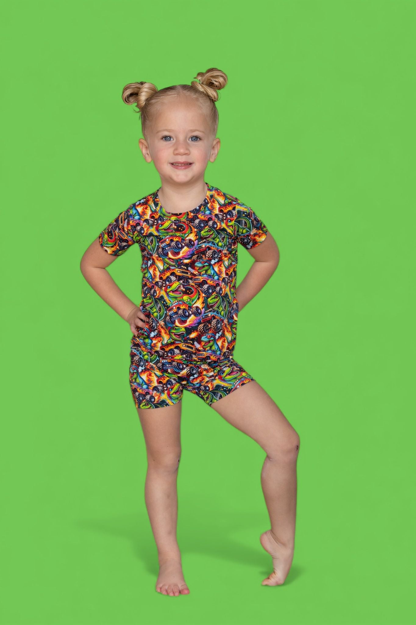 Get ready to race into adventure with our Roar and Rev Dream Short Set! Featuring a vibrant explosion of dino-sized power and monster truck madness, this matching tee-and-shorts combo is built for kids who play hard and dream even bigger.