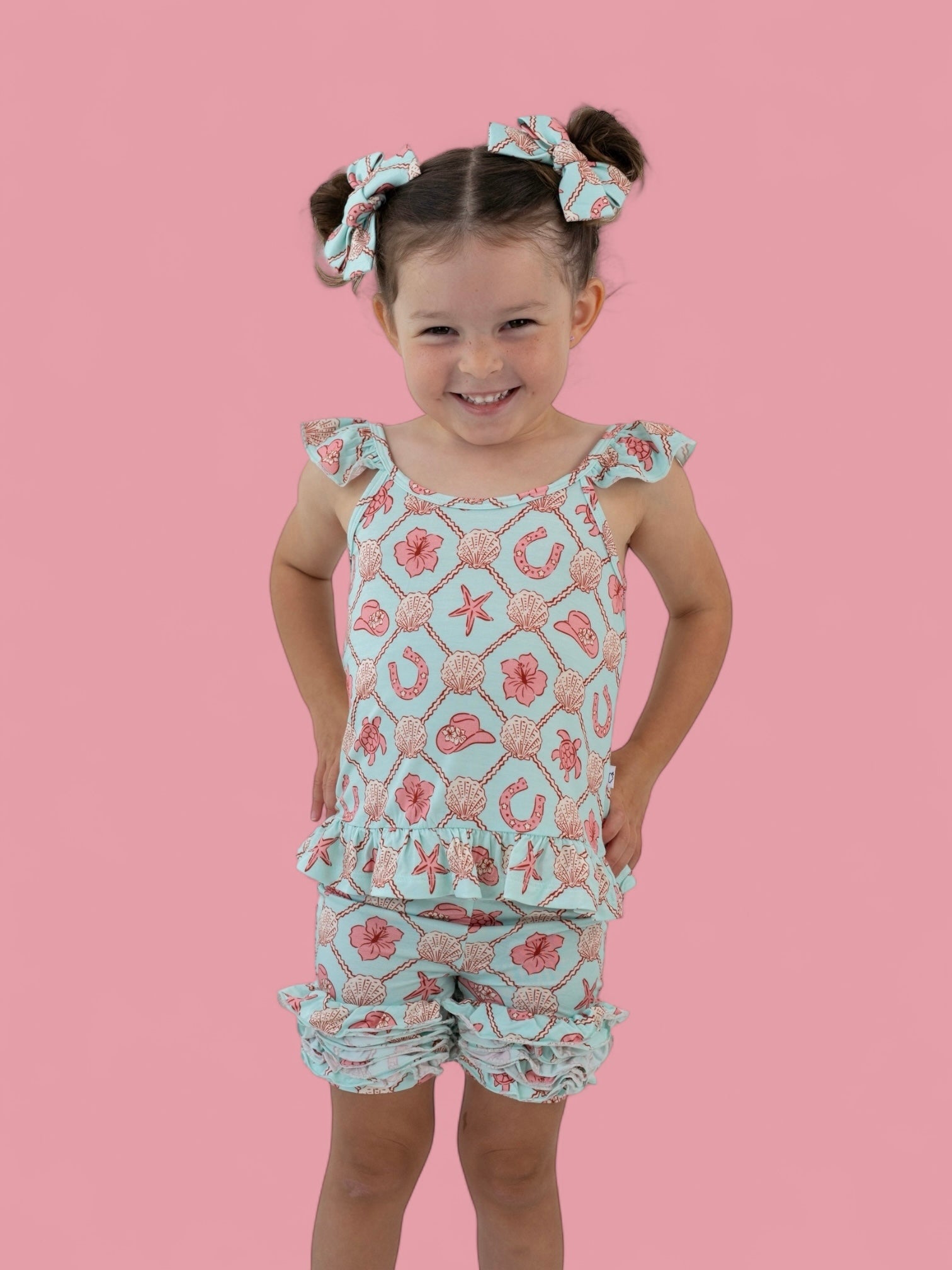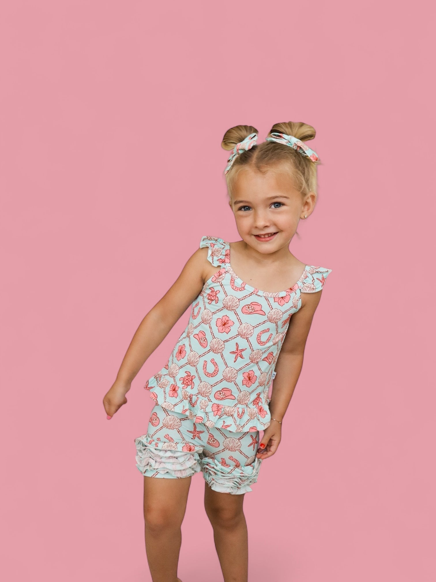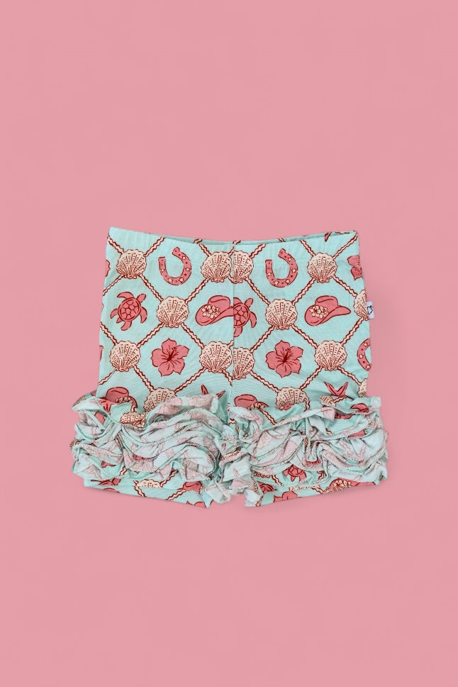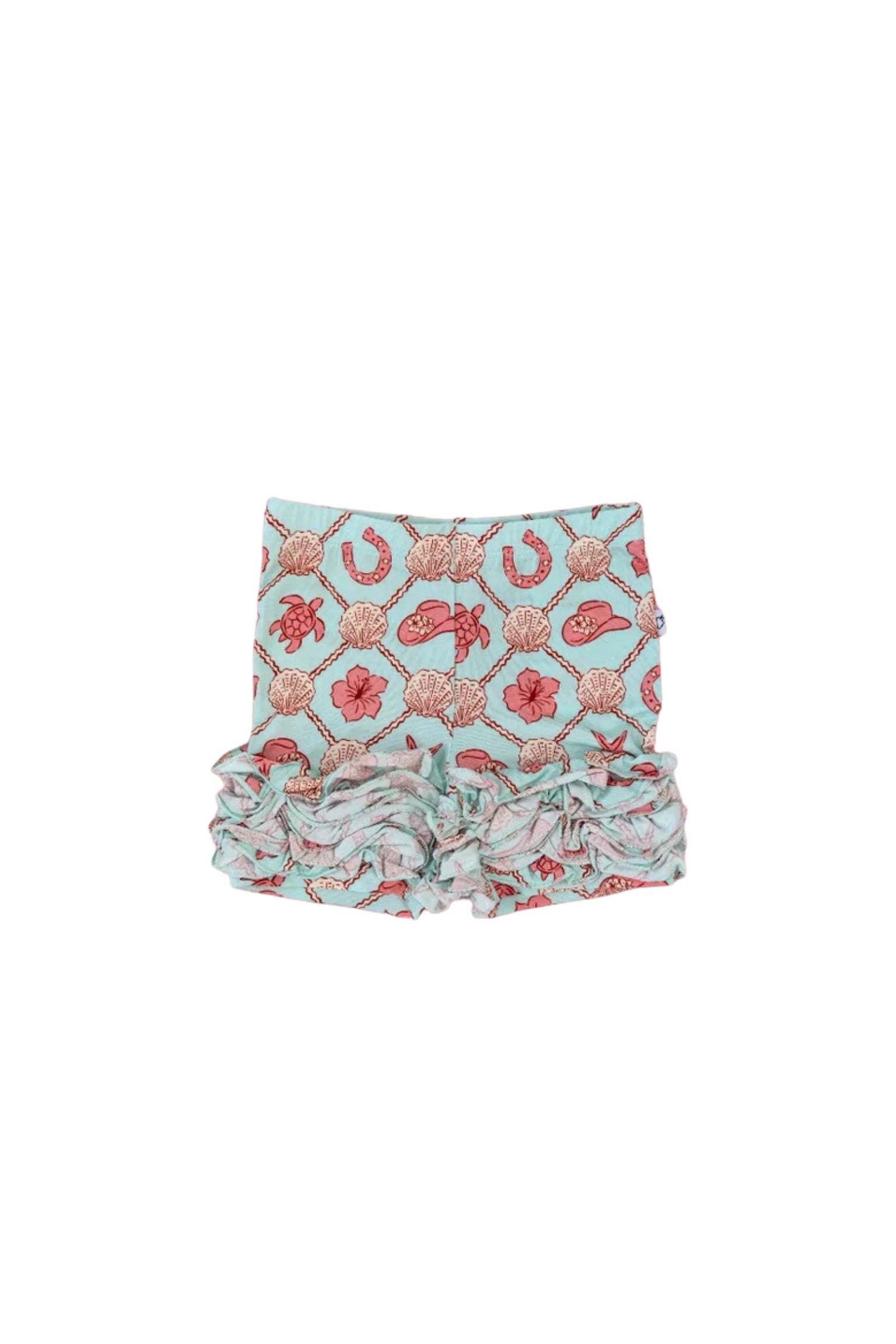 Whether wrangling seashells or heading out for playdates, the Coastal Cowgirl Dream Ruffle Shorts are ready to ride into summer with style and comfort!