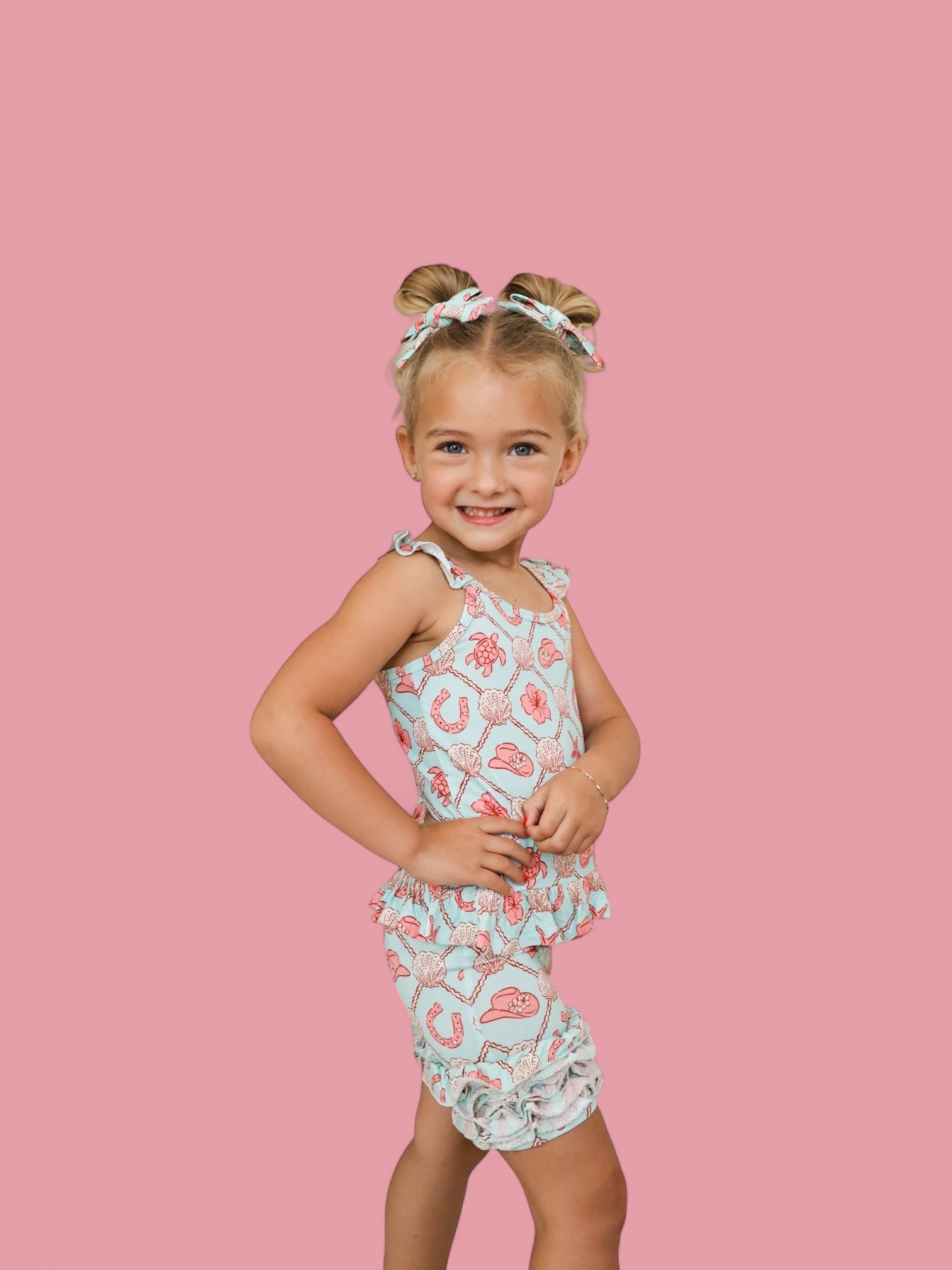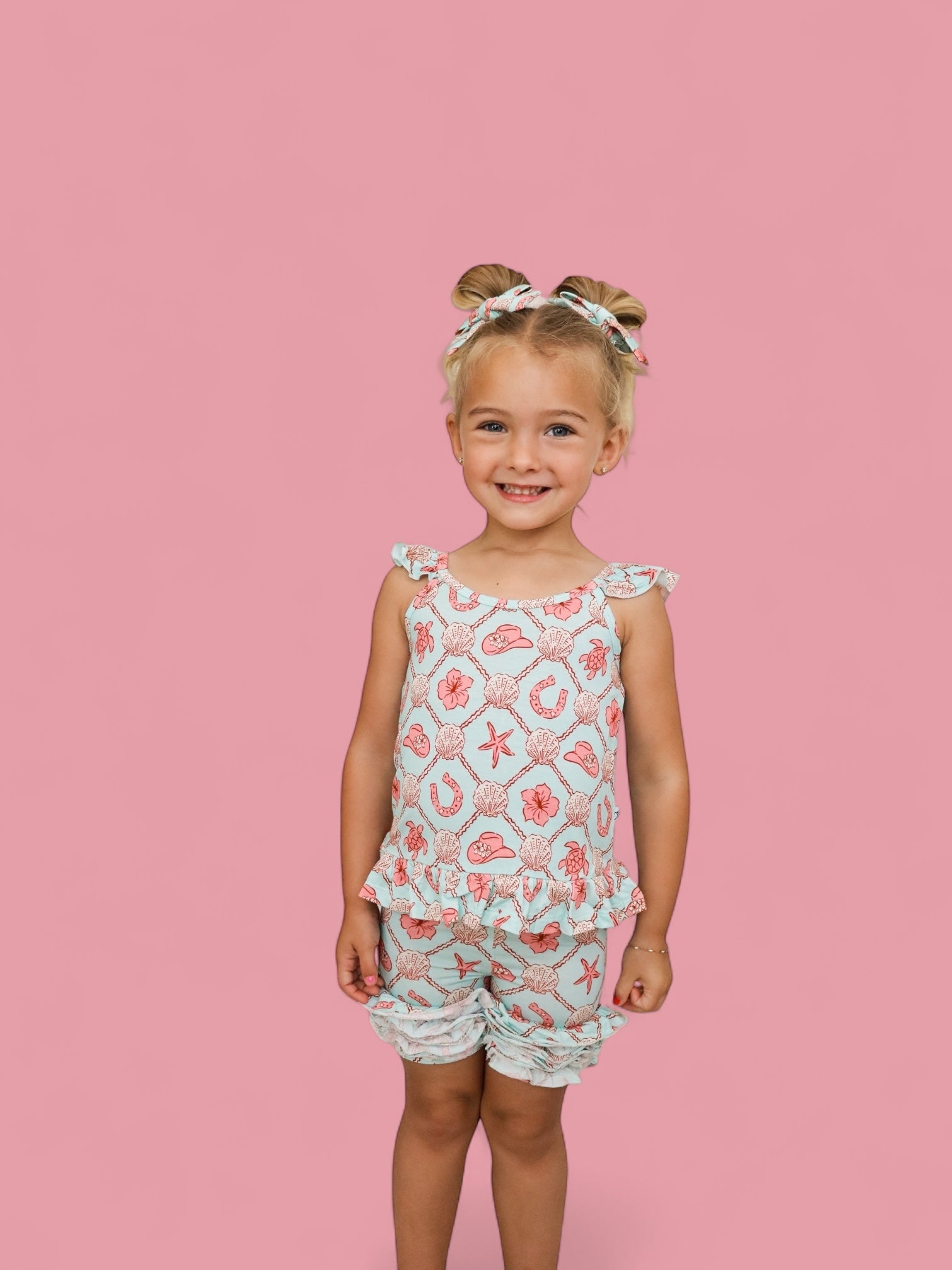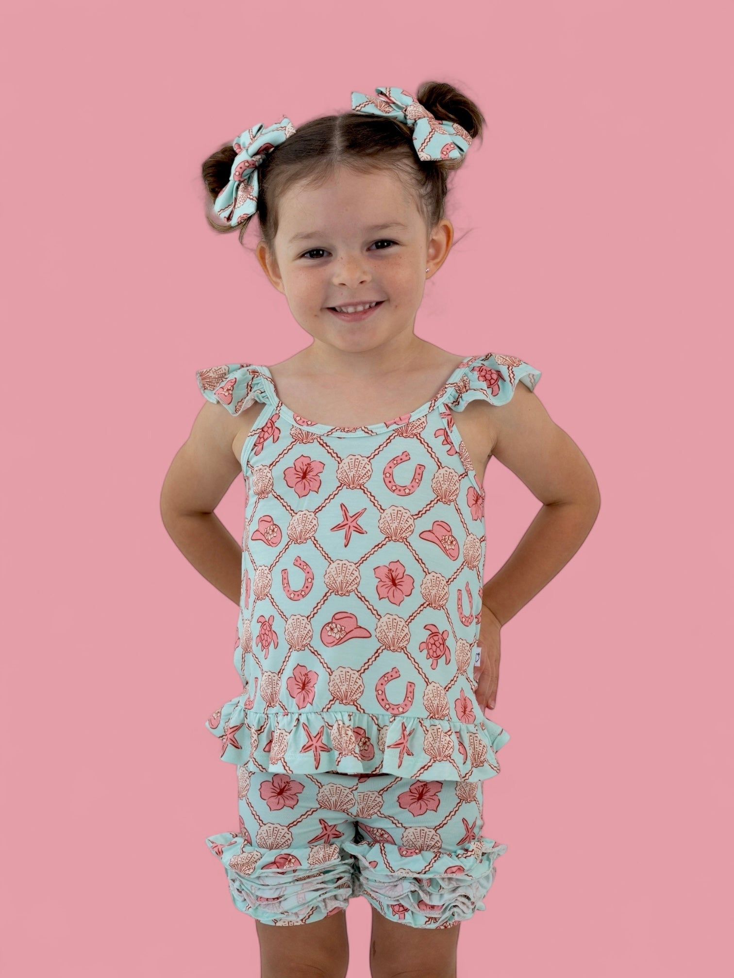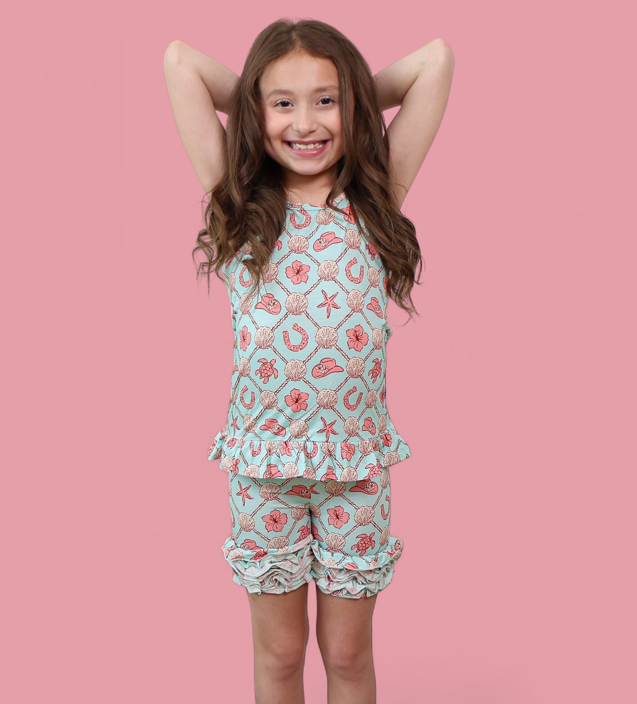 Whether wrangling seashells or heading out for playdates, the Coastal Cowgirl Dream Ruffle Shorts are ready to ride into summer with style and comfort!