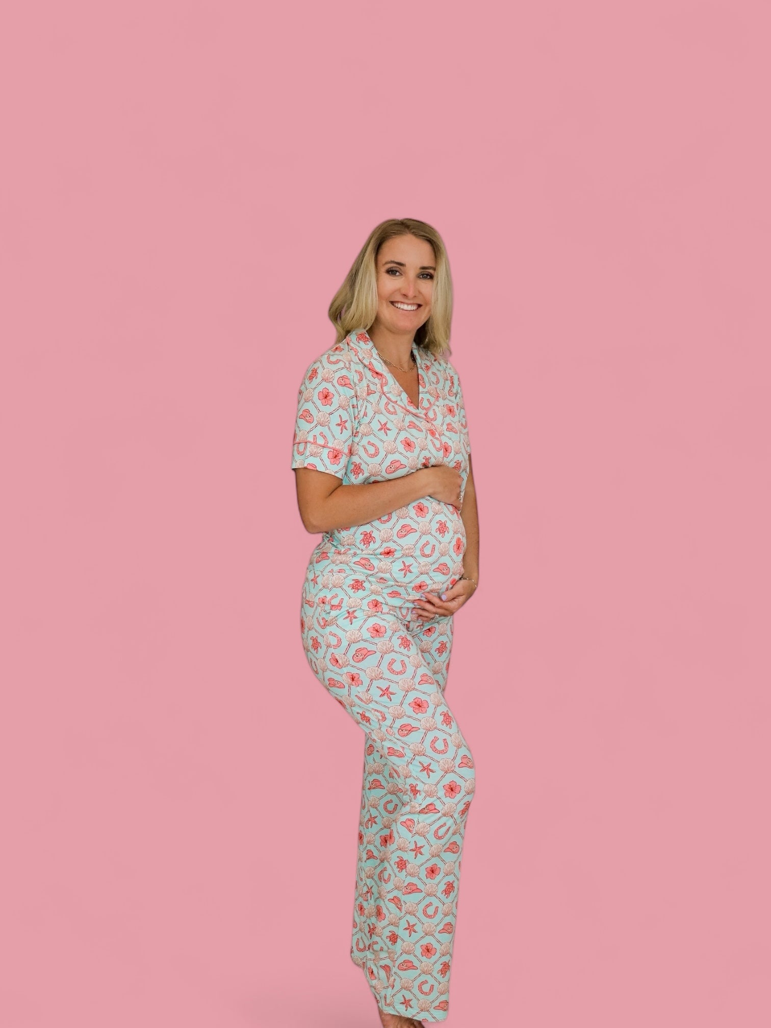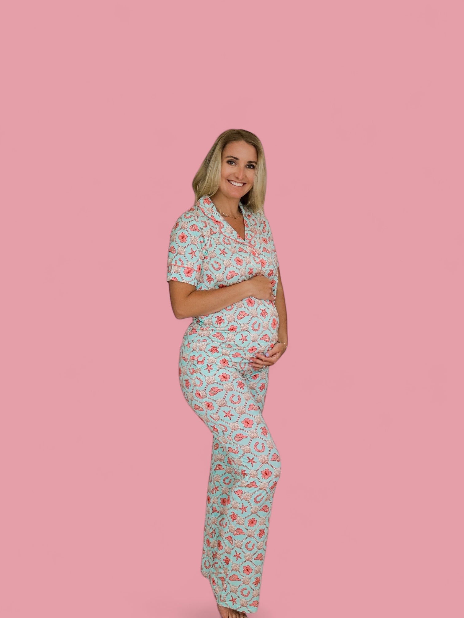 The top features a relaxed button-down design with chest pocket and piping trim—perfect for effortless nursing access and elevated comfort. Paired with breezy flare pants, this set offers the perfect balance of laid-back luxury and all-day wearability. Crafted from our buttery-soft bamboo viscose and finished with our signature tag-less DreamyZzz comfort, you'll never want to take it off.