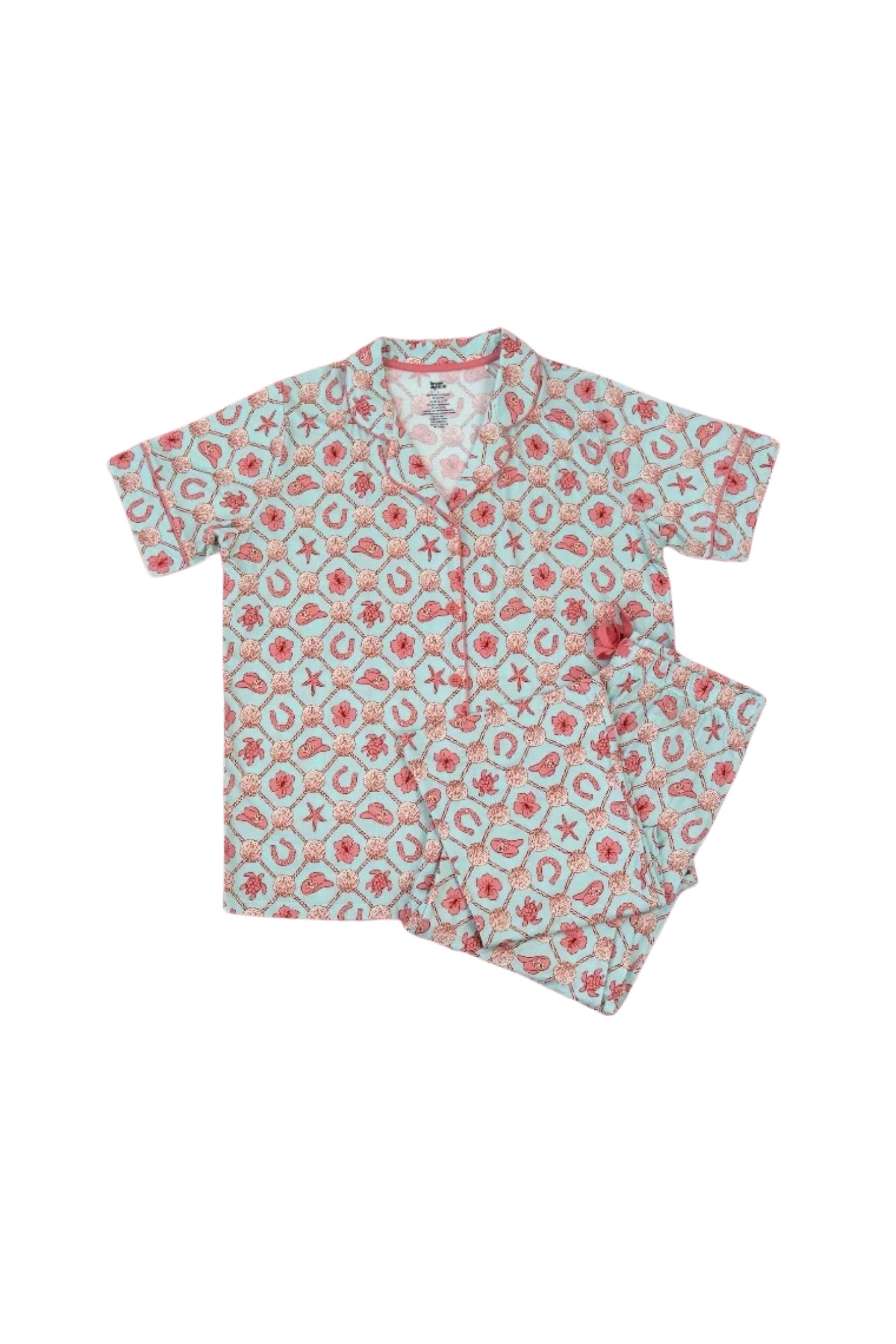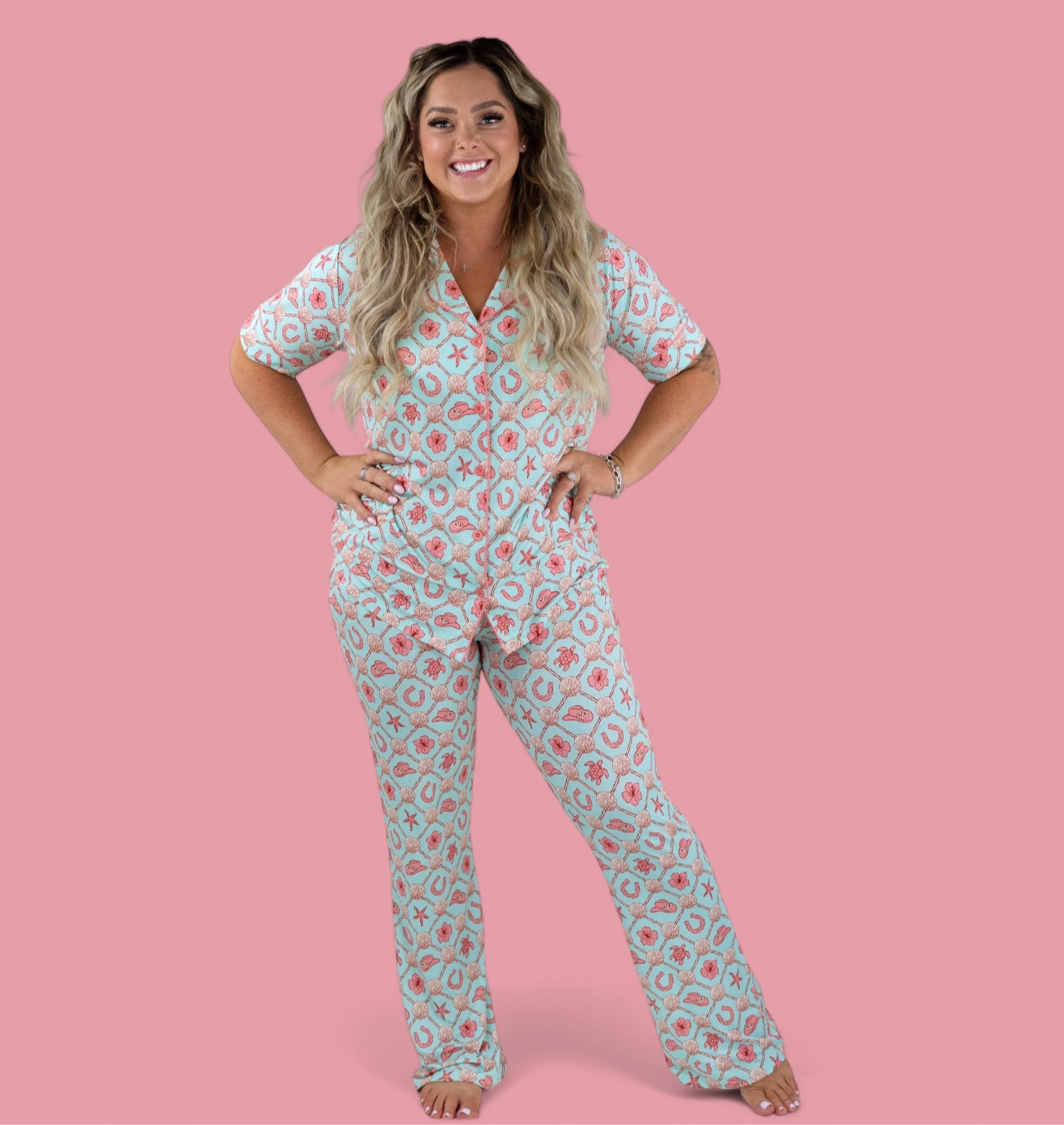 The Coastal Cowgirl Women’s Relaxed Flare Dream Set blends softness, style, and functionality in the dreamiest way. Featuring our signature seaside-western print with floral cowgirl hats, seashells, and sun-kissed accents on a soft blue backdrop, this set is made for slow mornings and cozy evenings.
