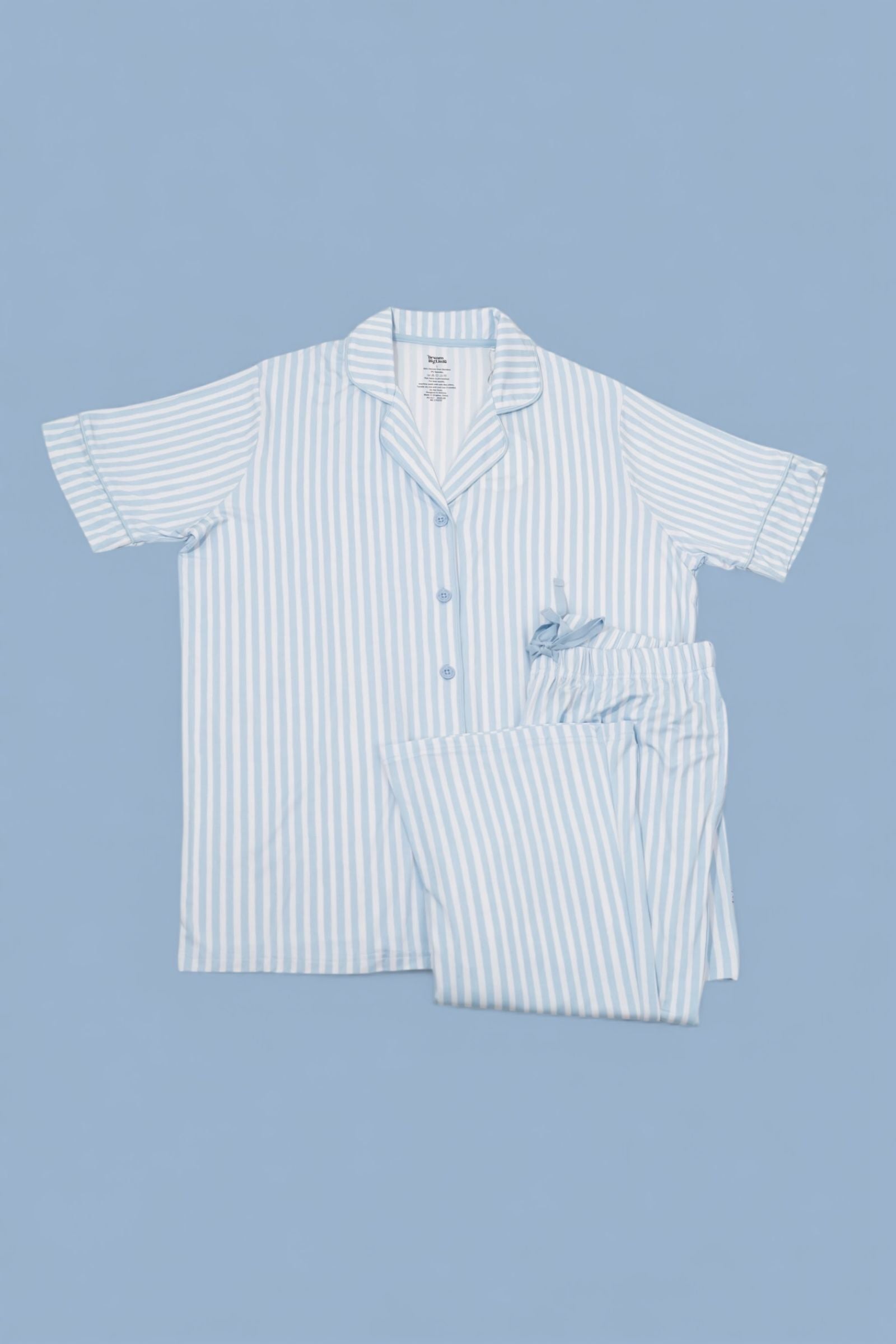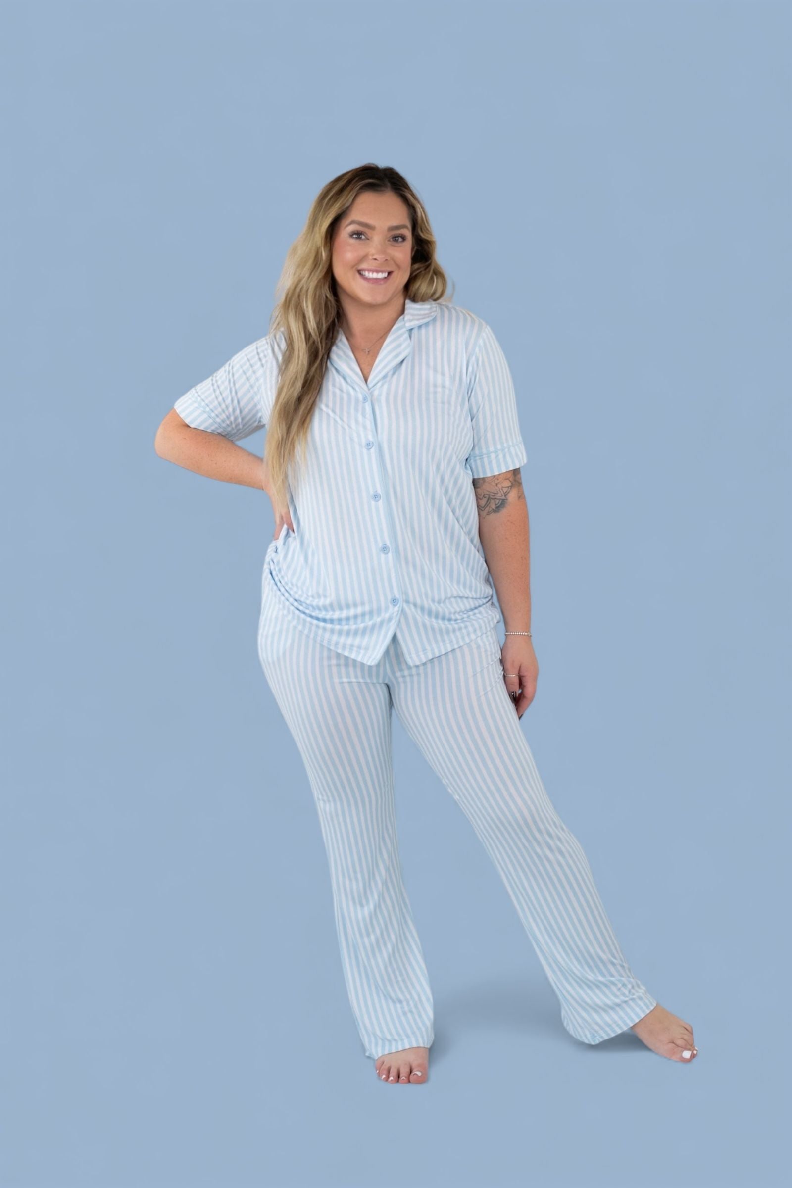 Classic stripes, endless comfort! The Seaside Stripe Women’s Dream Flare Set features a relaxed short sleeve button-up top and matching flare pants in timeless blue-and-white stripes. Crafted from our signature buttery-soft bamboo fabric, this set is breathable, stretchy, and perfect for lounging, sleeping, or matching with your little ones.