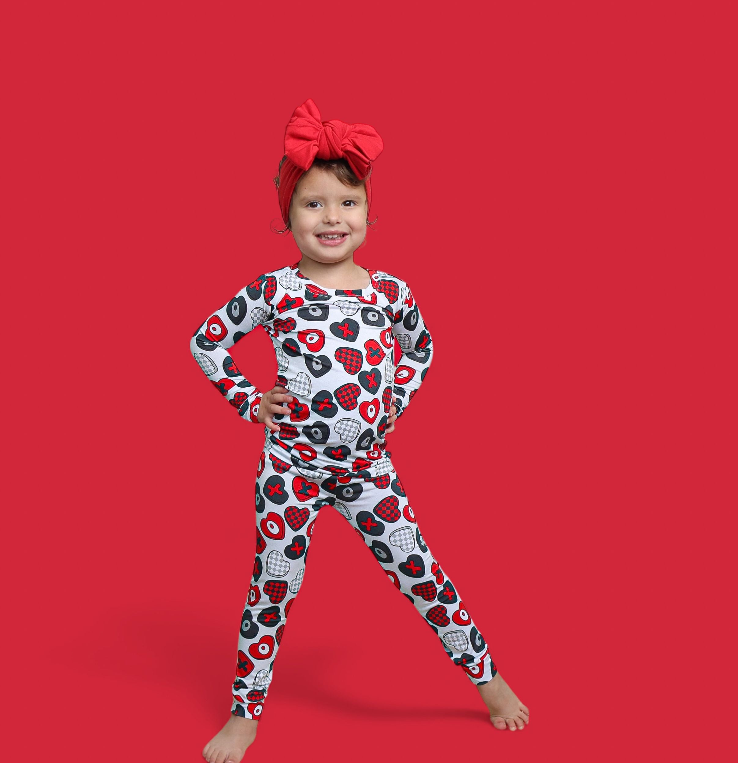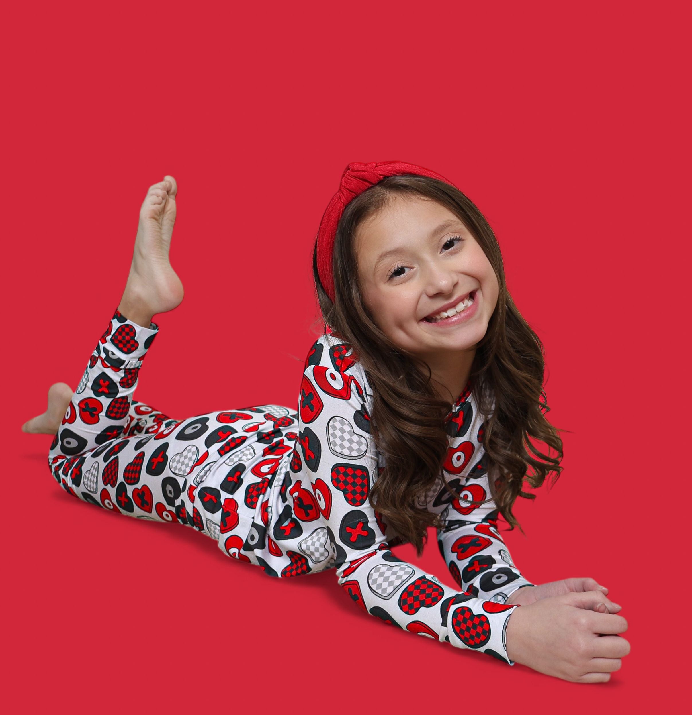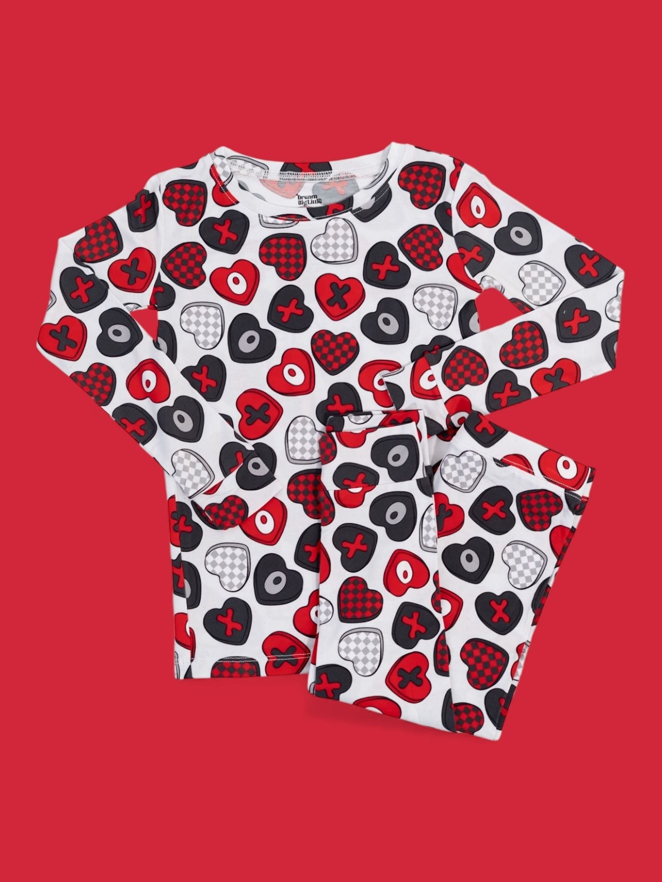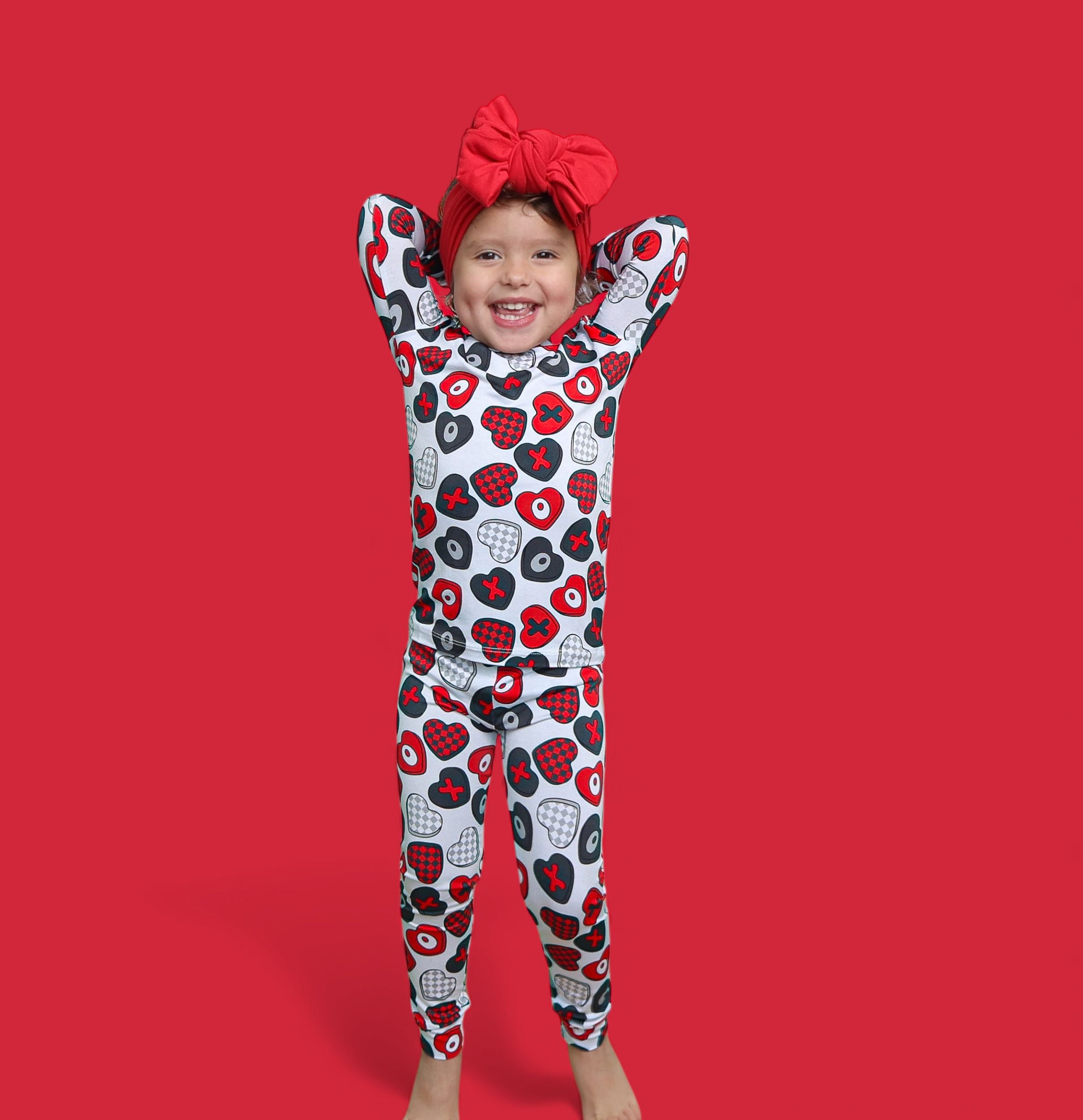 Cozy comfort with a pop of love! The Cross My Heart Dream Set features a long sleeve top and matching pants covered in playful hearts and X’s in shades of red, black, and white. Made from our signature buttery-soft bamboo fabric, this set is stretchy, breathable, and perfect for lounging, playing, or drifting into sweet dreams.