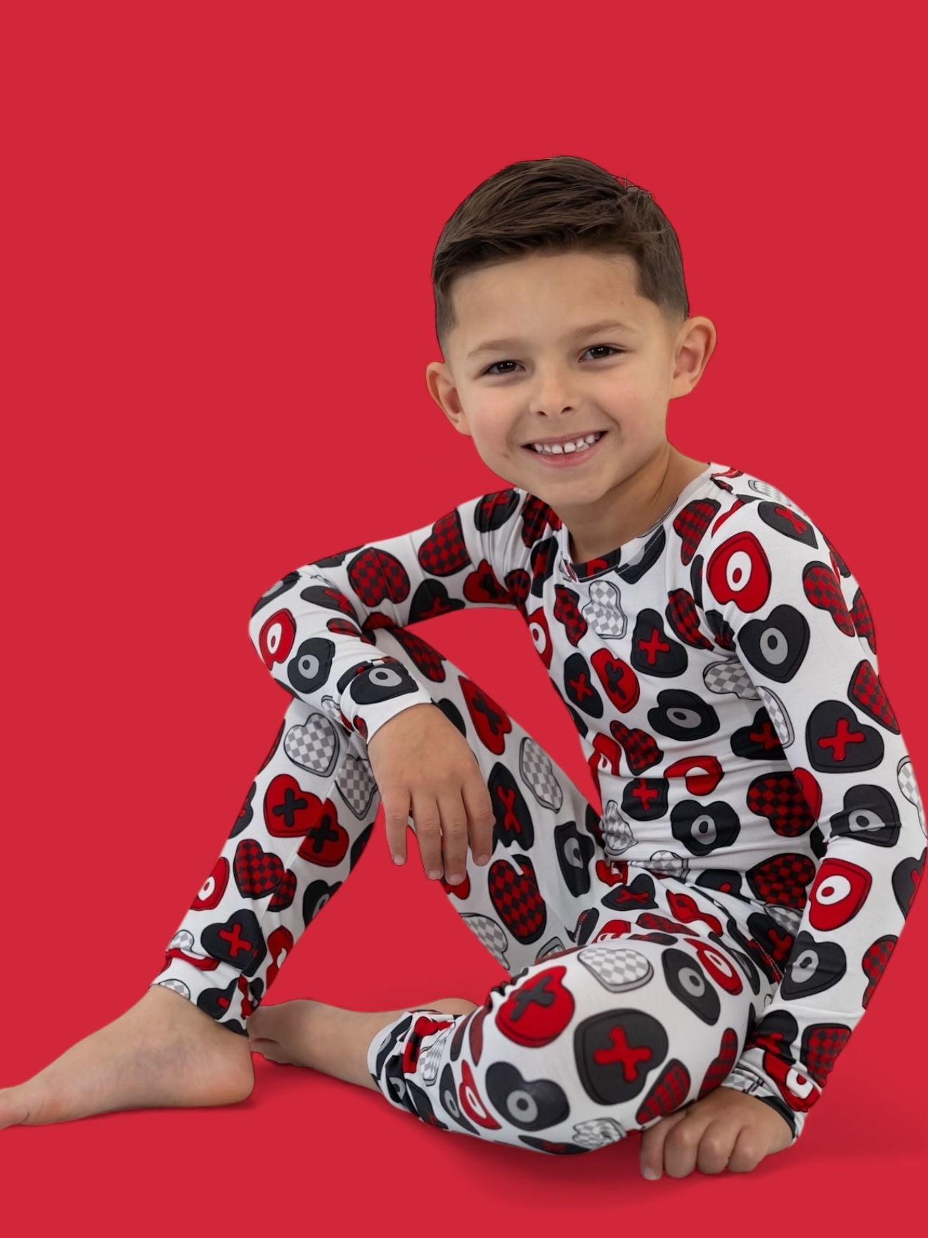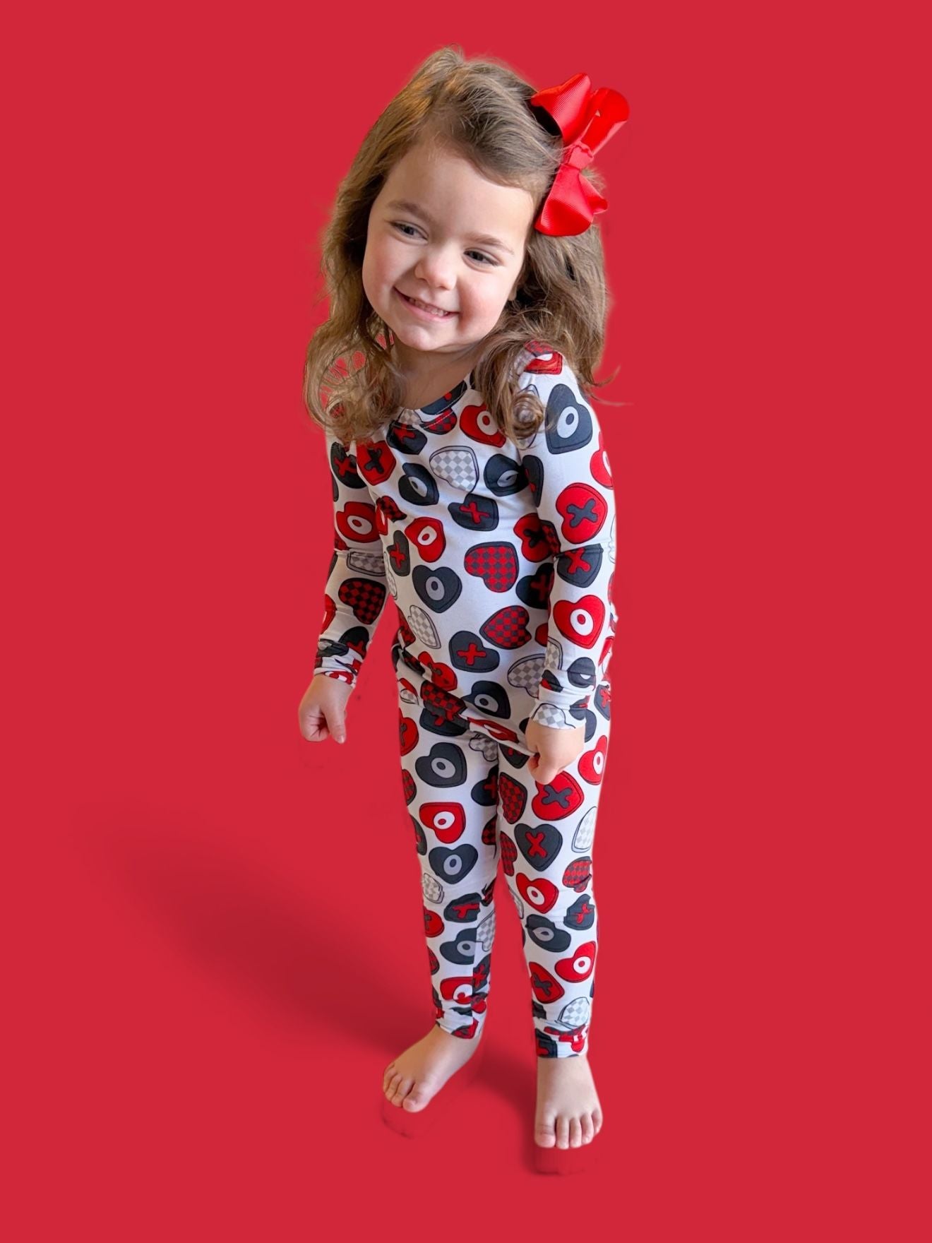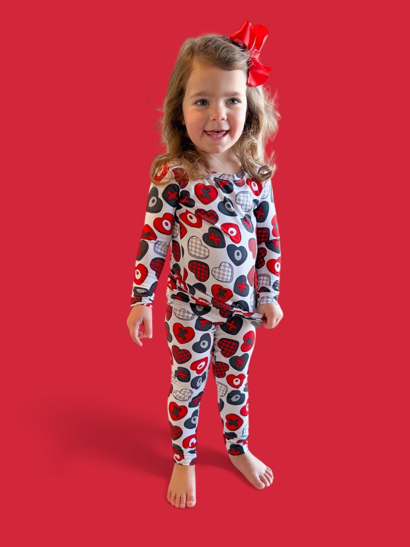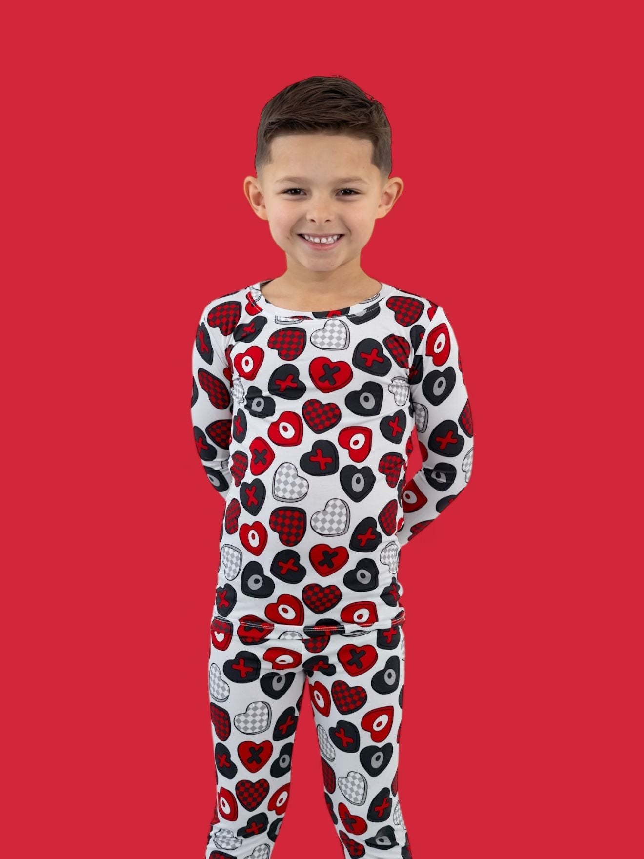 Cozy comfort with a pop of love! The Cross My Heart Dream Set features a long sleeve top and matching pants covered in playful hearts and X’s in shades of red, black, and white. Made from our signature buttery-soft bamboo fabric, this set is stretchy, breathable, and perfect for lounging, playing, or drifting into sweet dreams.
