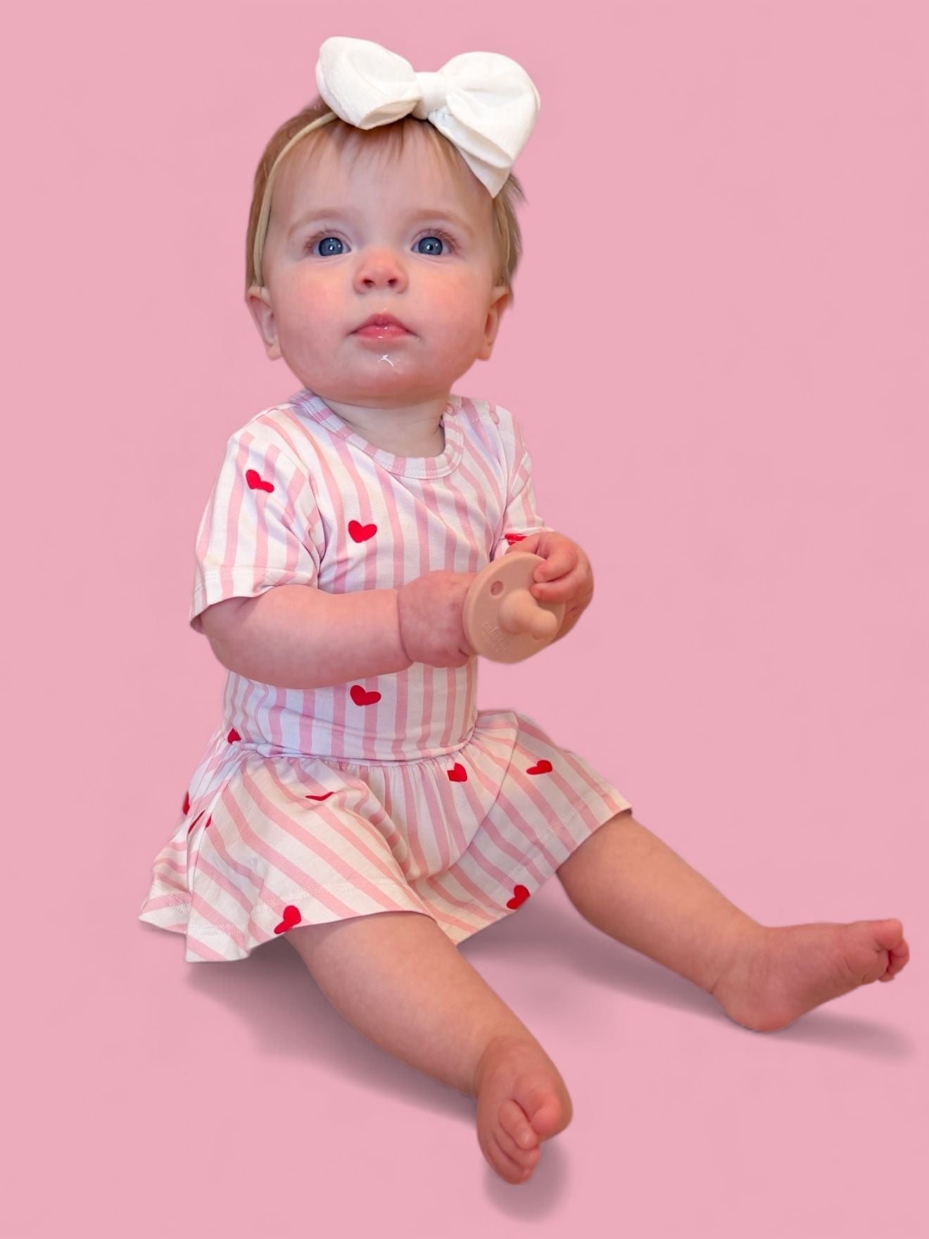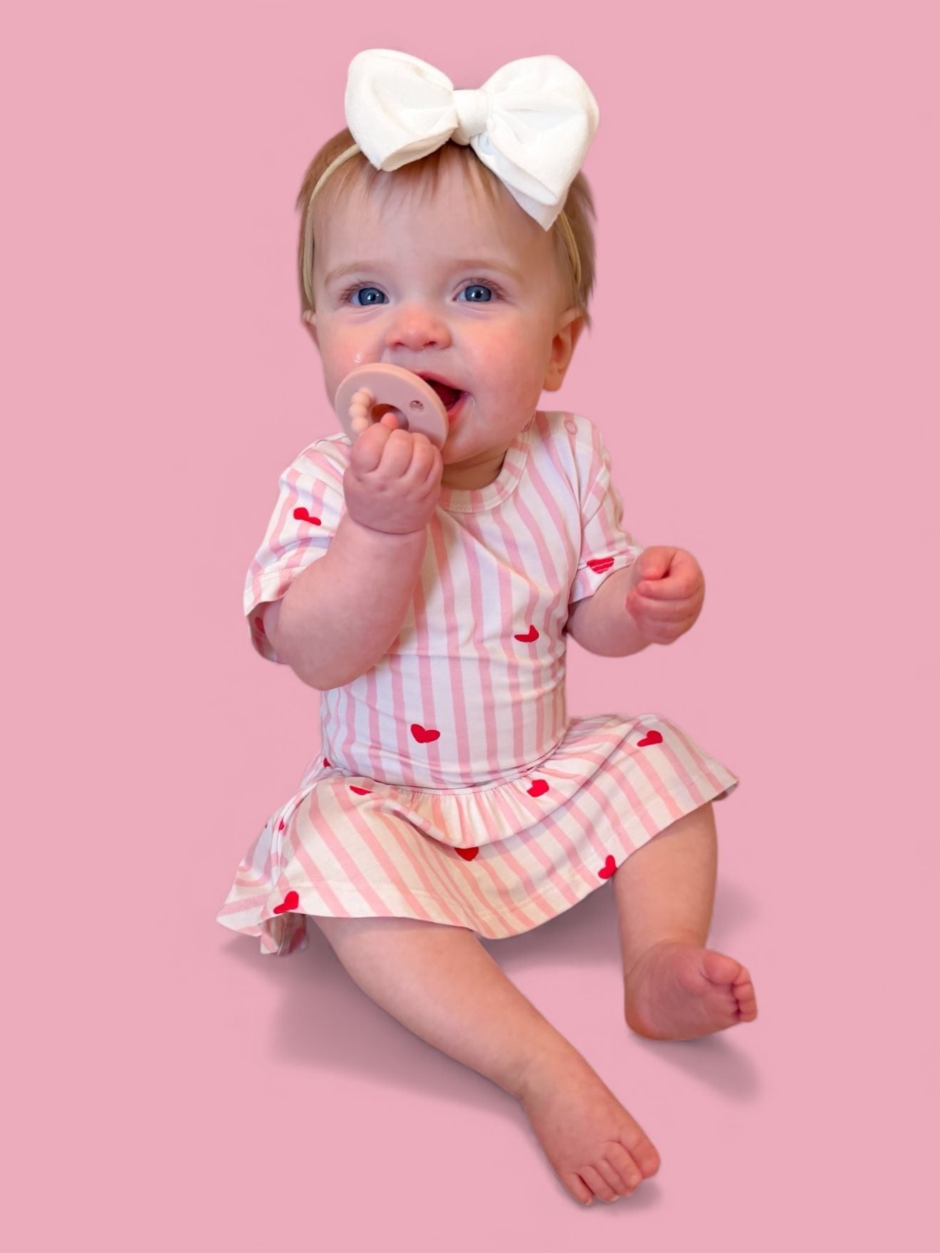 Your little one will look oh-so-sweet in our Sweetheart Stripes Dream Bodysuit Dress! This adorable piece combines the look of a fluttery dress with the practicality of a built-in bodysuit, making changes a breeze. Featuring playful pink-and-white stripes sprinkled with tiny hearts and crafted from our buttery-soft, breathable bamboo fabric, it’s perfect for twirling, playing, or layering.
