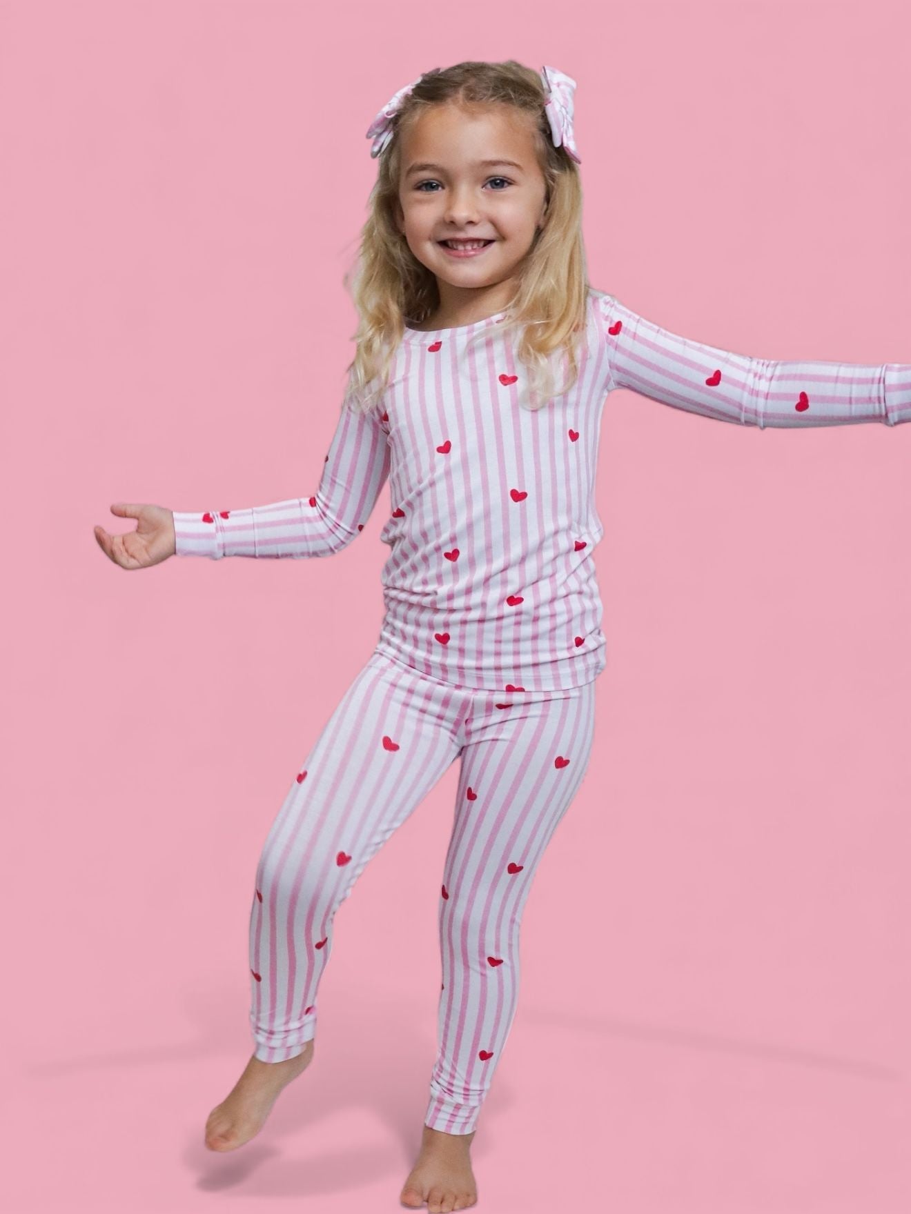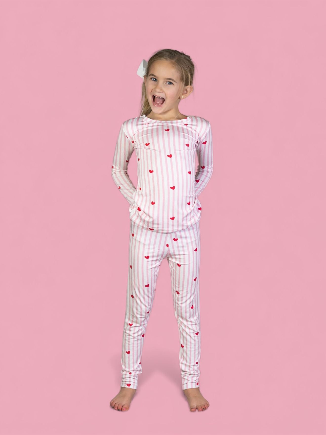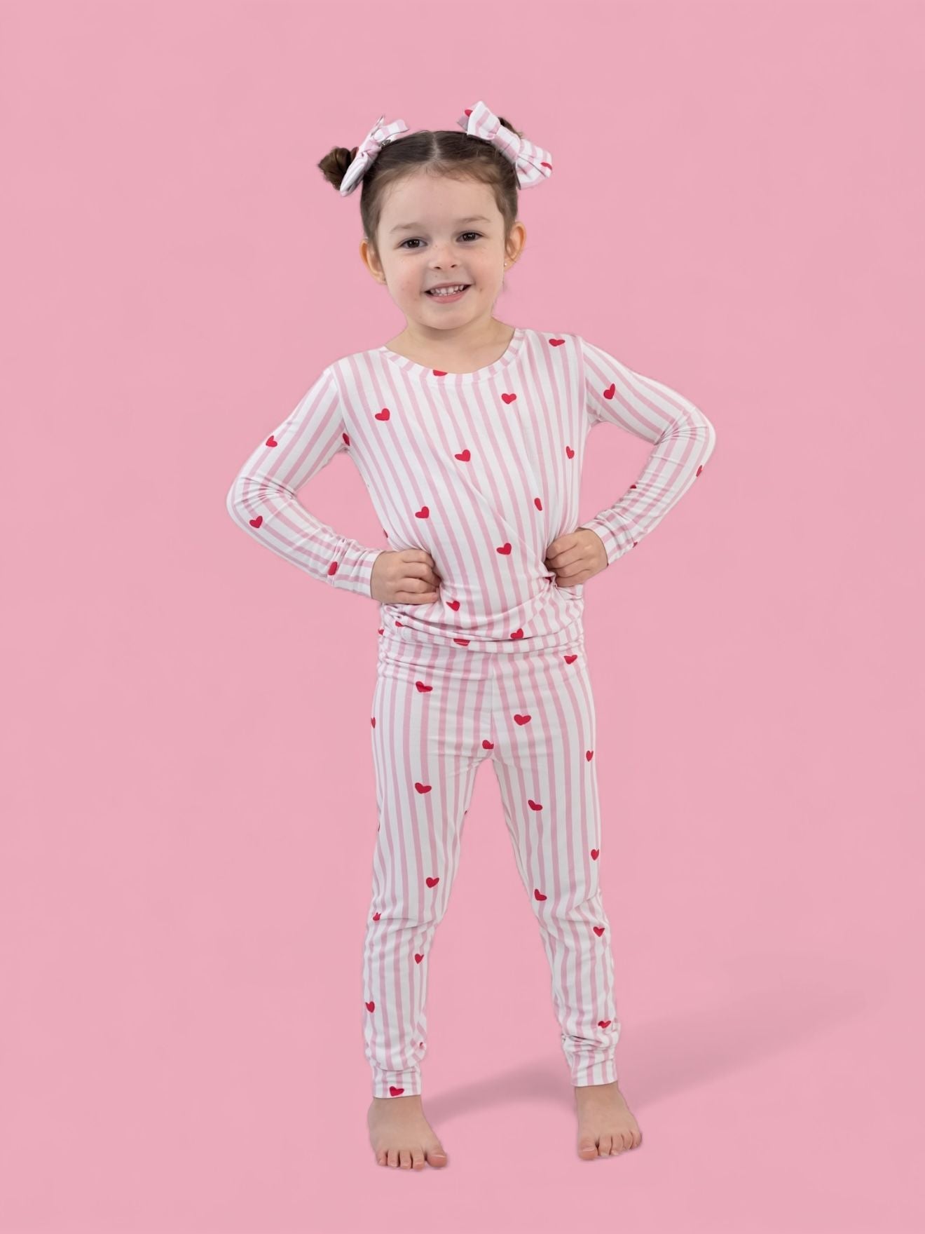 Sweet stripes, tiny hearts, endless comfort! The Sweetheart Stripes Dream Set features a long sleeve top and matching pants in playful pink-and-white stripes sprinkled with bright little hearts. Crafted from our signature buttery-soft bamboo fabric, this set is breathable, stretchy, and perfect for snuggles, playtime, or drifting into sweet dreams.