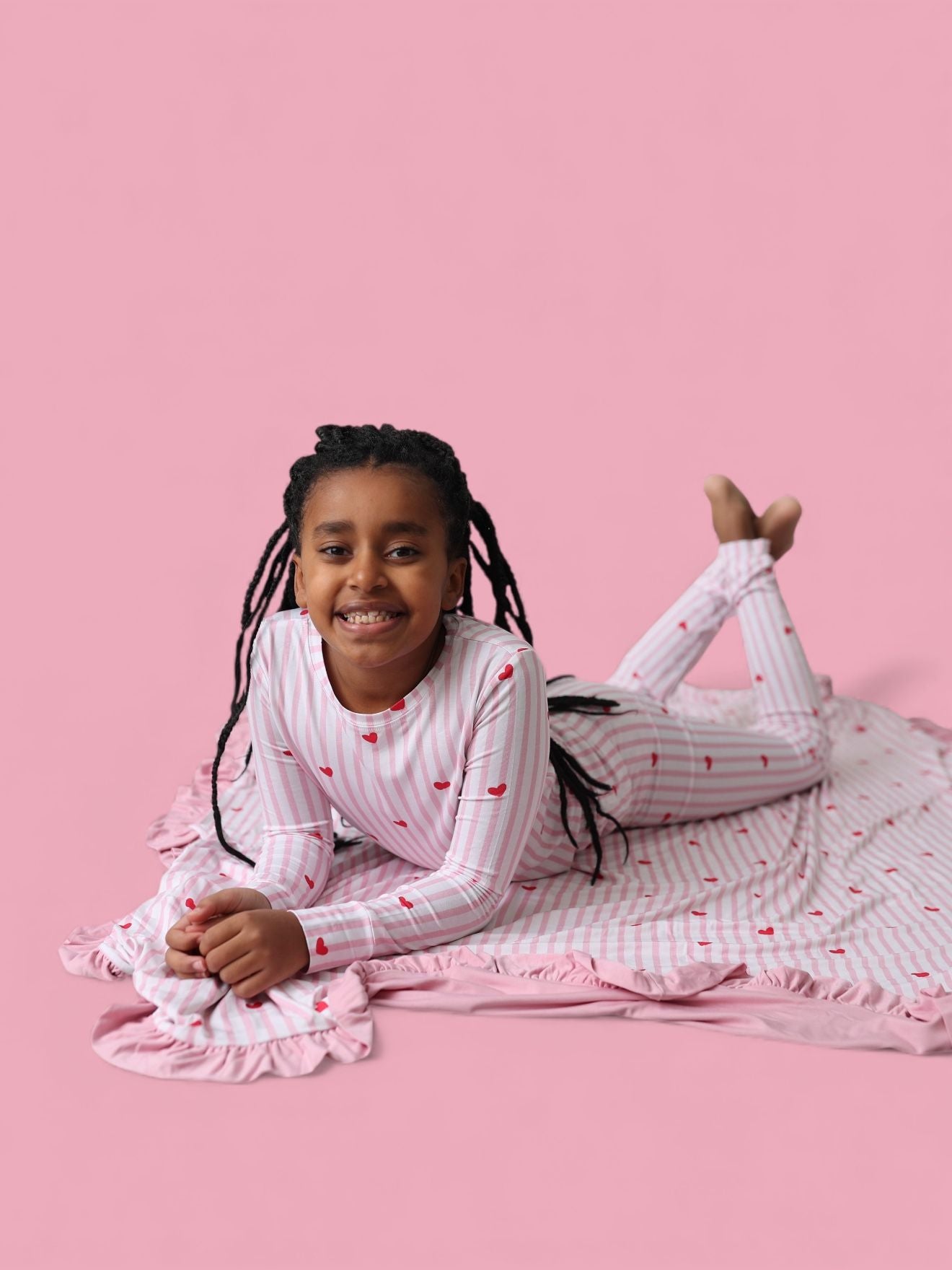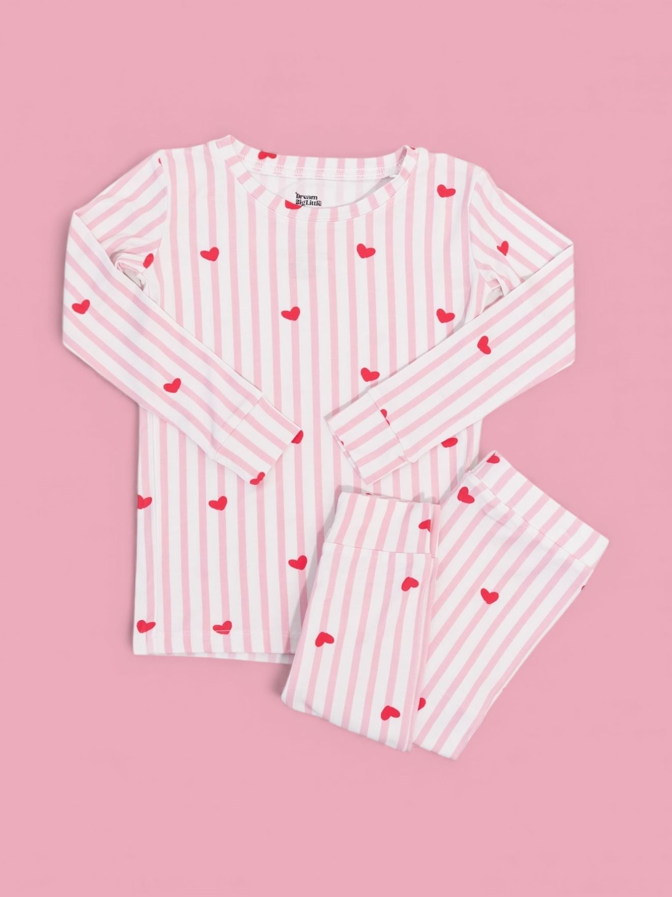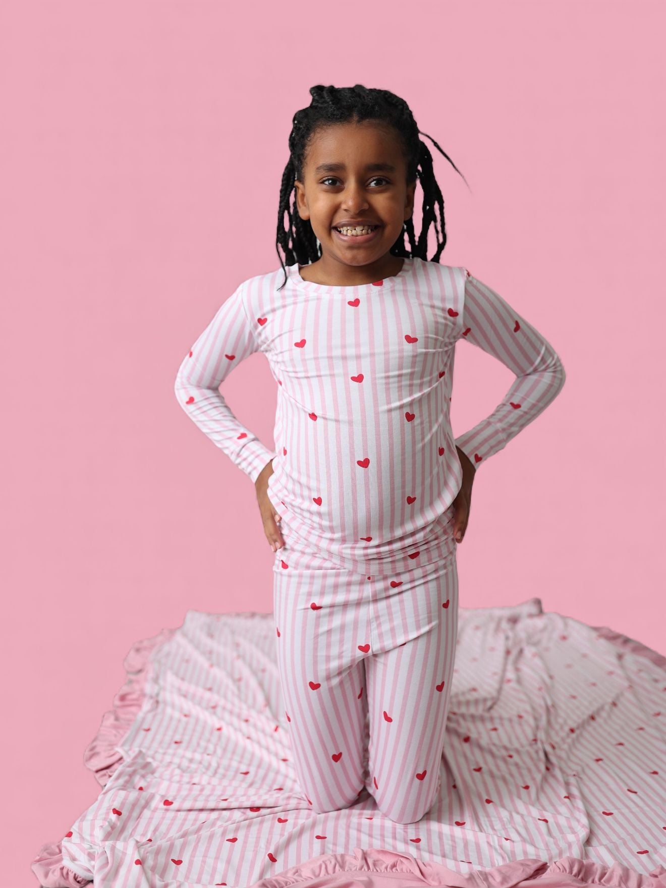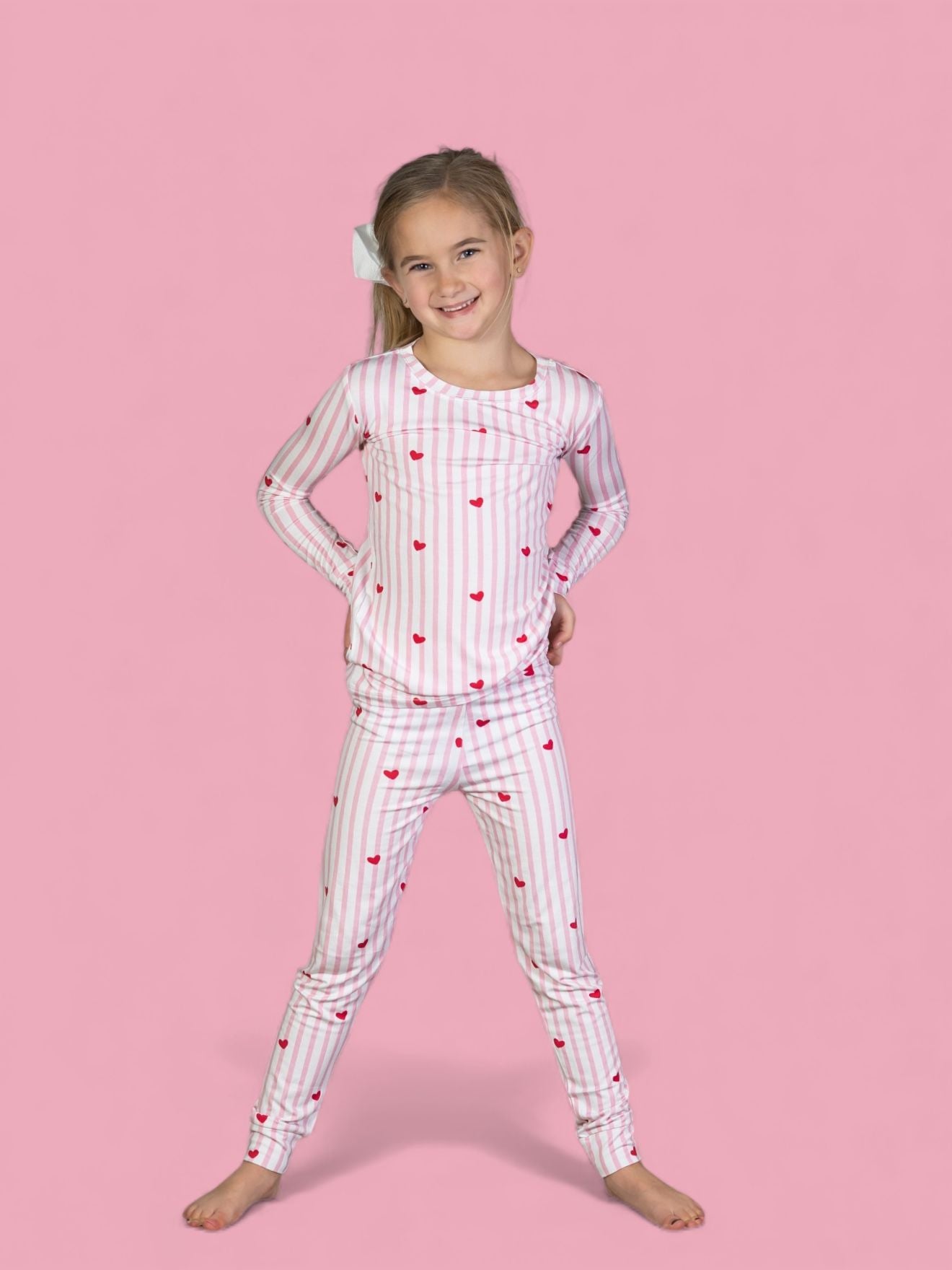 Sweet stripes, tiny hearts, endless comfort! The Sweetheart Stripes Dream Set features a long sleeve top and matching pants in playful pink-and-white stripes sprinkled with bright little hearts. Crafted from our signature buttery-soft bamboo fabric, this set is breathable, stretchy, and perfect for snuggles, playtime, or drifting into sweet dreams.