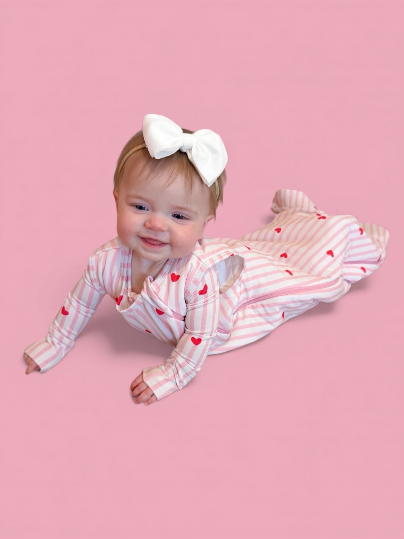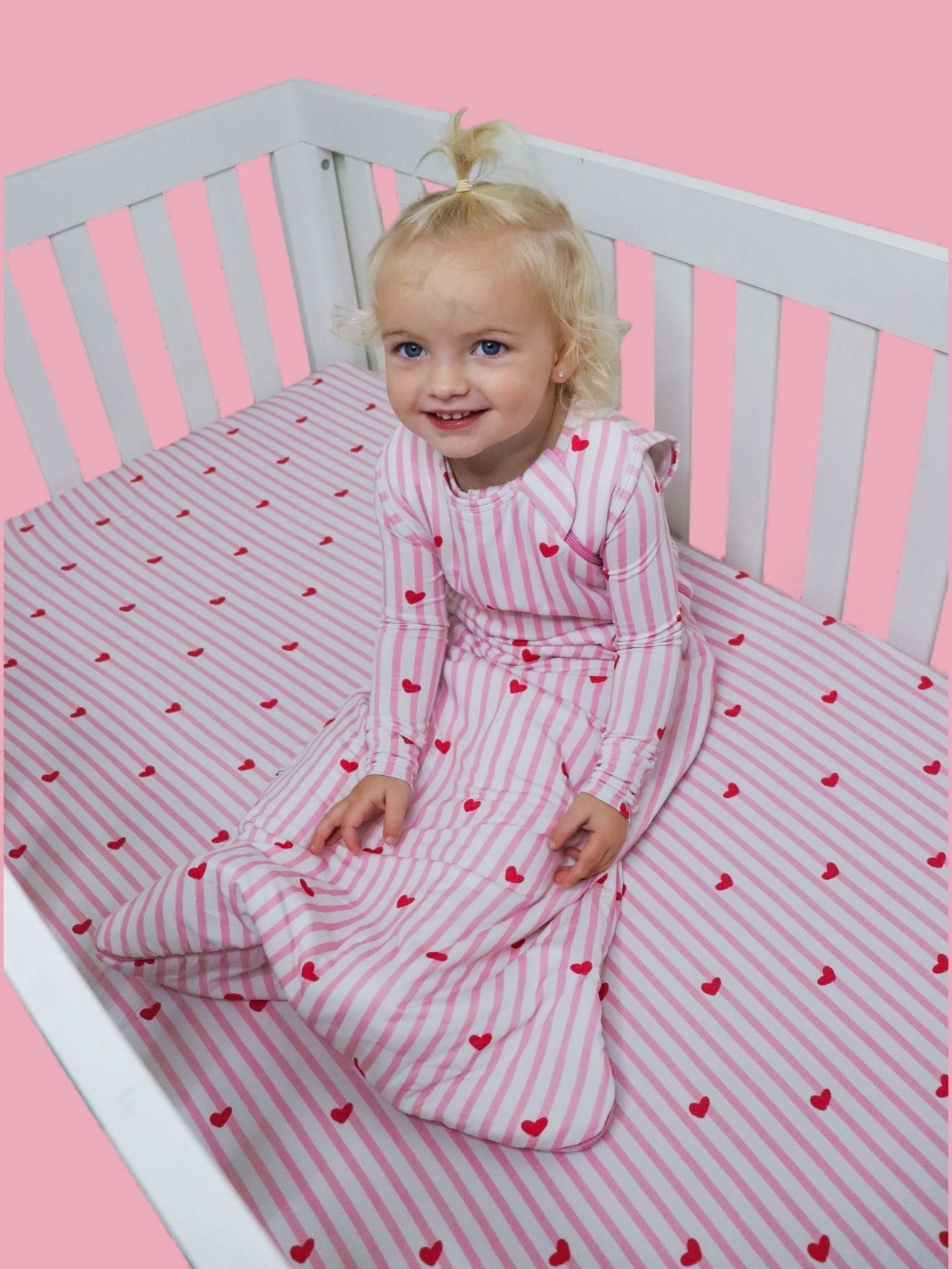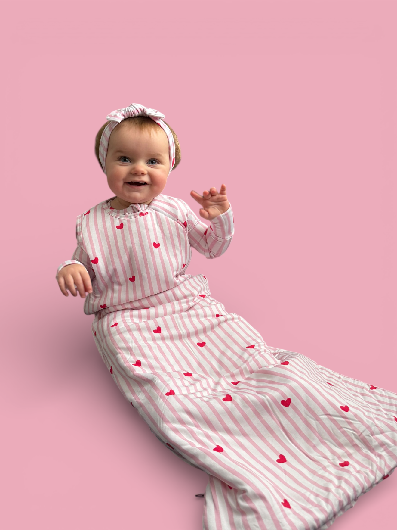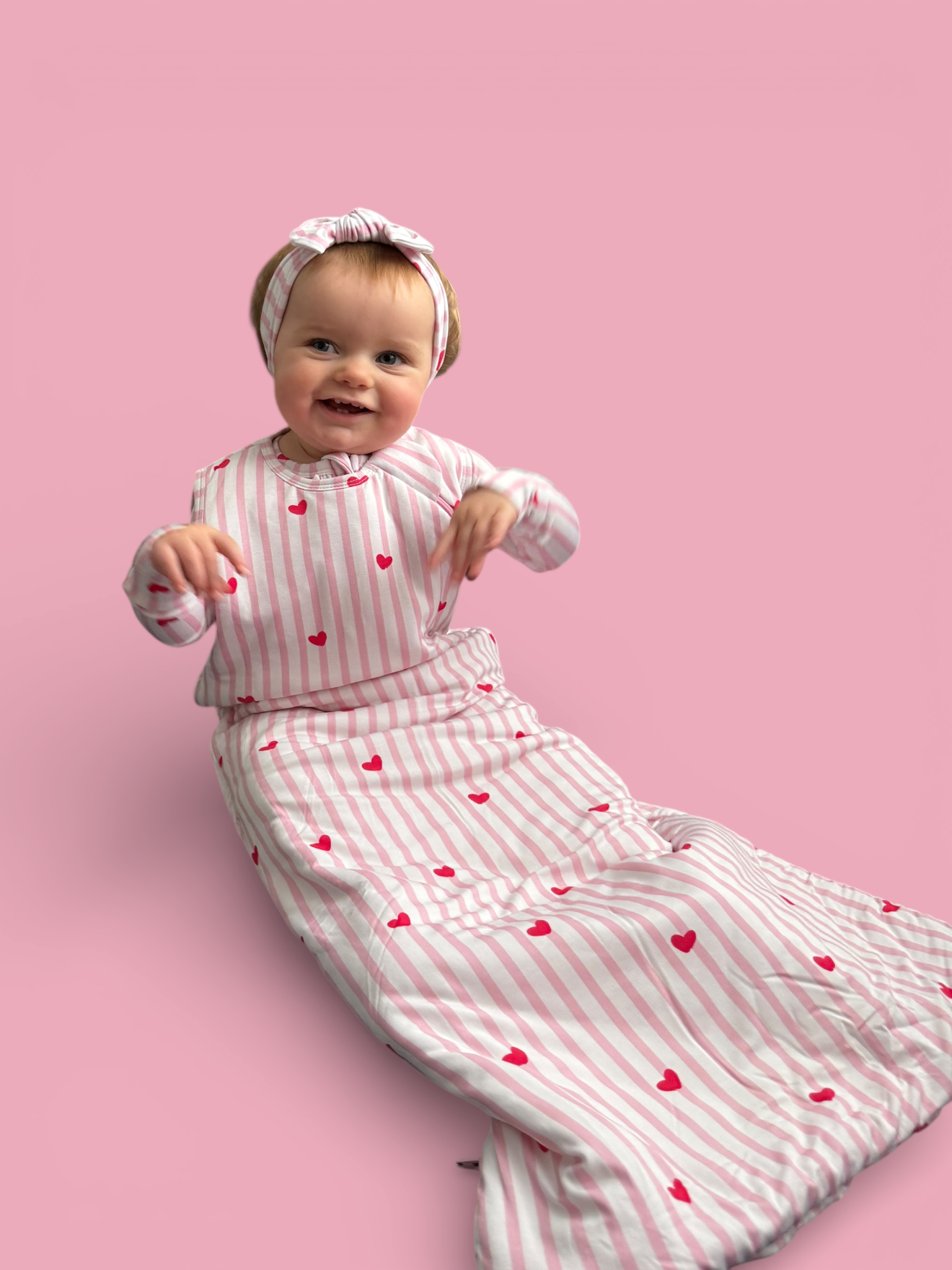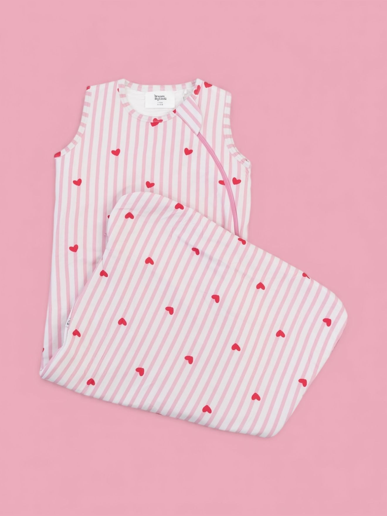 Soothe your little one into the sweetest dreams! The Sweetheart Stripes Dream Sleep Sack is crafted from our signature buttery-soft bamboo fabric and features playful pink-and-white stripes sprinkled with dainty hearts. Designed with a two-way zipper for easy changes and a sleeveless cut for safe, comfy sleep, it’s the perfect blend of practicality and charm.