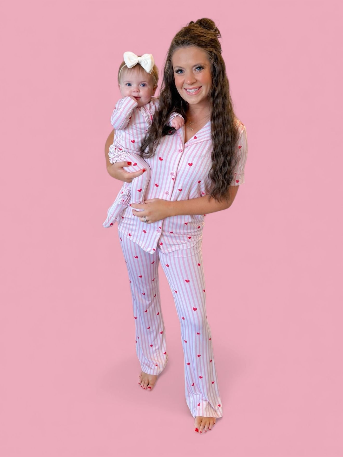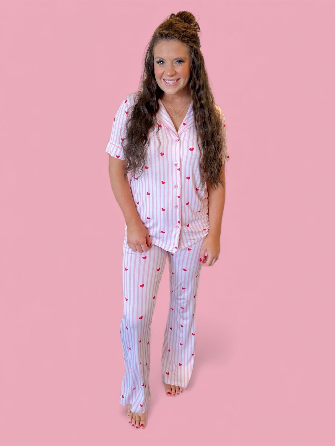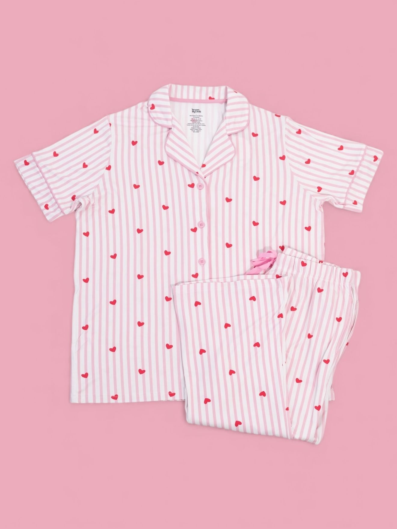 Fall in love with your new favorite lounge look! The Sweetheart Stripes Women’s Dream Flare Set features a classic short-sleeve, button-up top and flowy flare pants in our playful pink-and-white stripes sprinkled with tiny hearts. Crafted from our signature buttery-soft bamboo fabric, this set delivers breathable, all-day comfort with a flattering fit you’ll never want to take off.